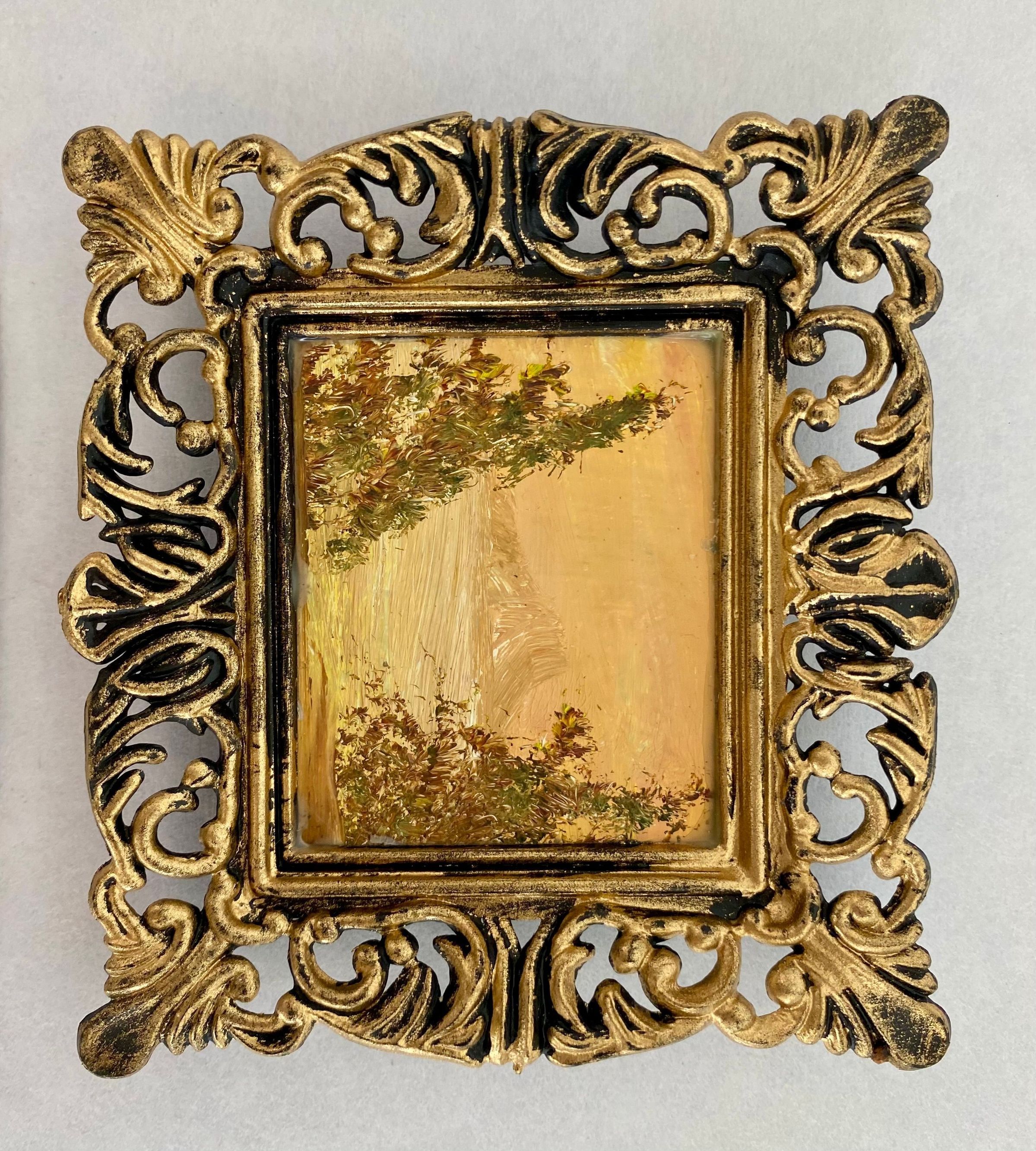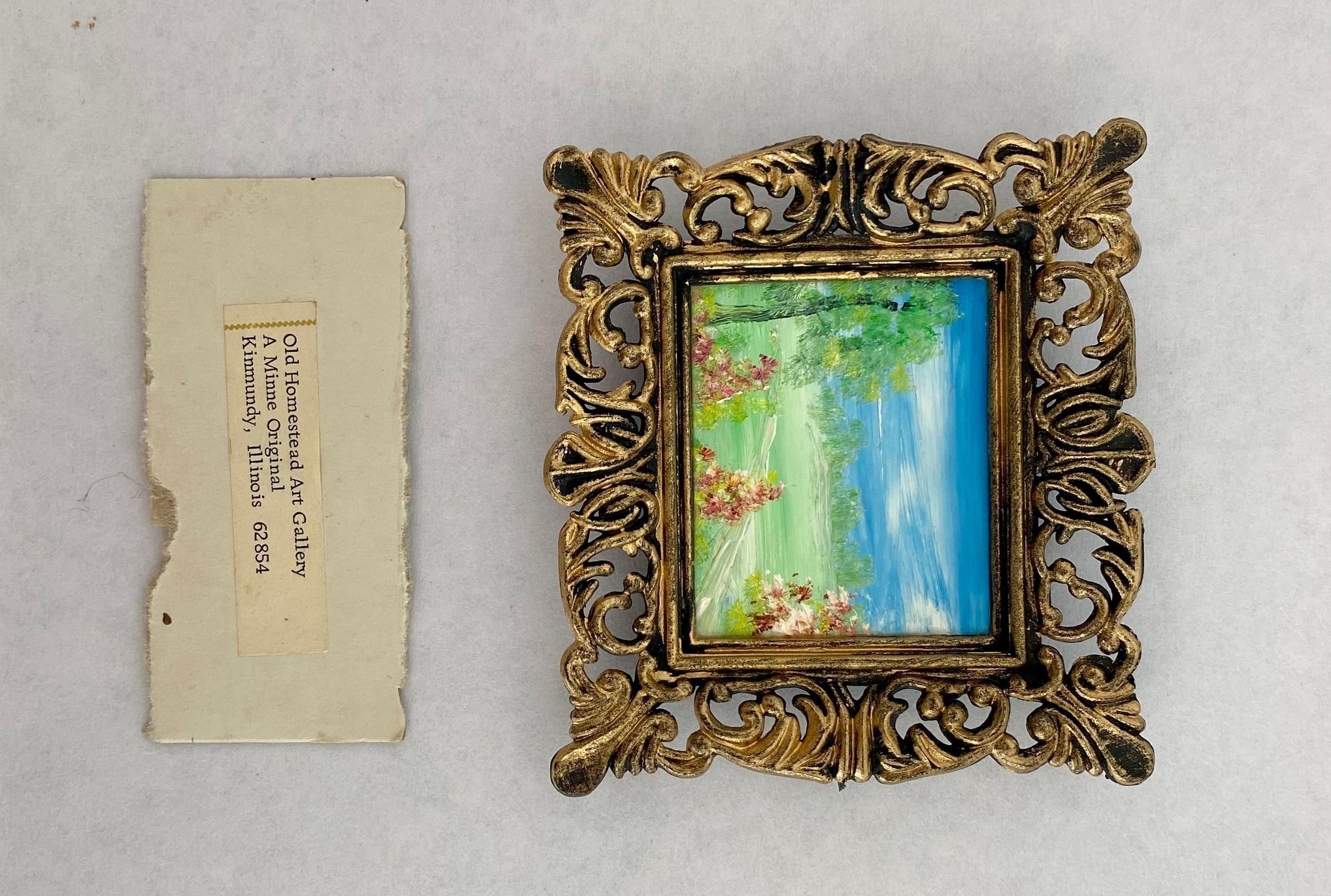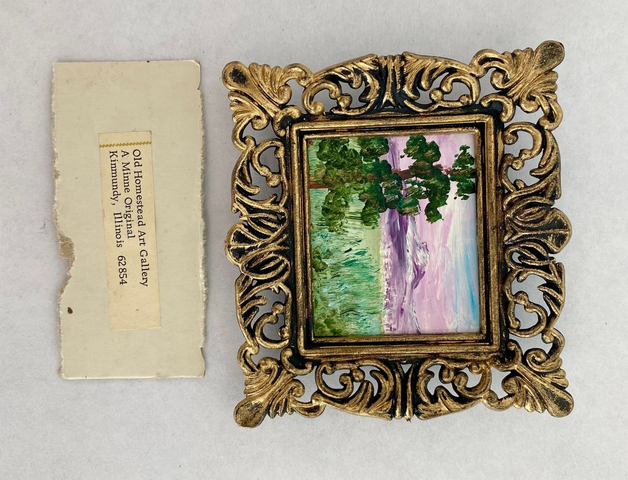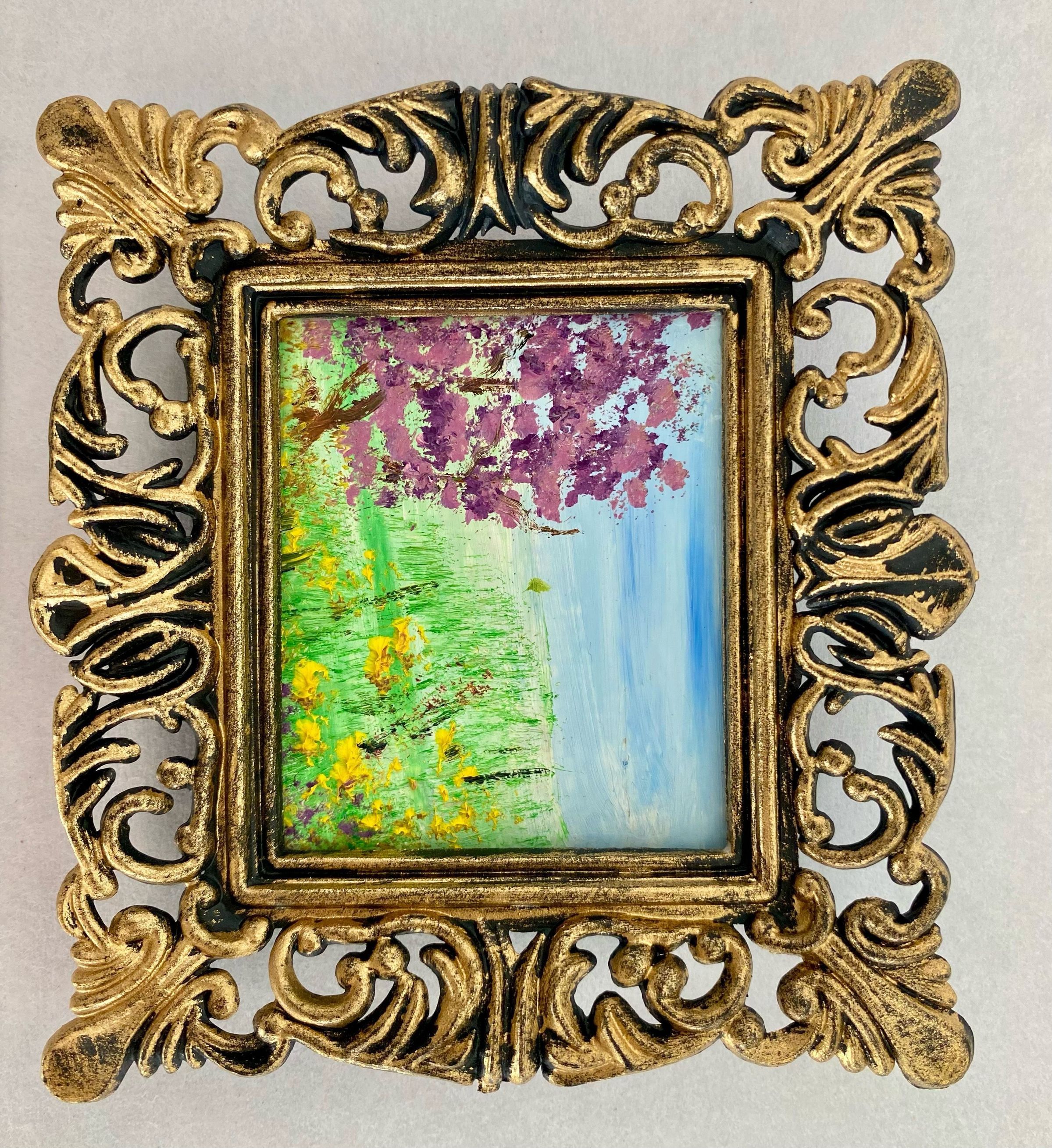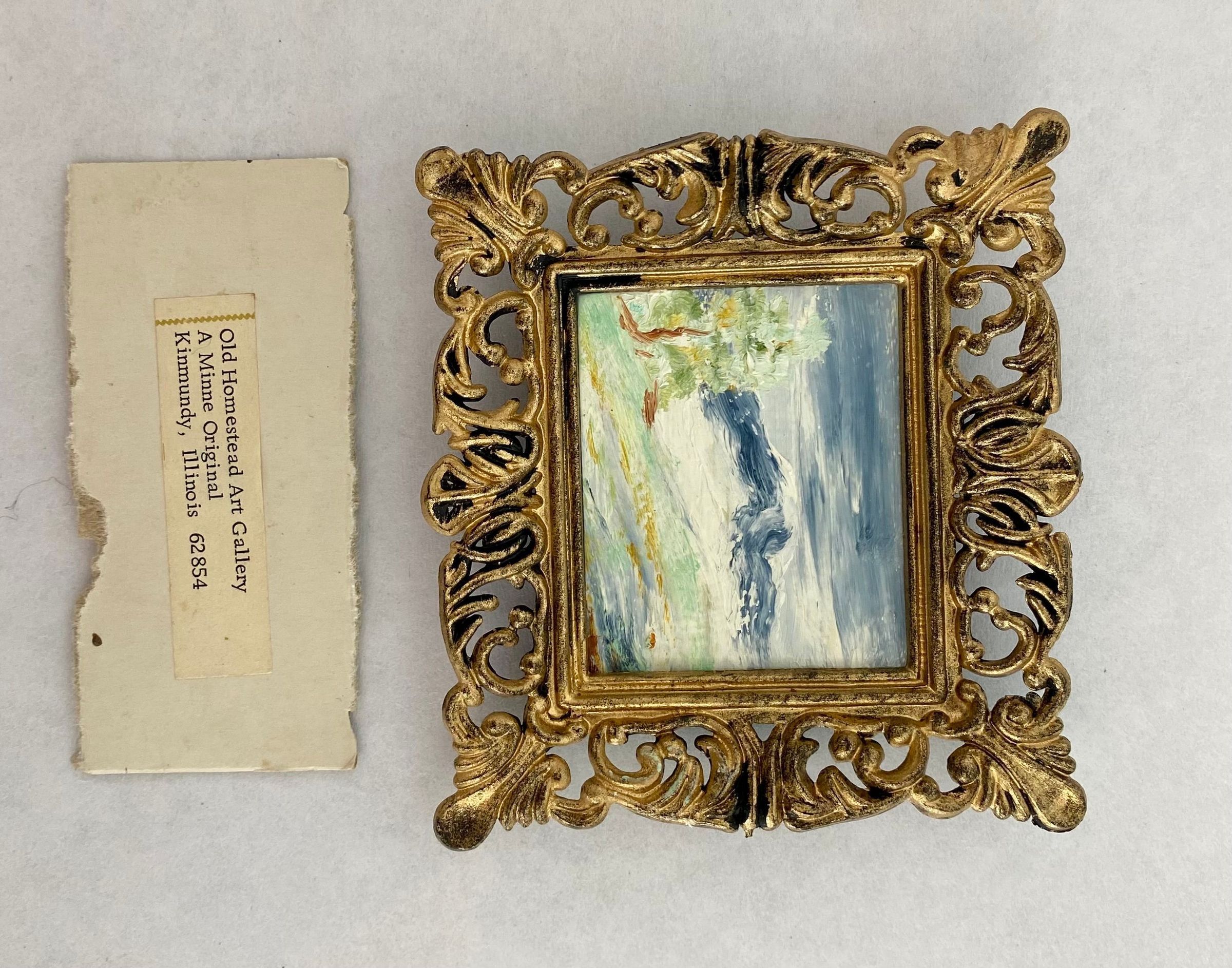 Eight tiny landscapes paintings depicting the four season; Framed in ornate gold plastic with black backing.Collection