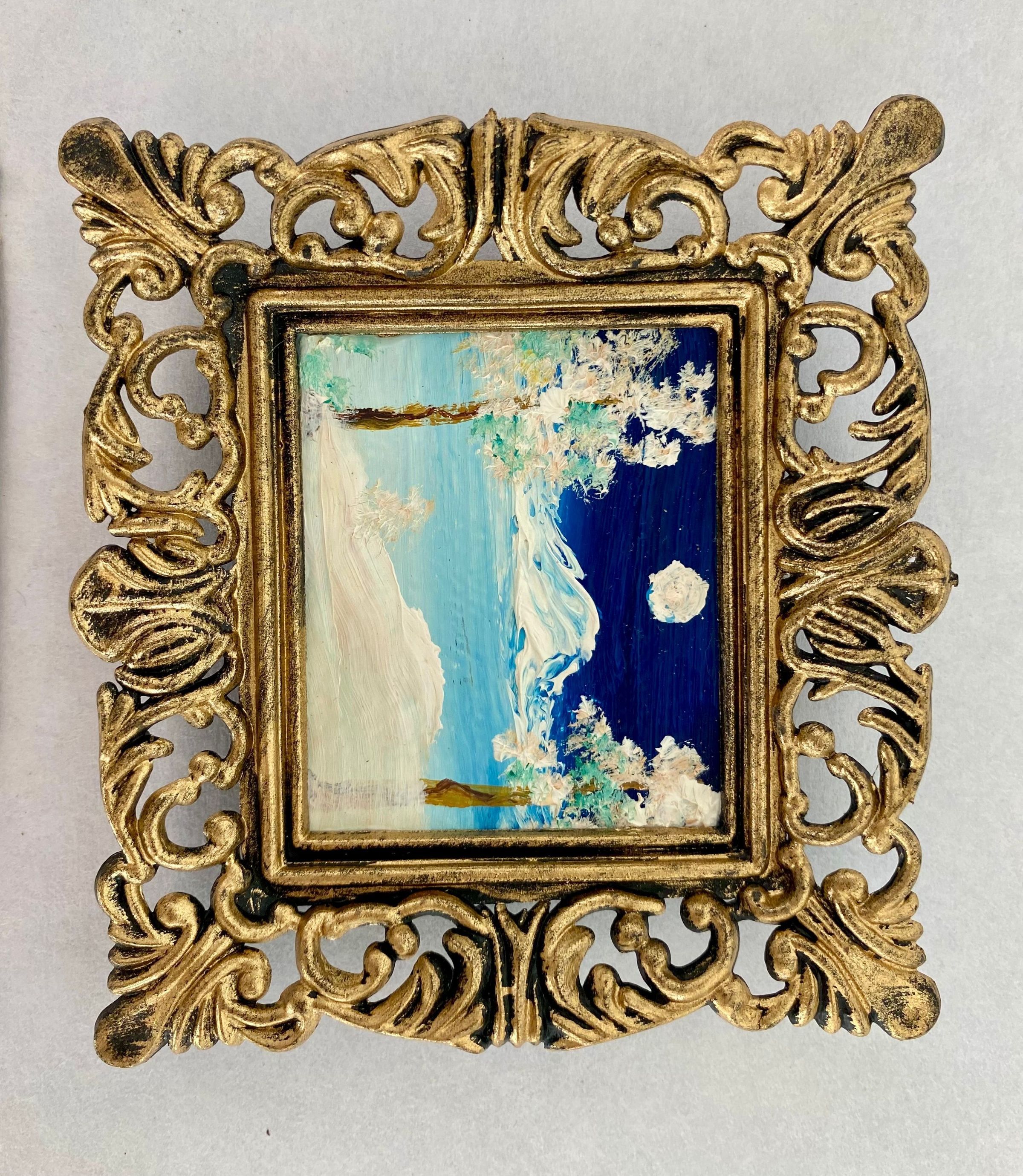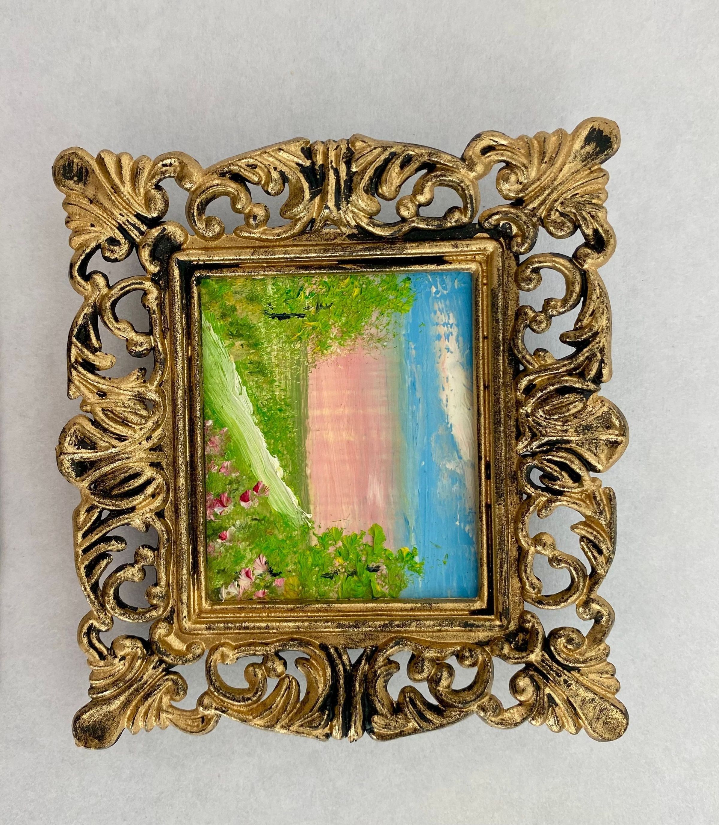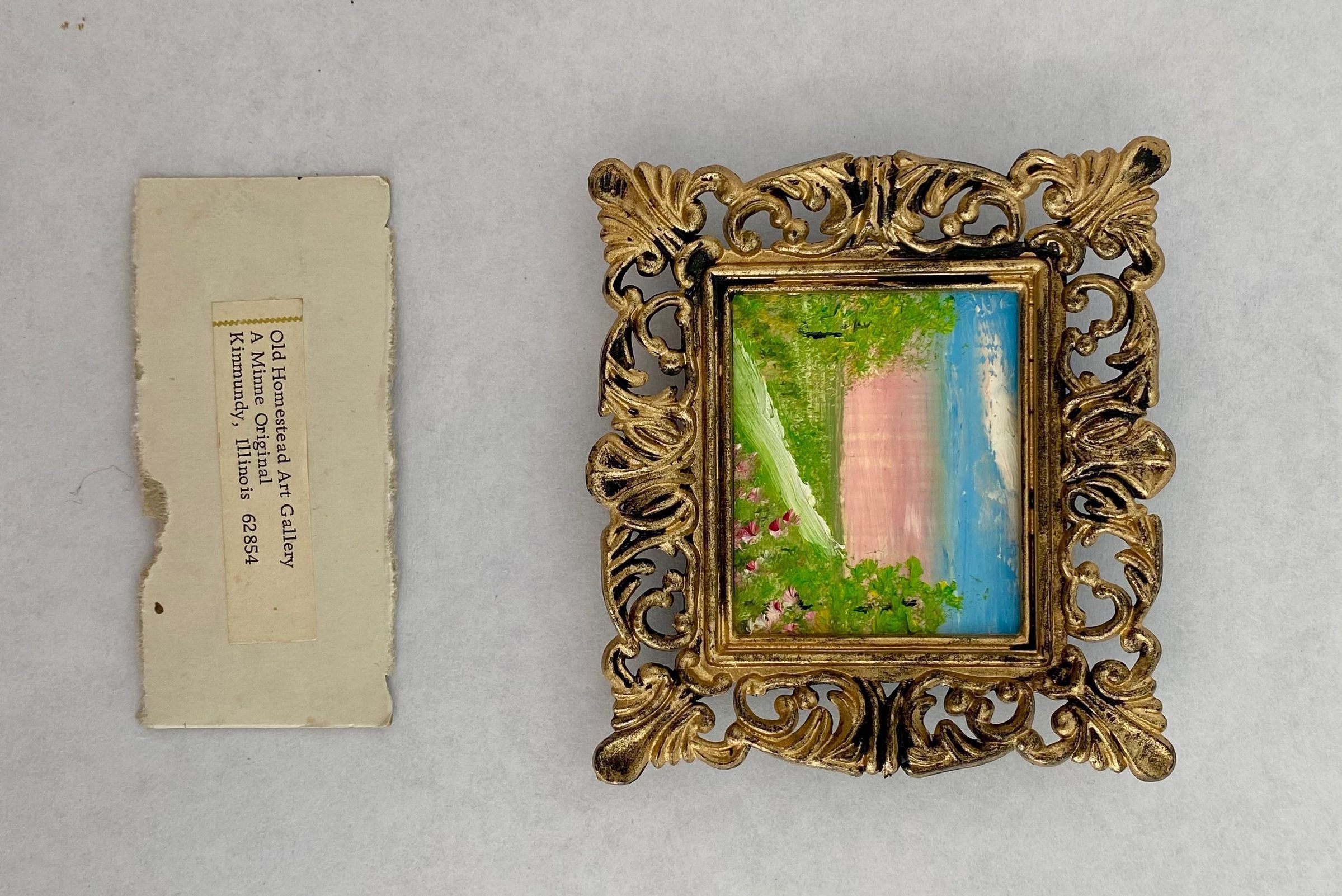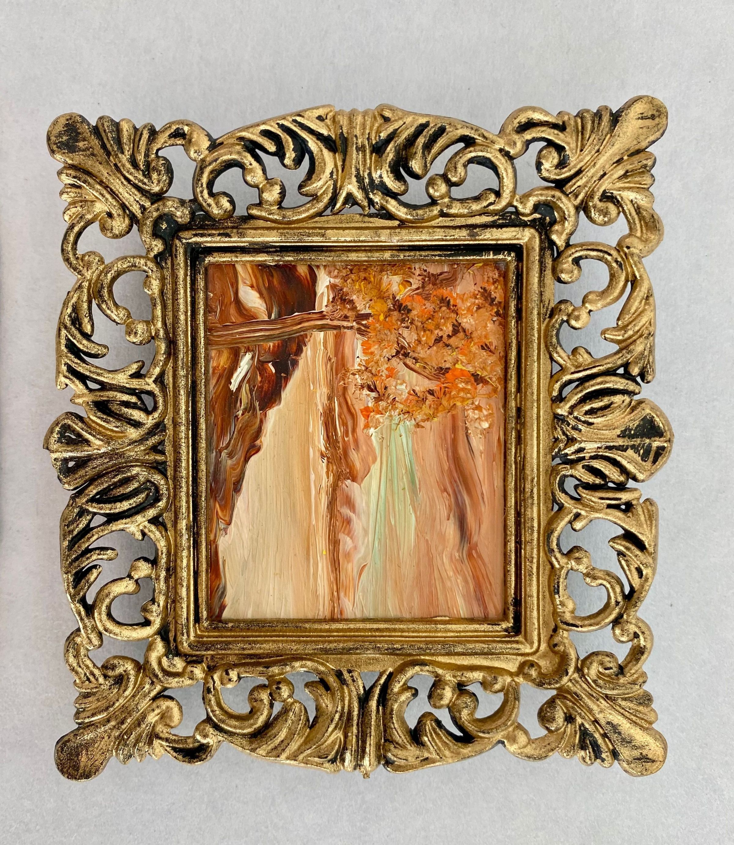 Eight tiny landscapes paintings depicting the four season; Framed in ornate gold plastic with black backing.Collection