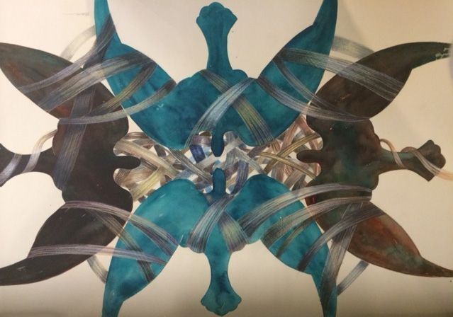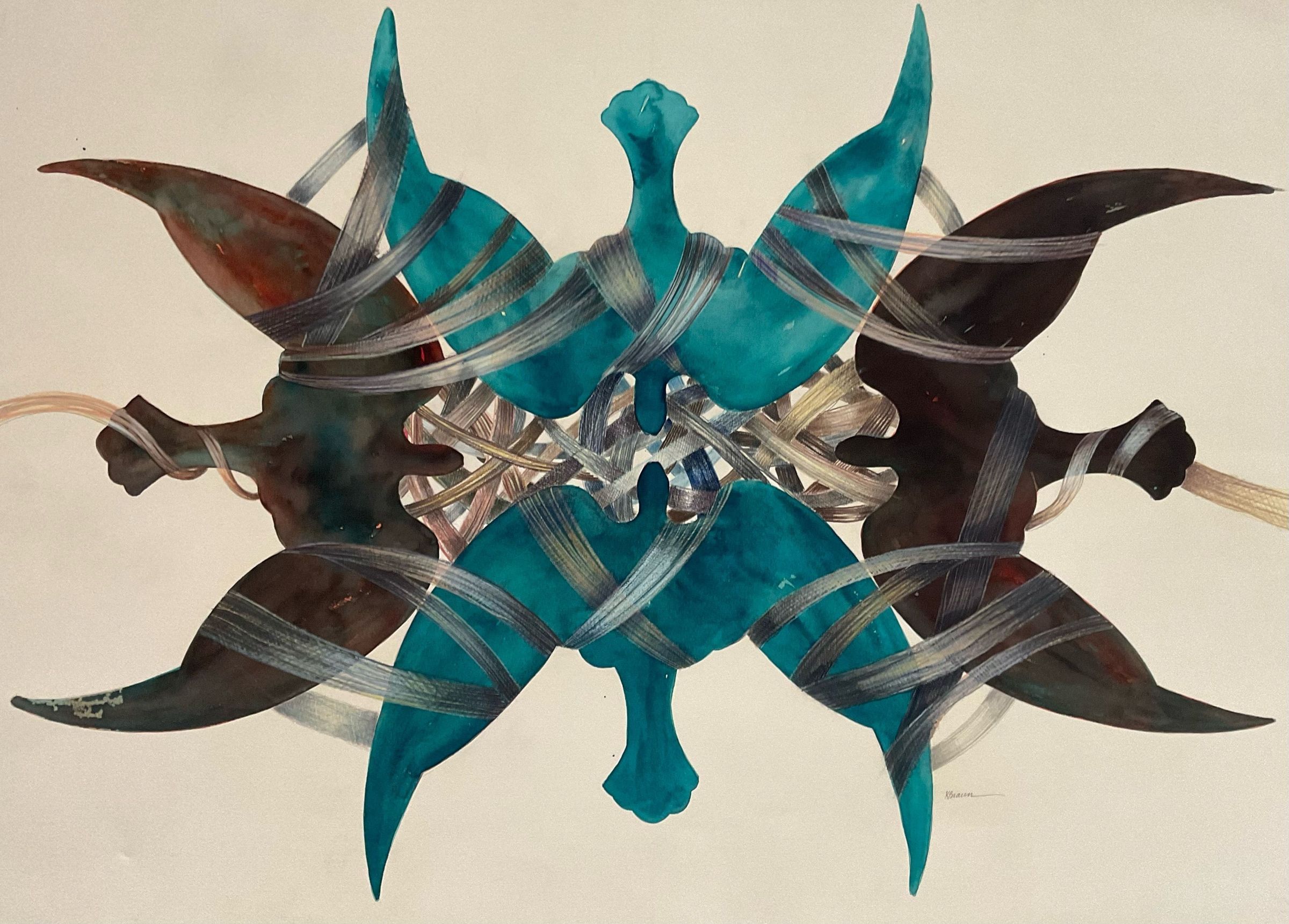 4 bird like figures, 2 in blue, 2 in rust tones combined with color penciled ribbon-type shapes intertwining the 4 birds. Off-white paper, silver toned frame, glass covering. Signed by artist lower right.Collection