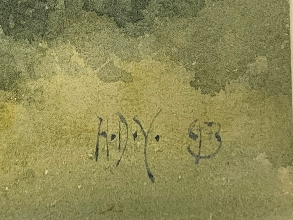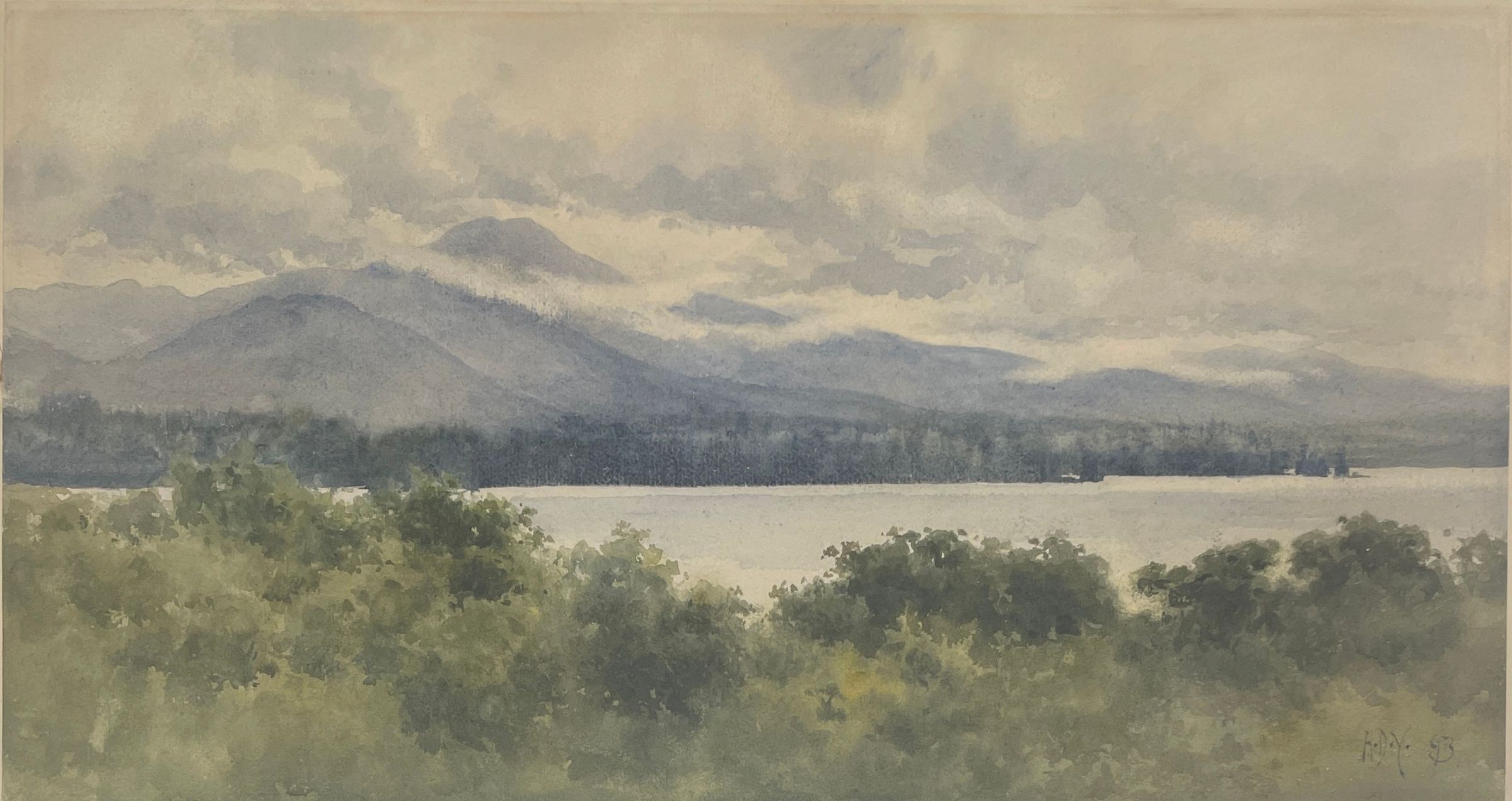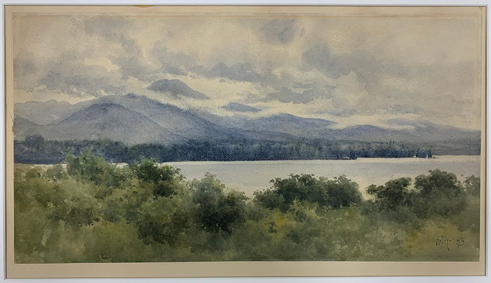 Green shrub foreground, blue lake, mountains and sky; signed with initials and year lower right. Lawson was EIU Dean of Women 1939-1966. Off-white paper and mat, gold toned wood frame, glass covering.Collection