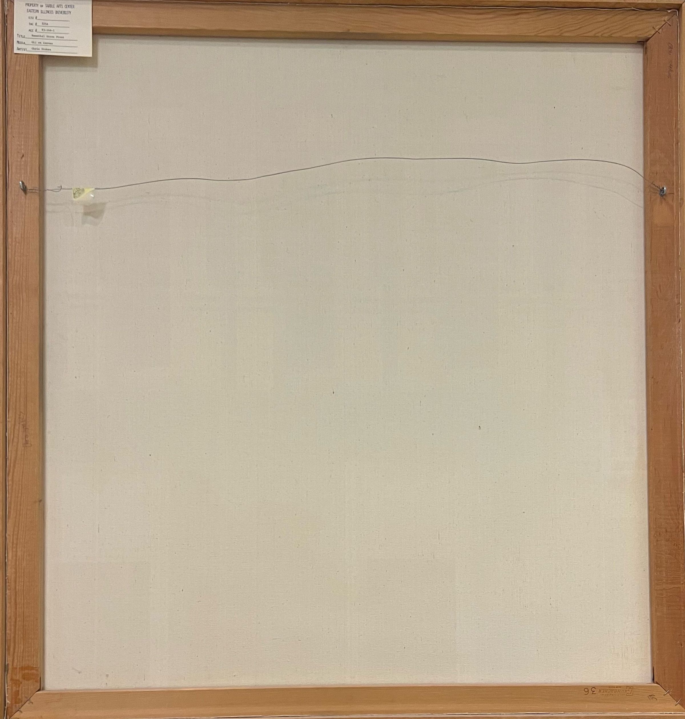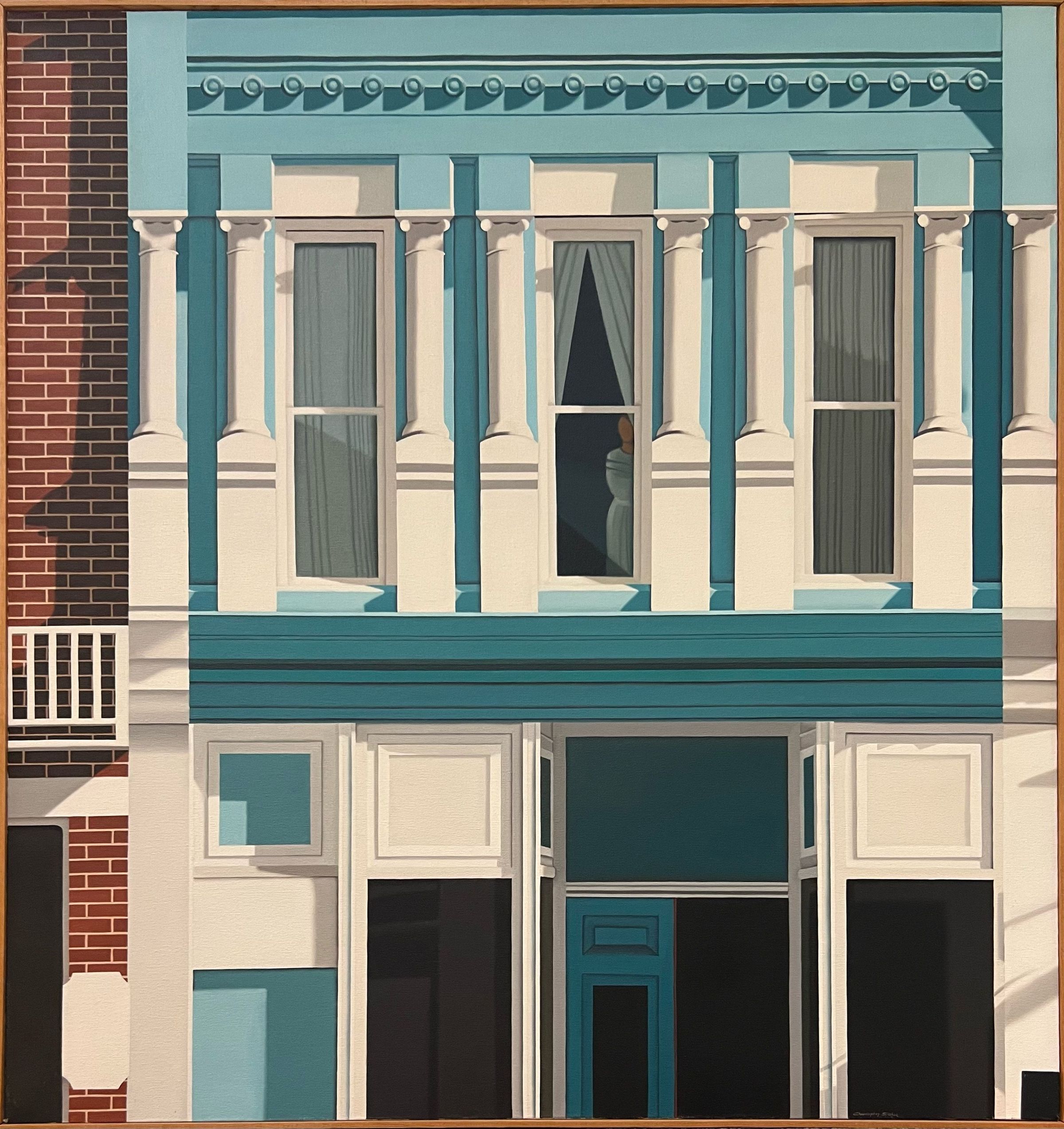 Apartment building in blues, greys, black, some red brick very cleanly done Lines are sharp. Unfinished 1/4" pine edging for frame. Signed by artist.Acquisition