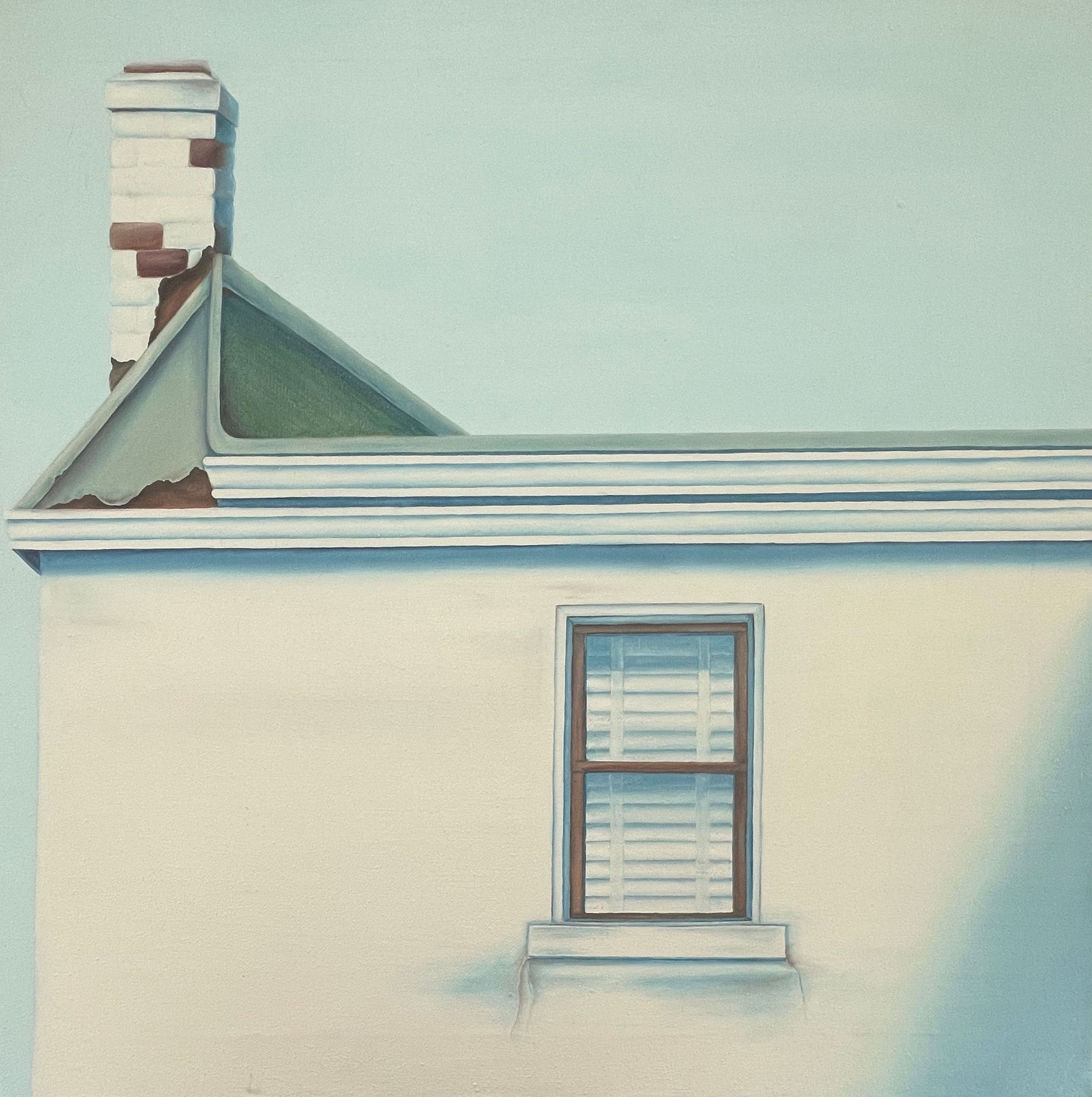 White house, blue sky and green roof. Chimney white with a few red bricks 3/4" frame is maple brown.Acquisition
