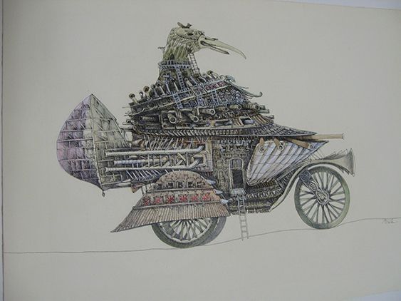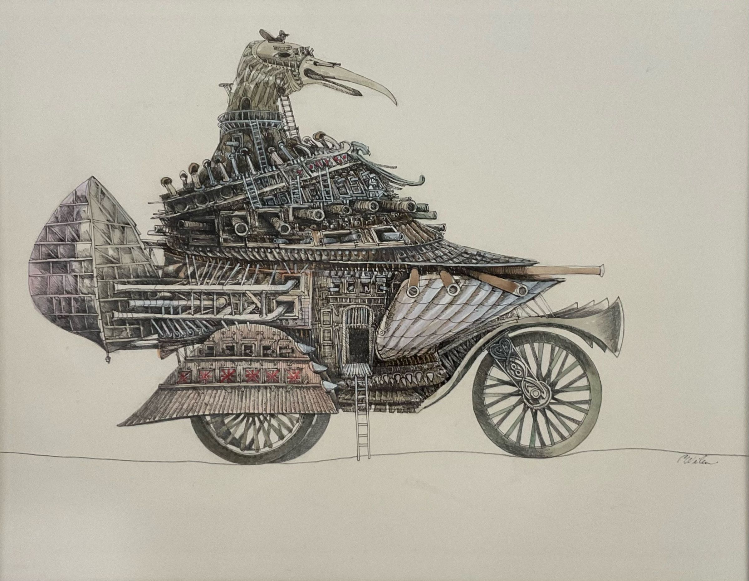 Mostly ink drawing highlighted with wash colors. Bird-like carvery intricately drawn. Looks like a British war type vehicle. Hawk on top, guns coming out nostrils. Black wood frame with gold highlights, white mat, glass covering.Artwork Details