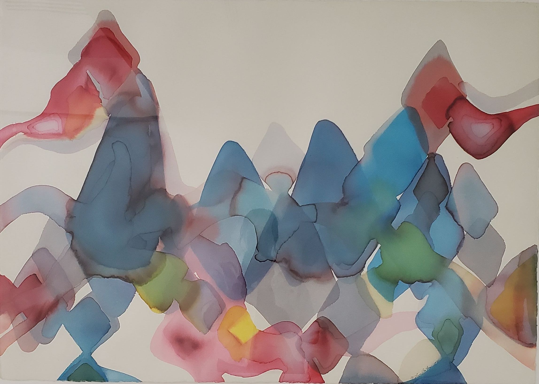 Abstract watercolor: transparent overlapping forms predominately blues, violets, red-violets. From the series Sacred Space. Signed lower right "Alice Baber 1981."Collection
