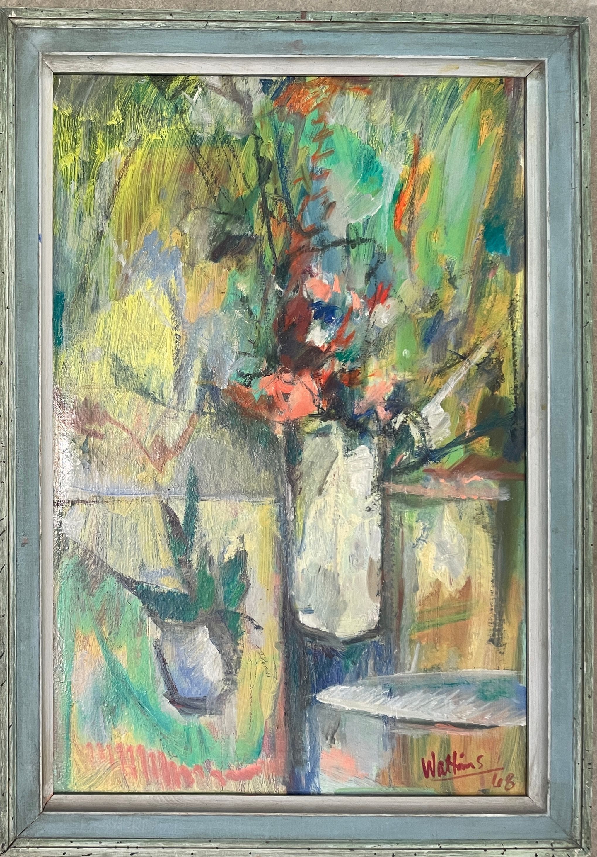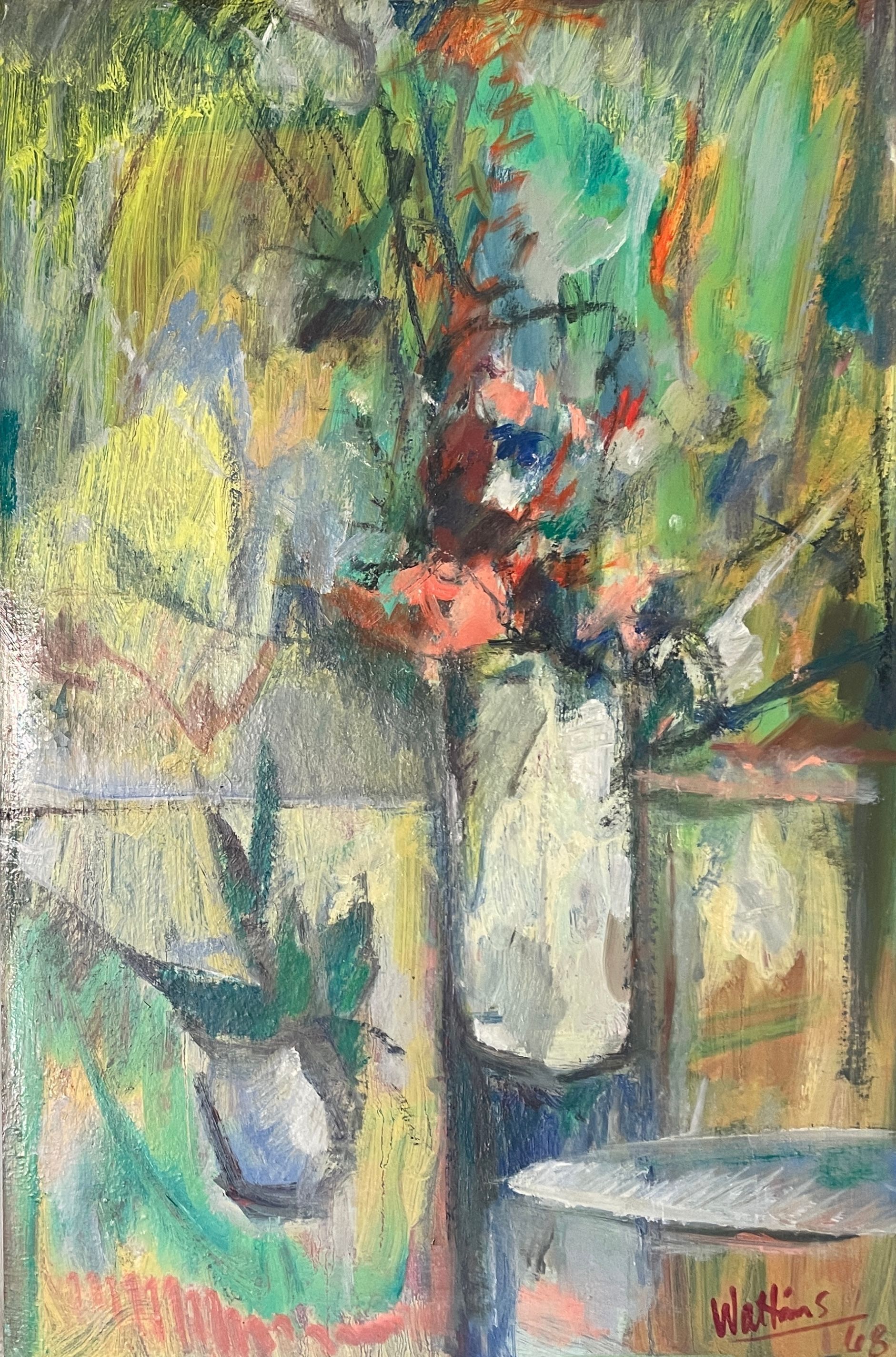 Two vases of flowers- mostly green, some yellow, orange, pink, and reds.Collection
