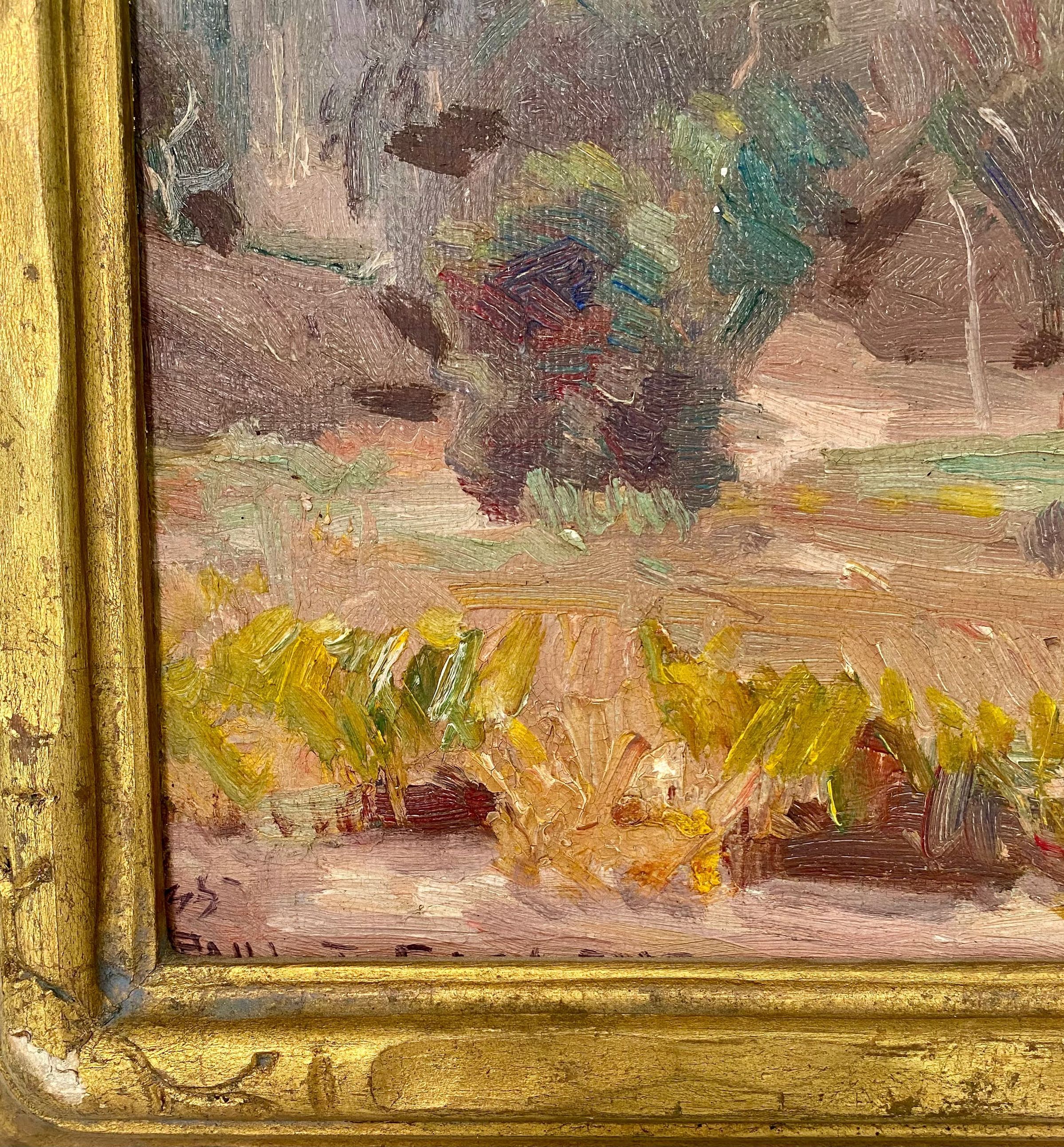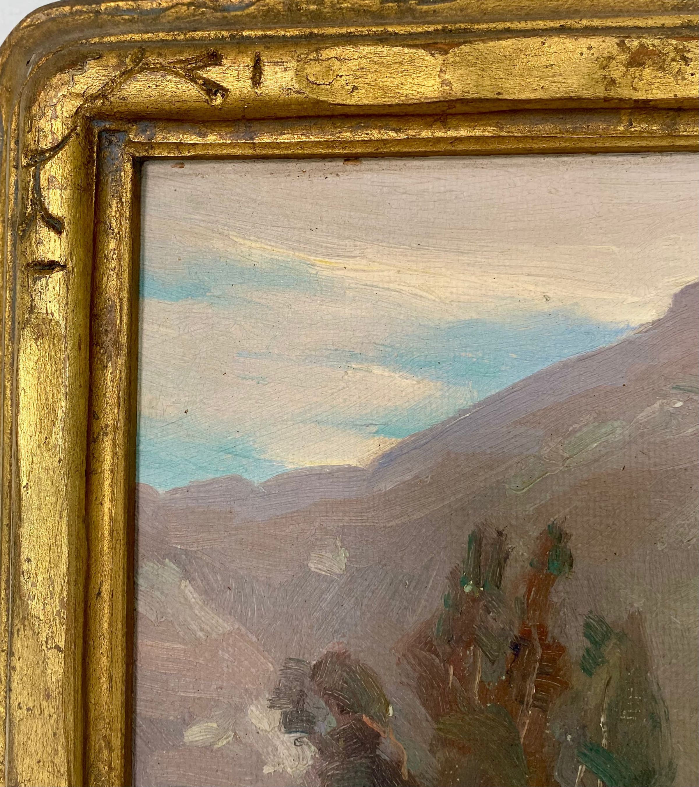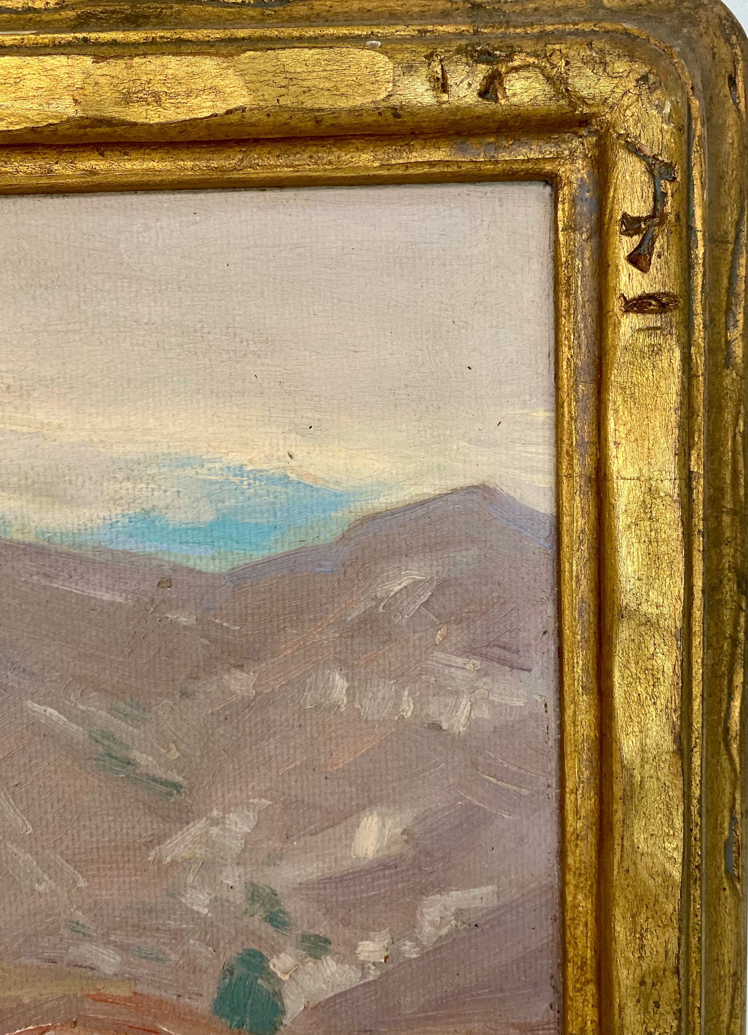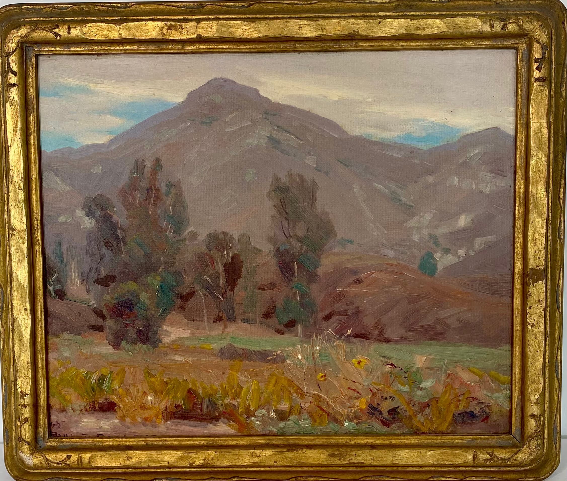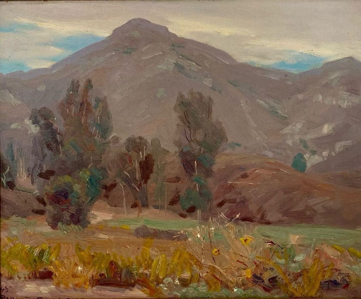 Low blue-purple mountain in background with grasses & flowers in foreground. Gilt frame.Title and gift information written on verso in pencil. Typed tag and written tag by William Mitchell on verson; written tag has includes circled number 34.Paul T. Sargent '35 lower left corner and on versoCollection