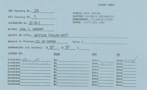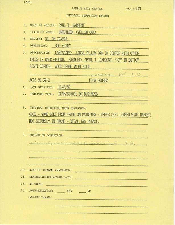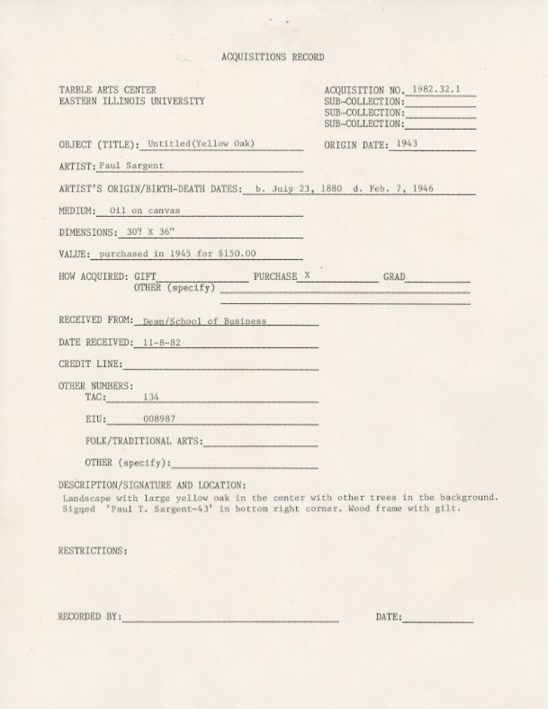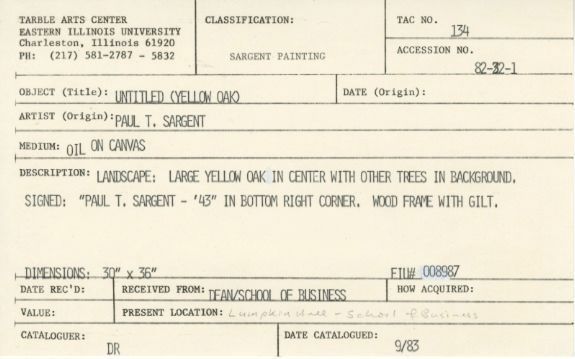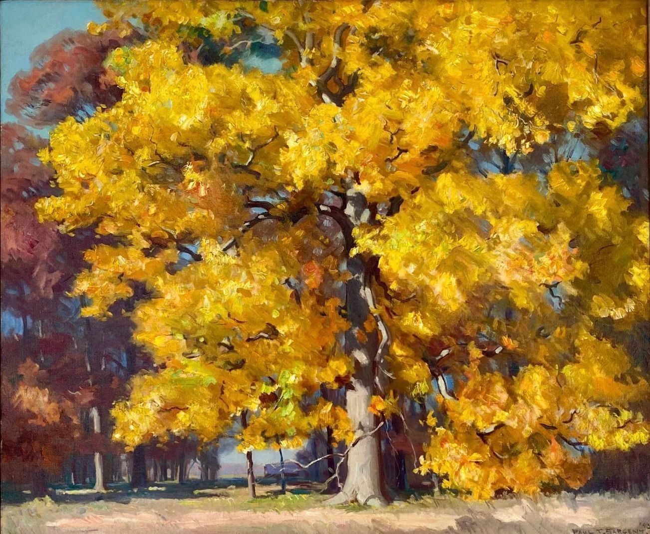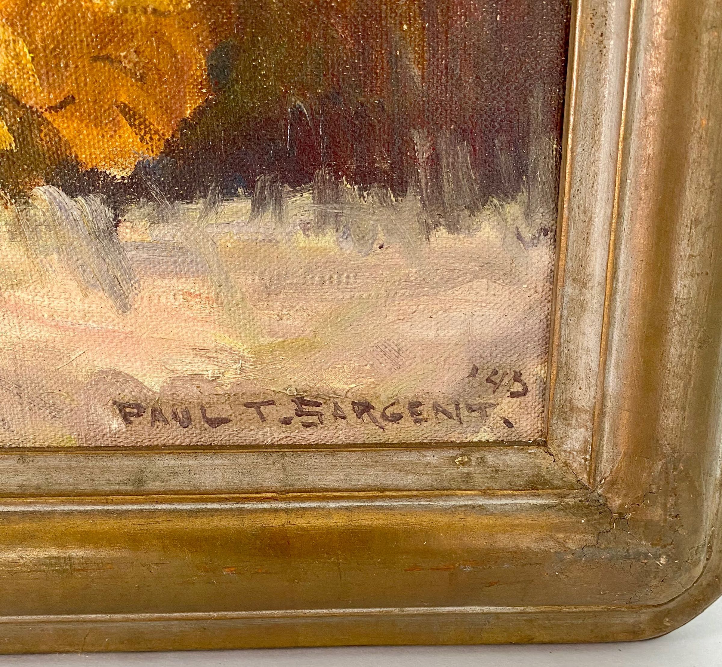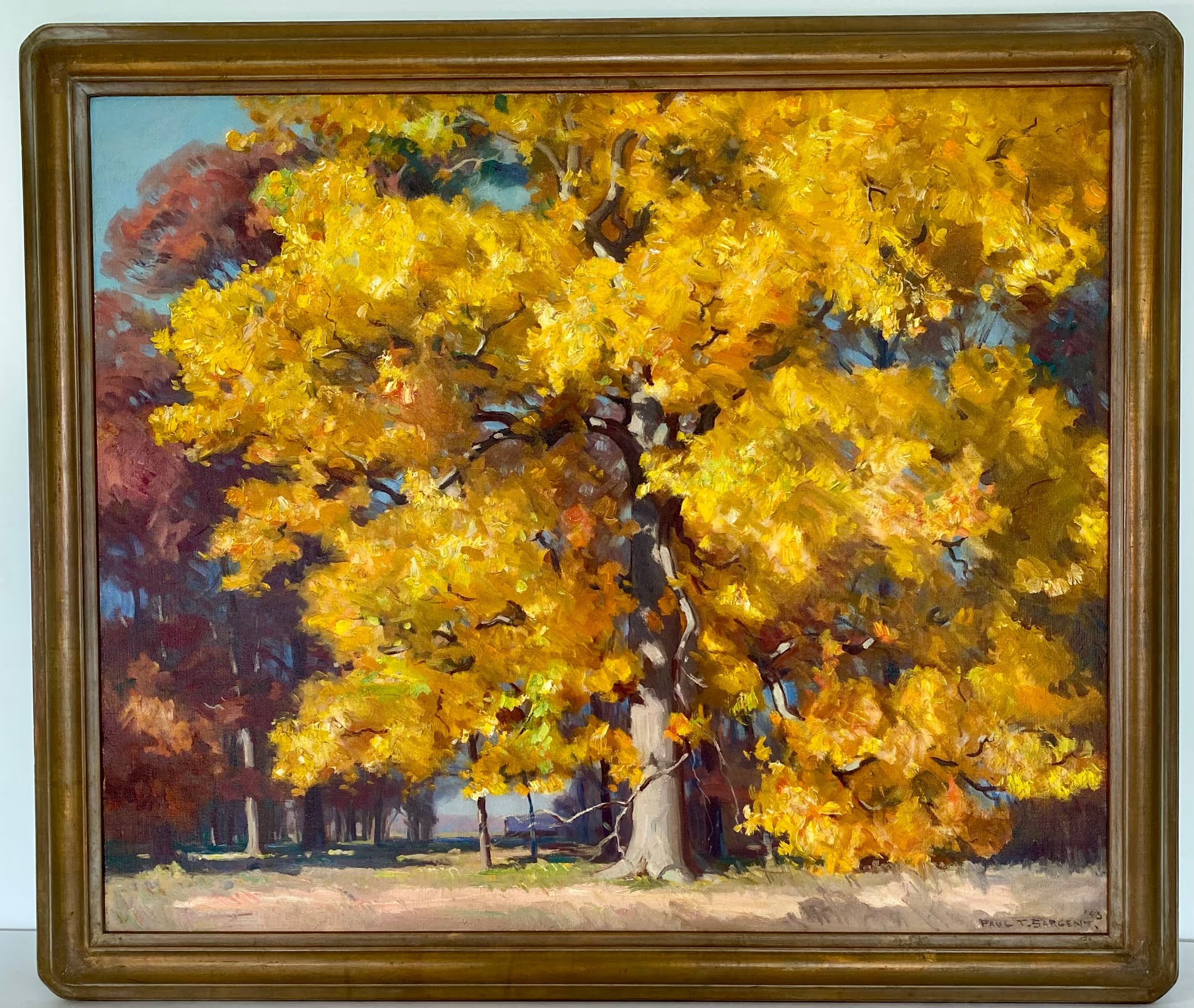 Landscape: large yellow oak in center with other trees in background. Signed: "Paul T. Sargent-'43" In bottom right corner wood frame with gilt.Collection