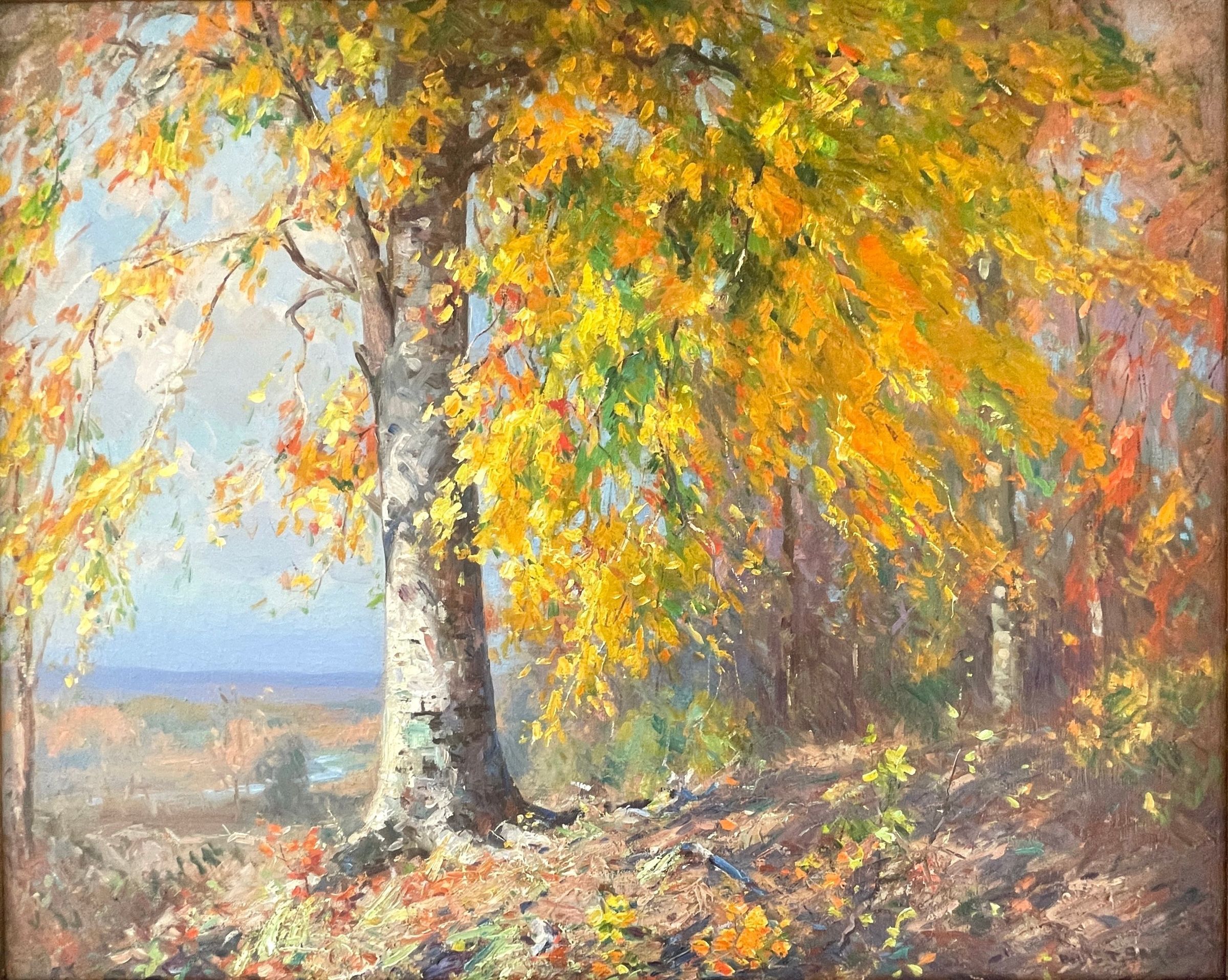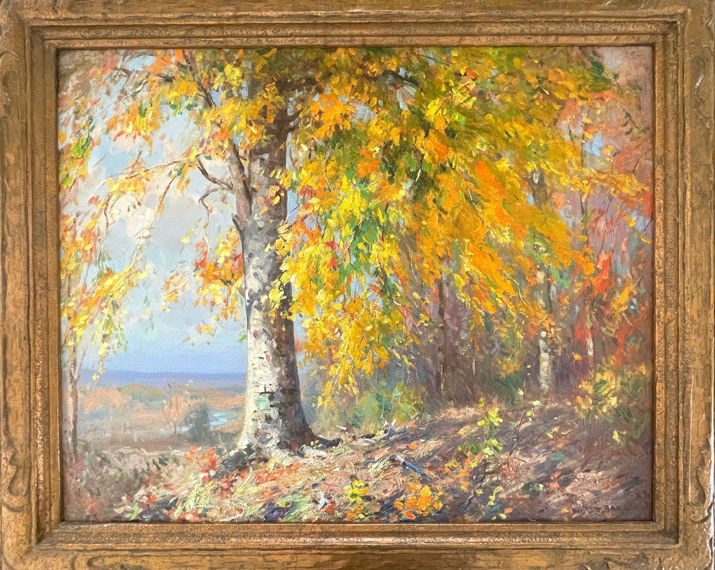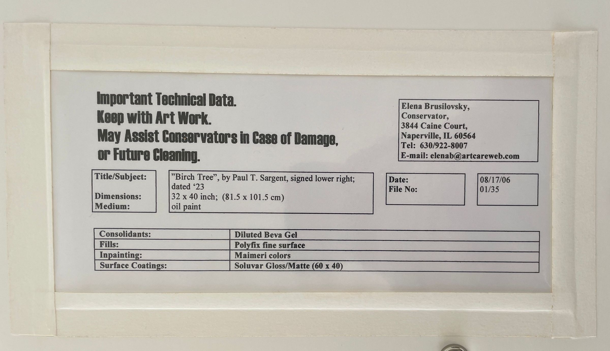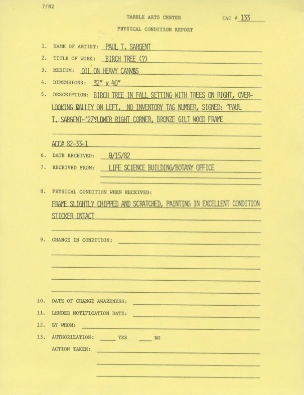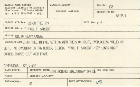 Birch tree in fall setting with trees on right- overlooking a valley on left. No inventory or tag number- signed: "Paul T.Sargent-'27" lower right corner- bronze gilt wood frame.Artwork Details