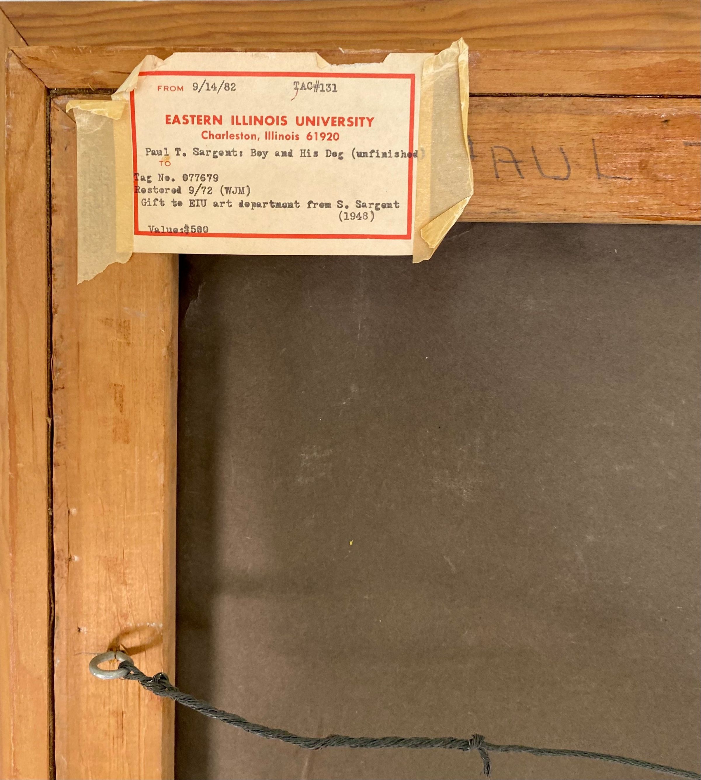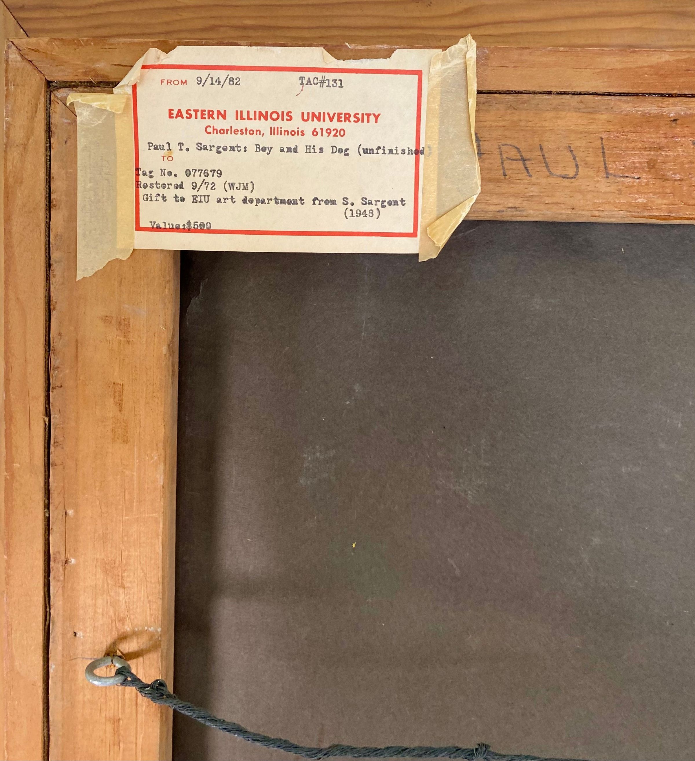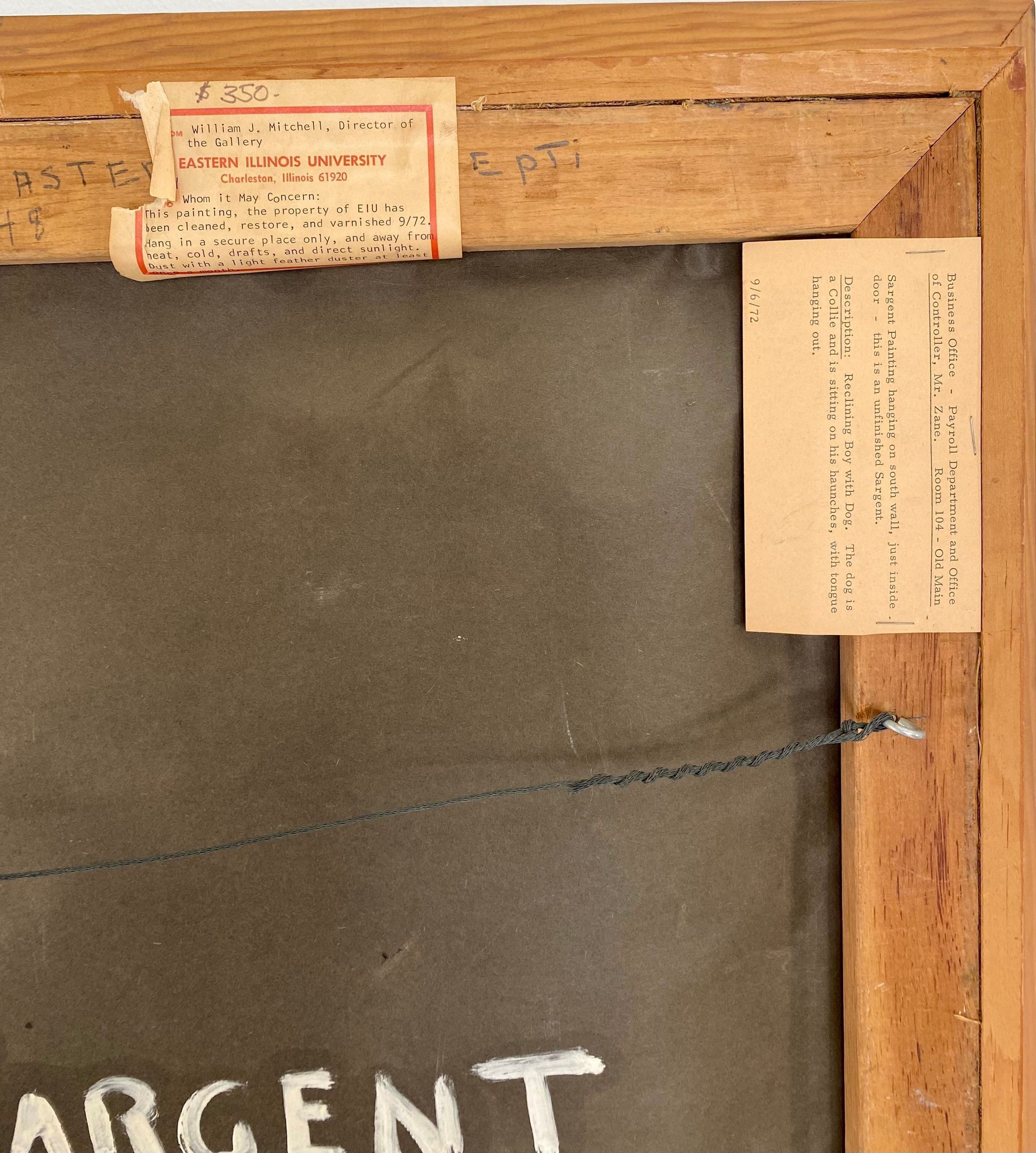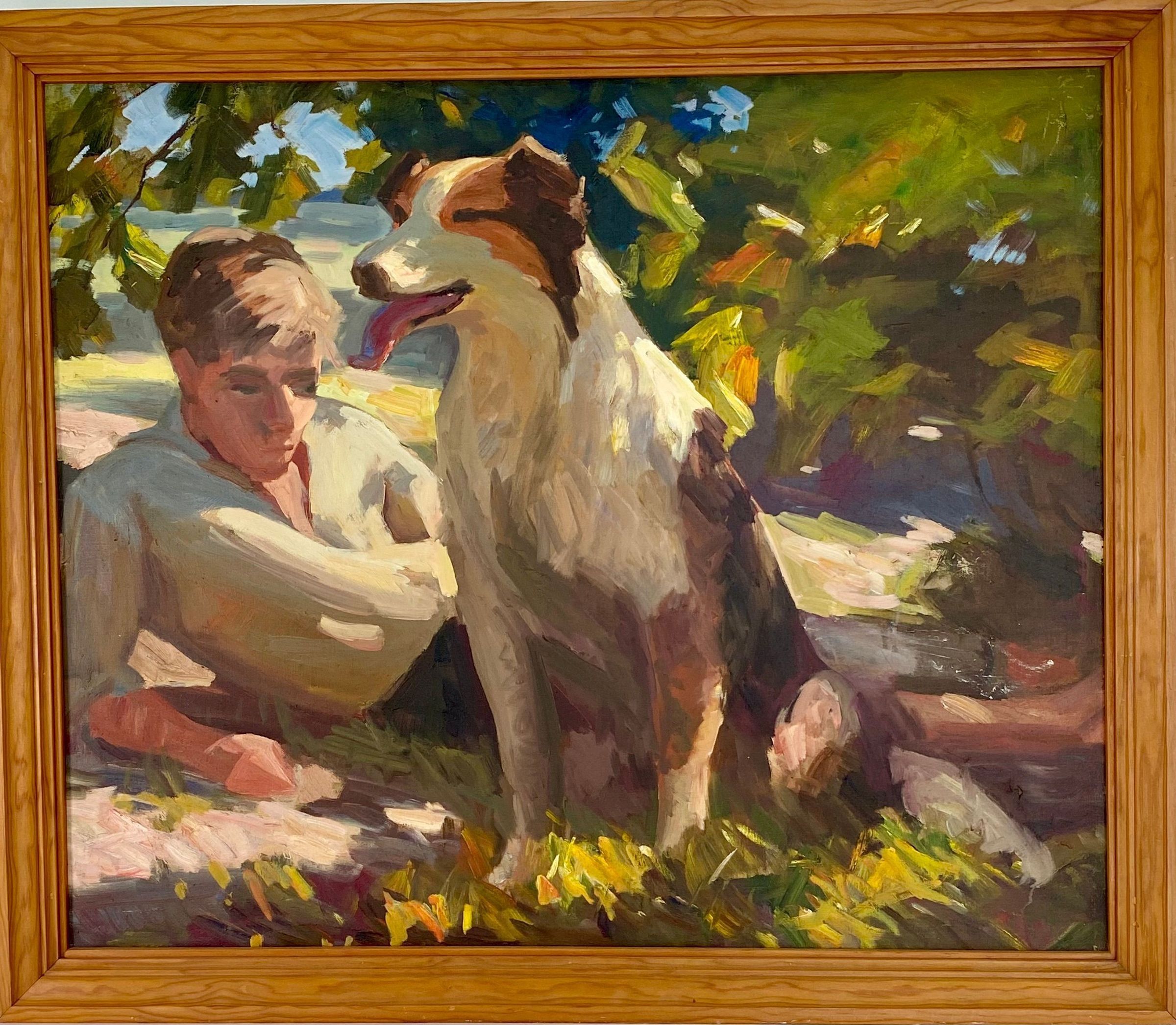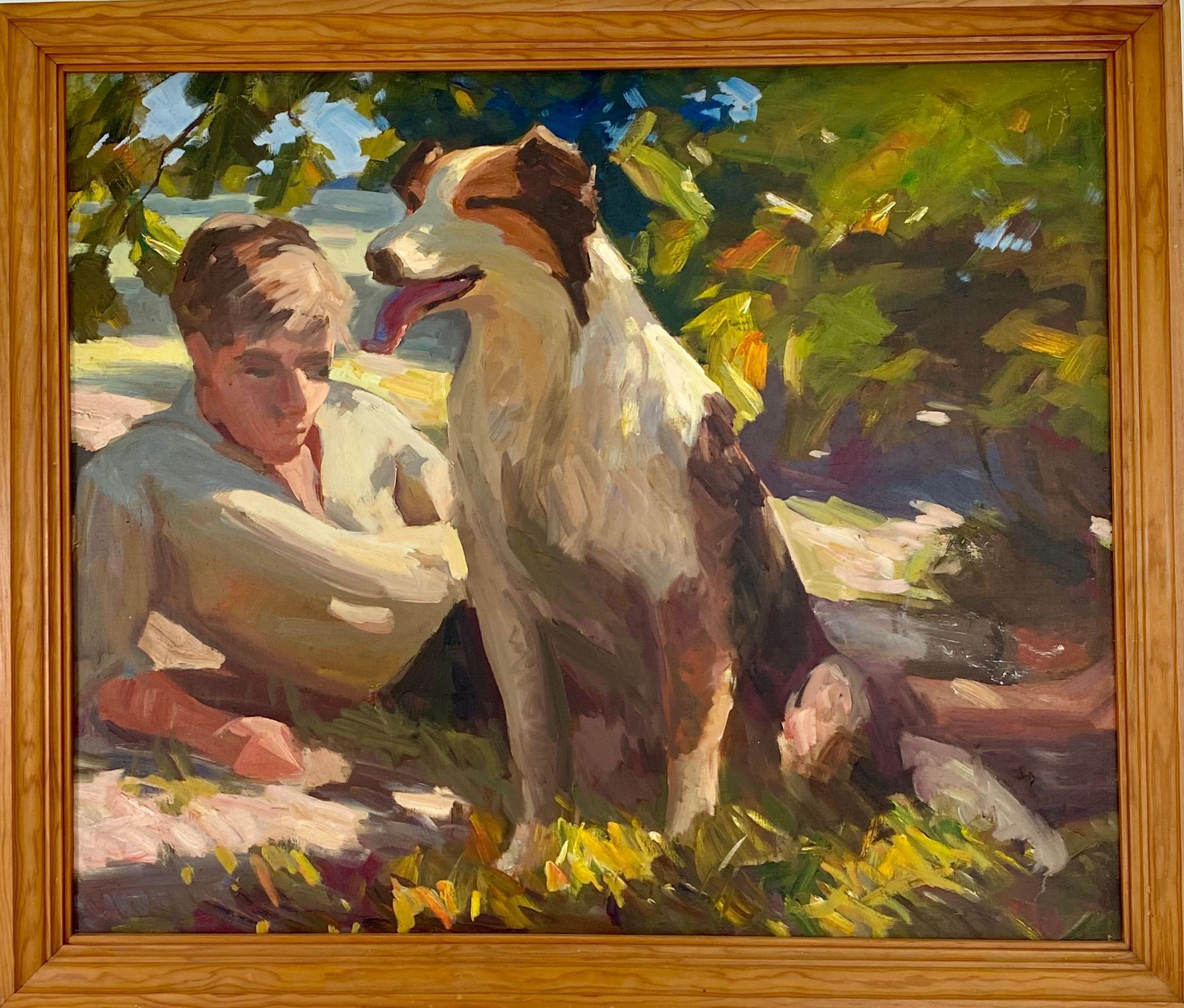Reclining boy with collie, unfinished and unsigned. In oiled wood frame. (Portrait of Daniel W. Moore and Nippy-circa 1935 on waterworkslave.)Collection
