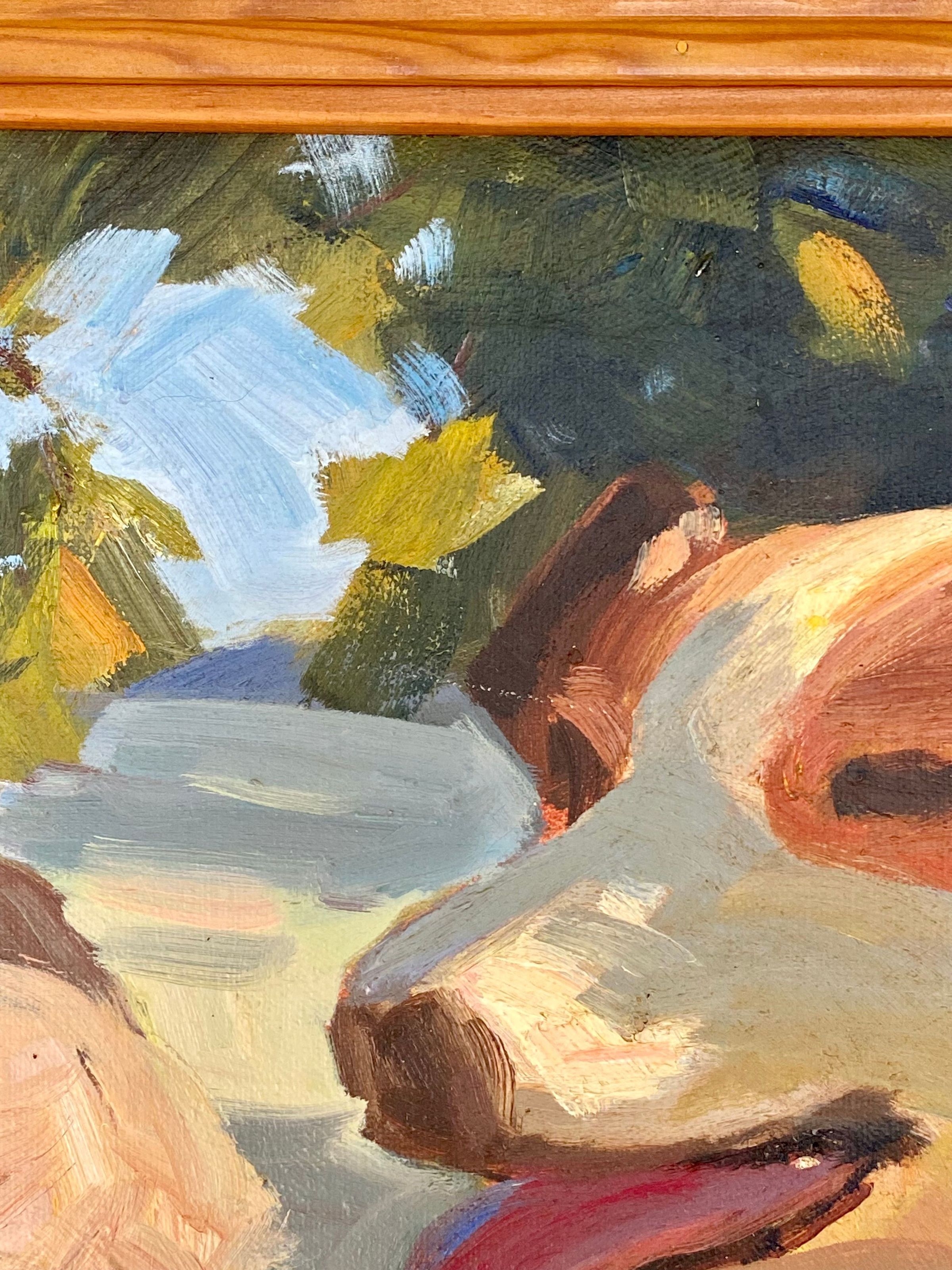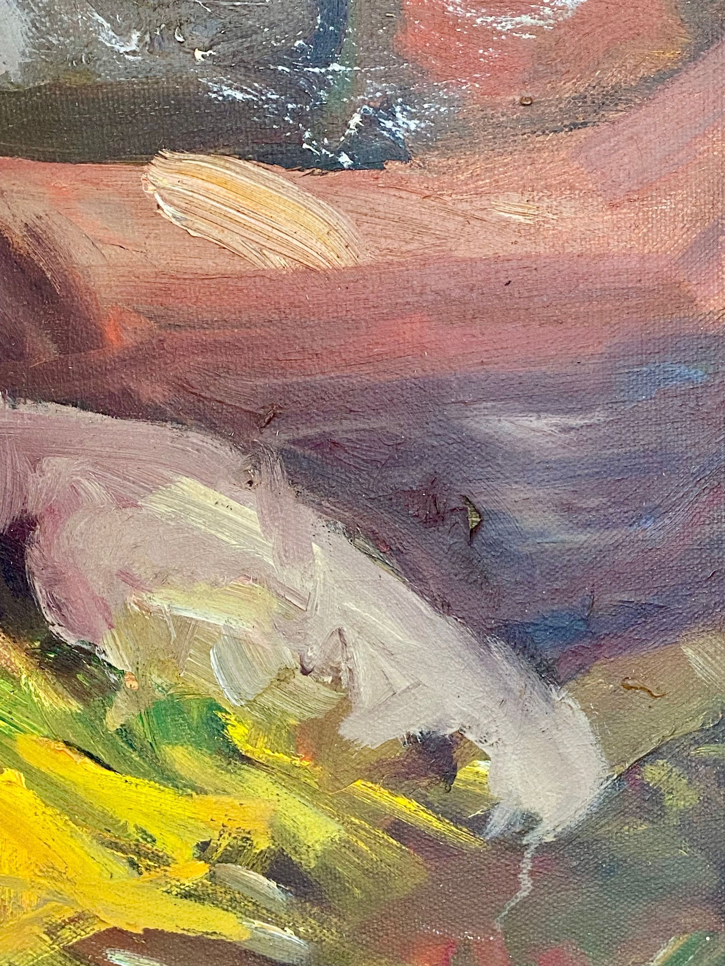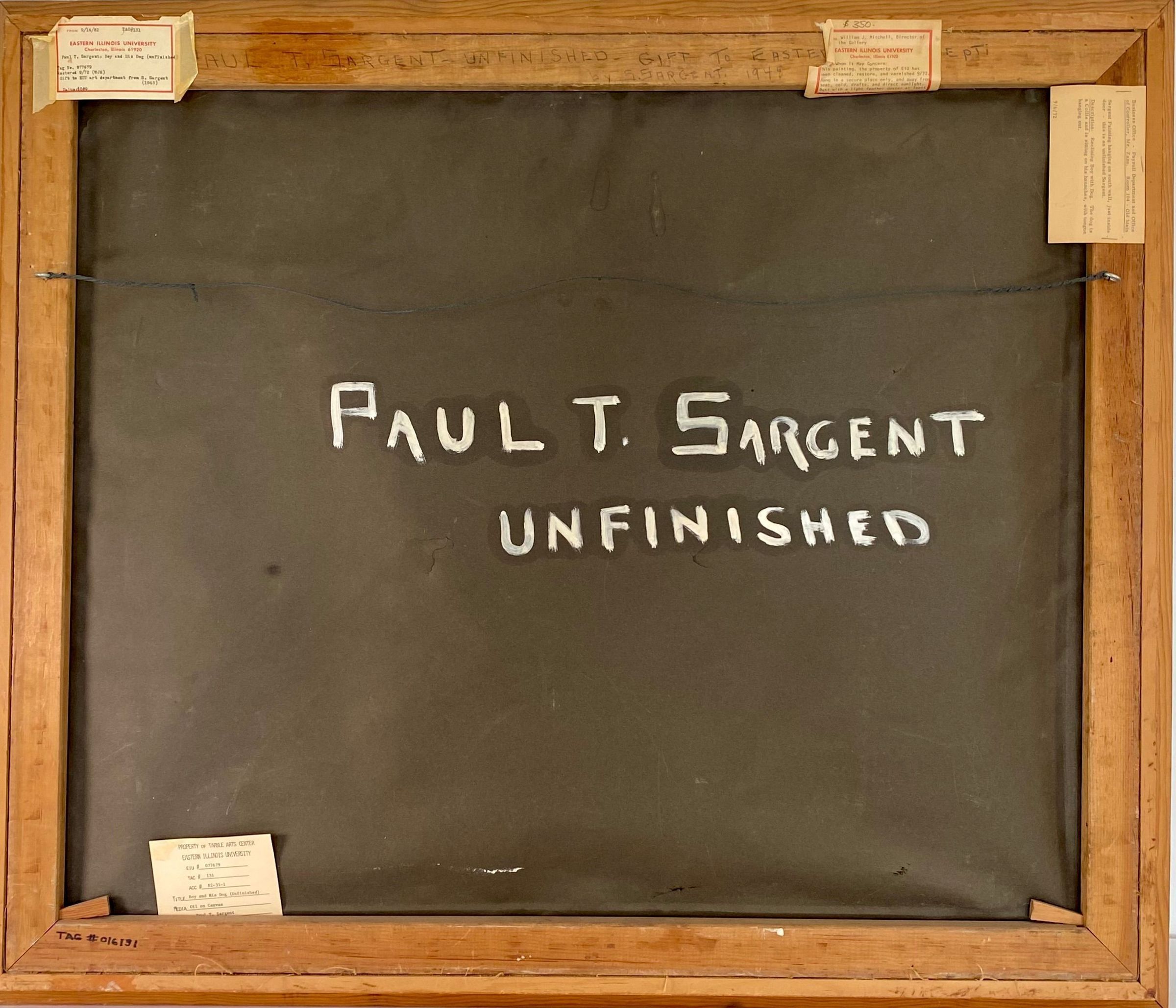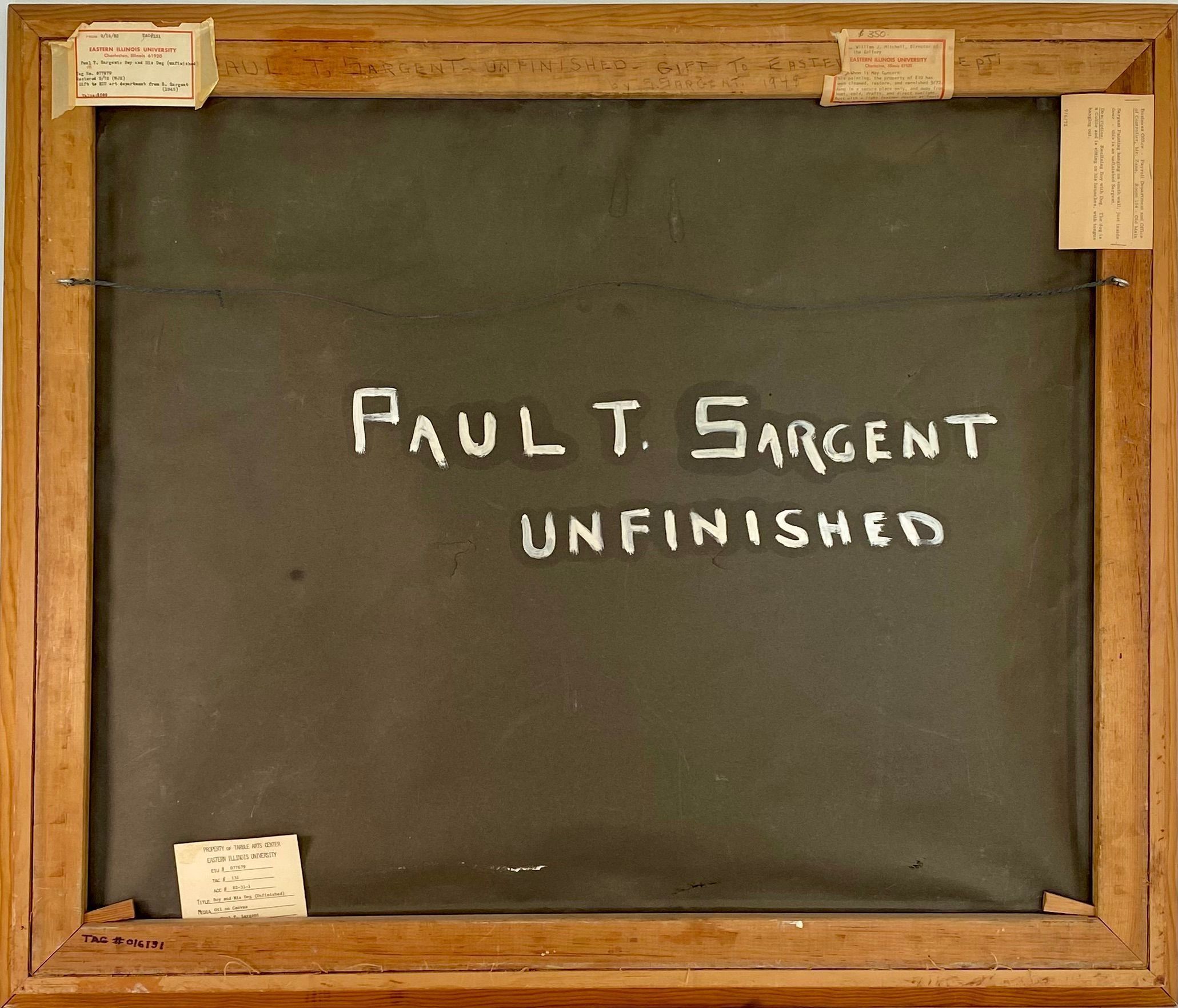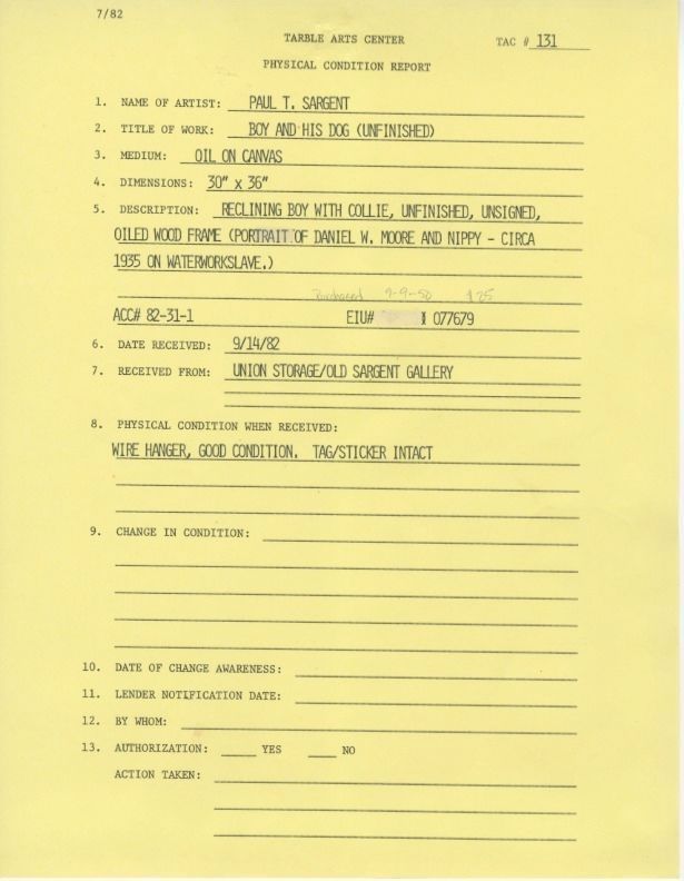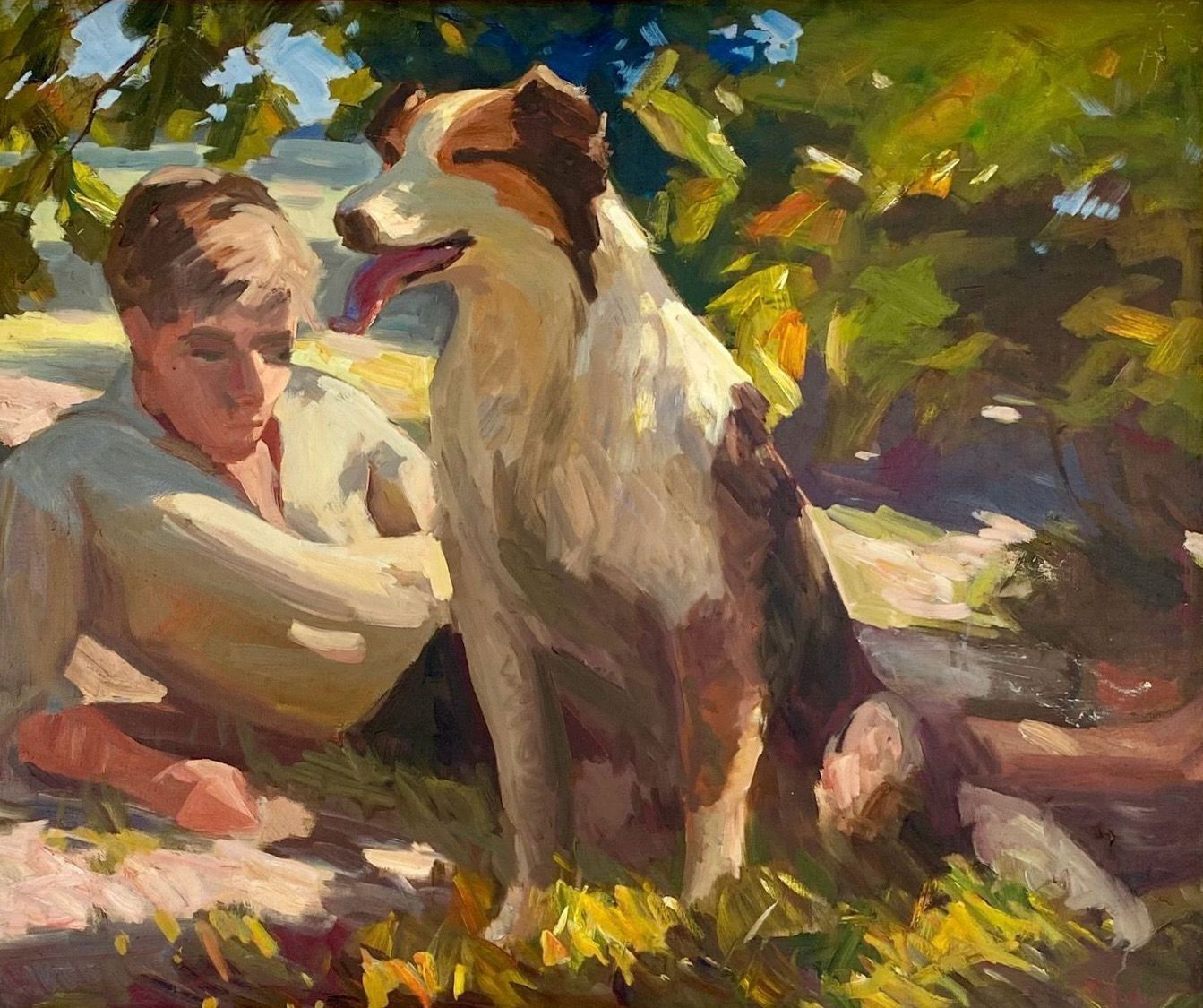Reclining boy with collie, unfinished and unsigned. In oiled wood frame. (Portrait of Daniel W. Moore and Nippy-circa 1935 on waterworkslave.)Collection
