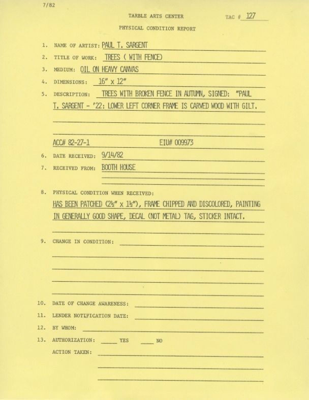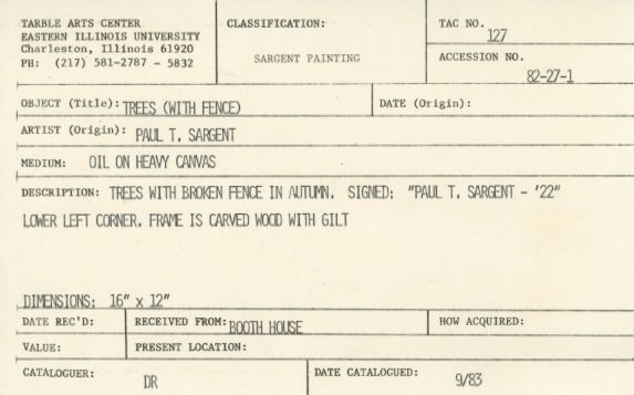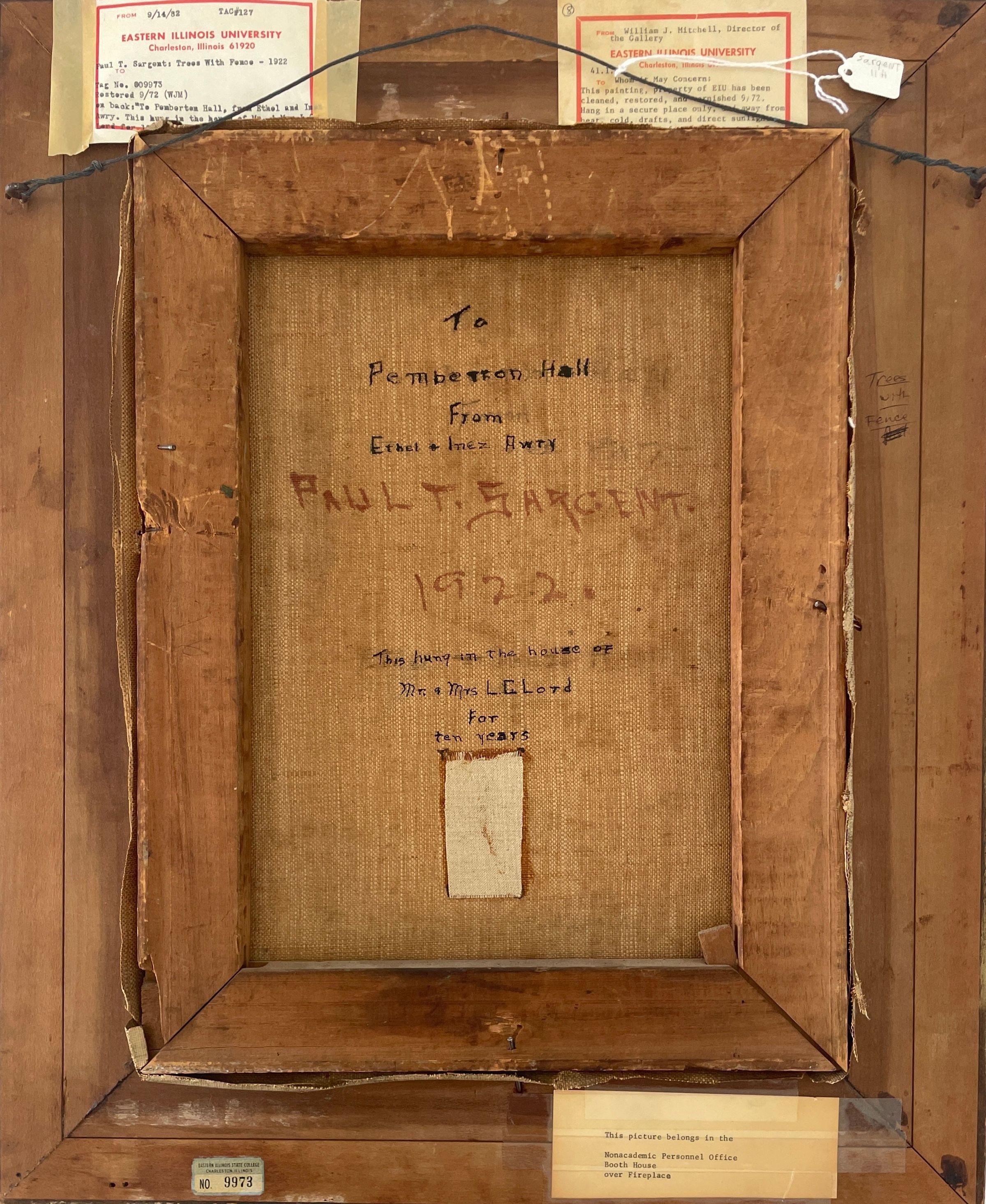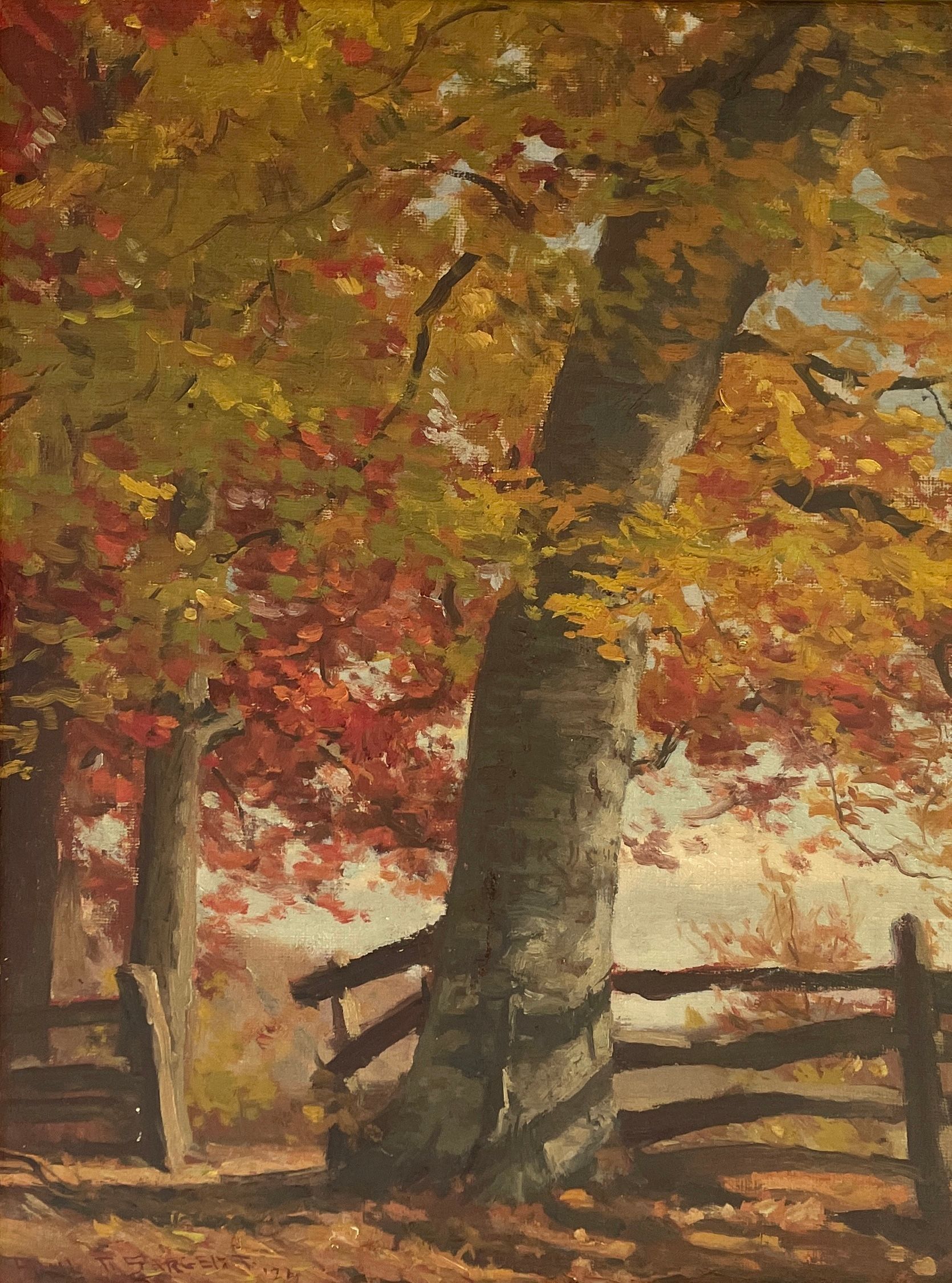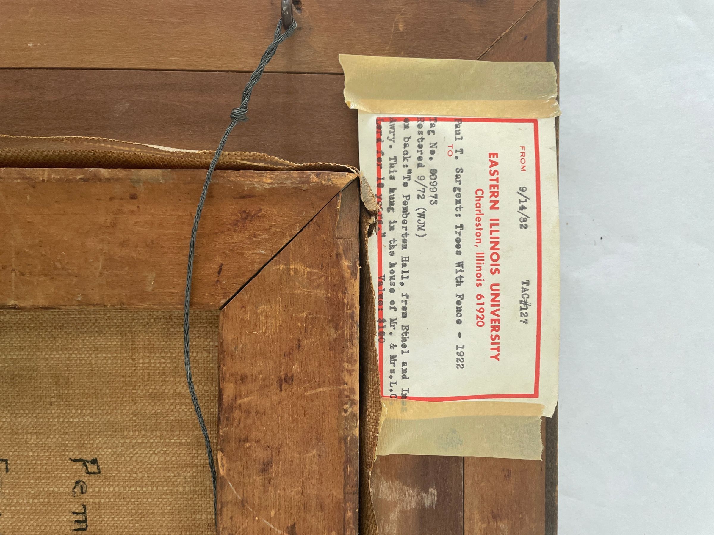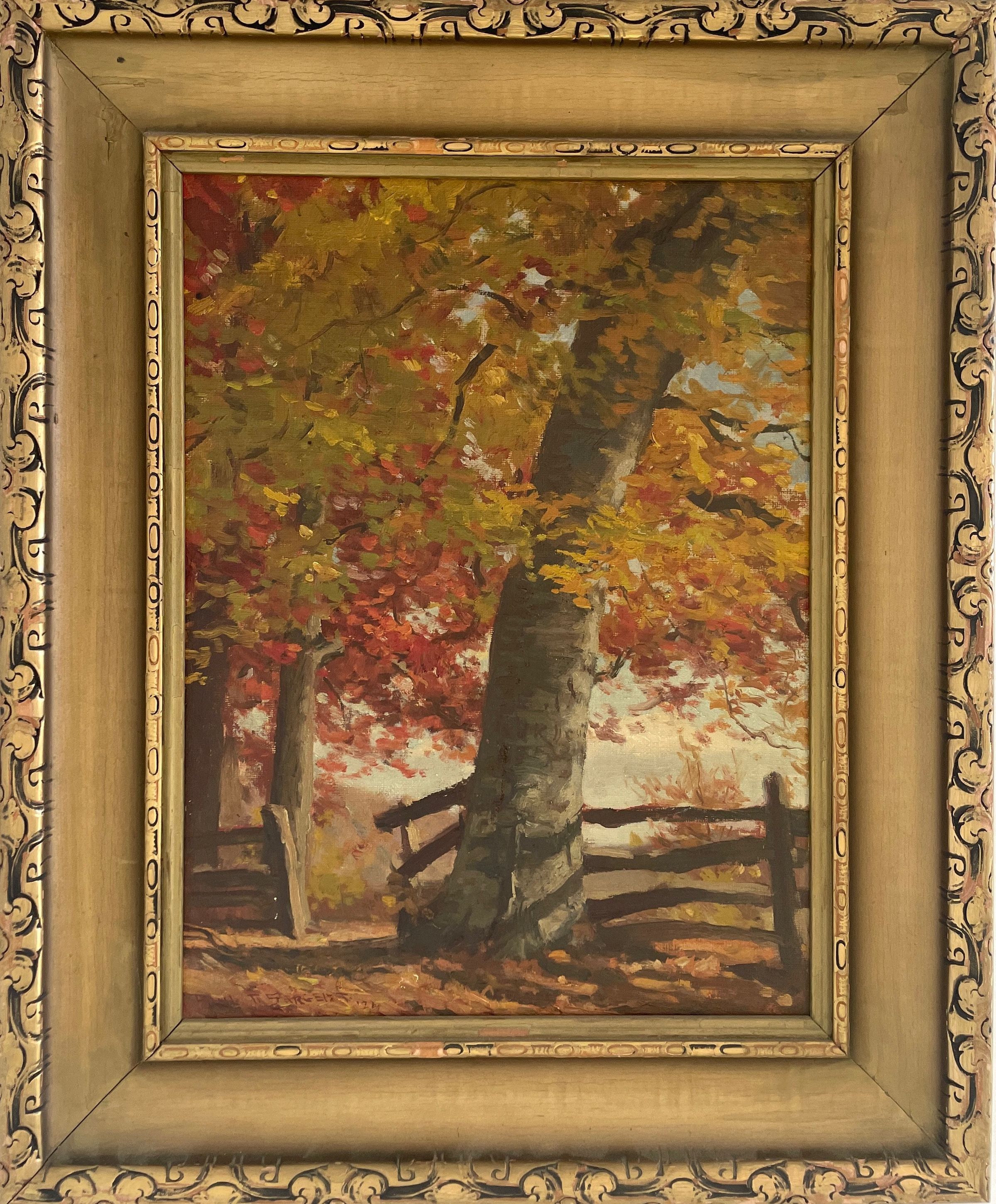 Trees with broken fence in autumn. Frame is carved wood with gilt. Signed: "Paul T. Sargent-'22".Artwork Details