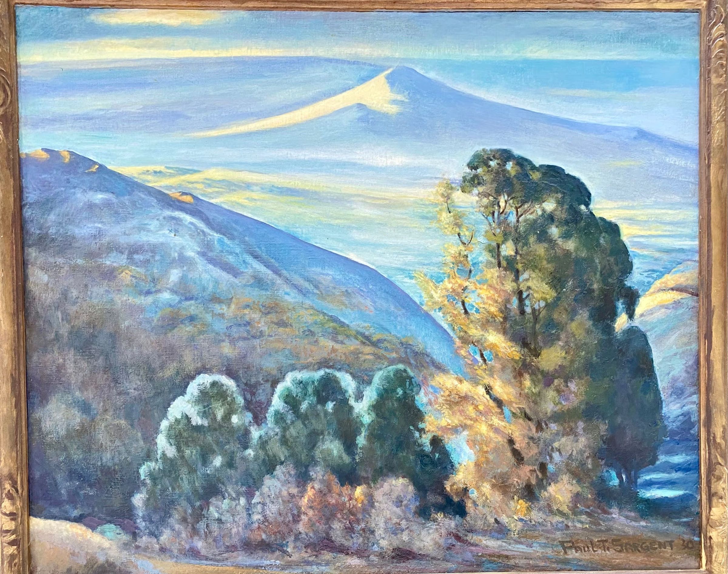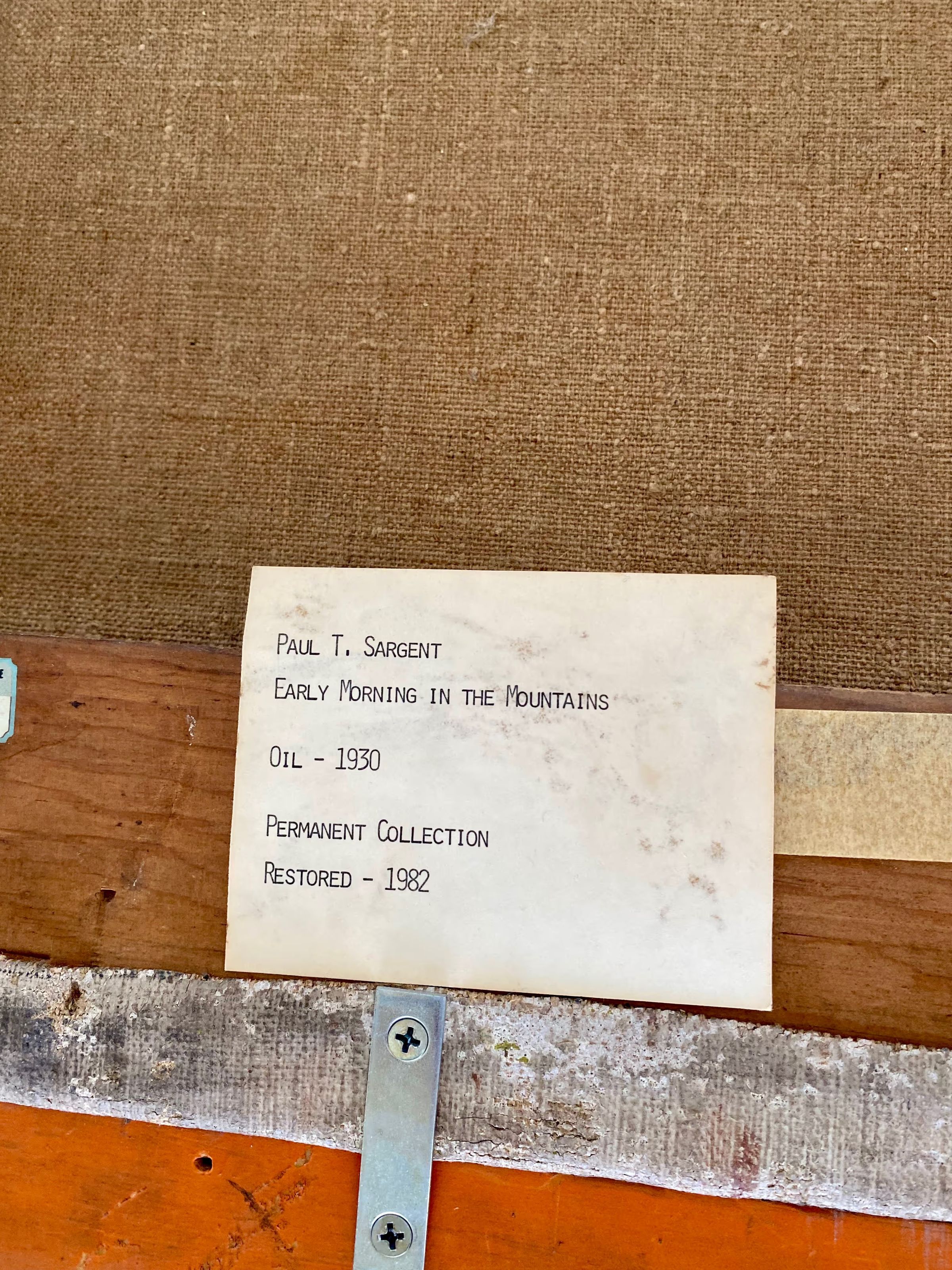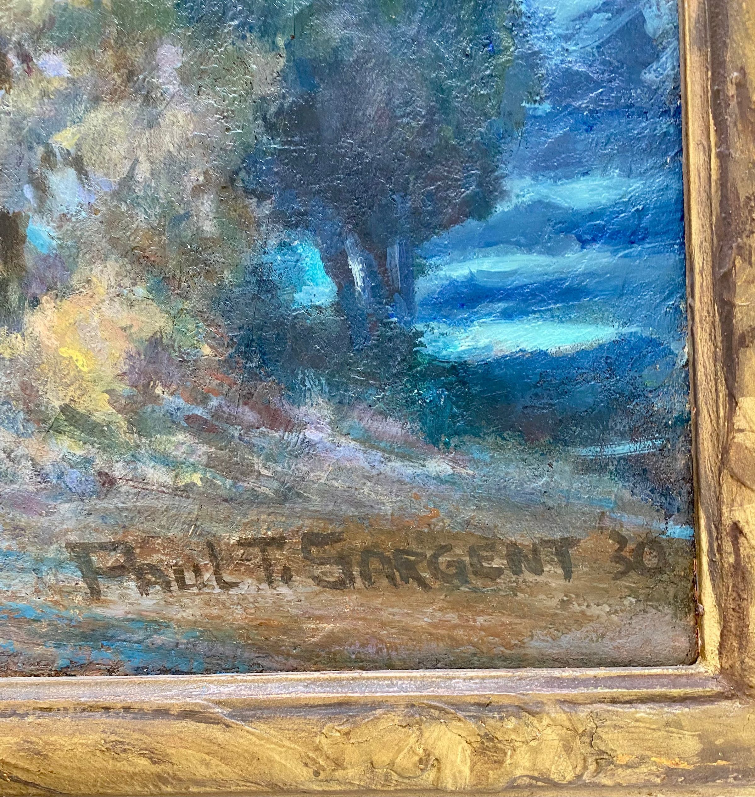Big blue mountain with trees in front (Mt. Le Cont, about 40 miles from Knoxville near Garlinburg TN.) (Info on back) Signed: "Paul T.Sargent-'30" in lower right corner. Wood frame with gilt.Collection