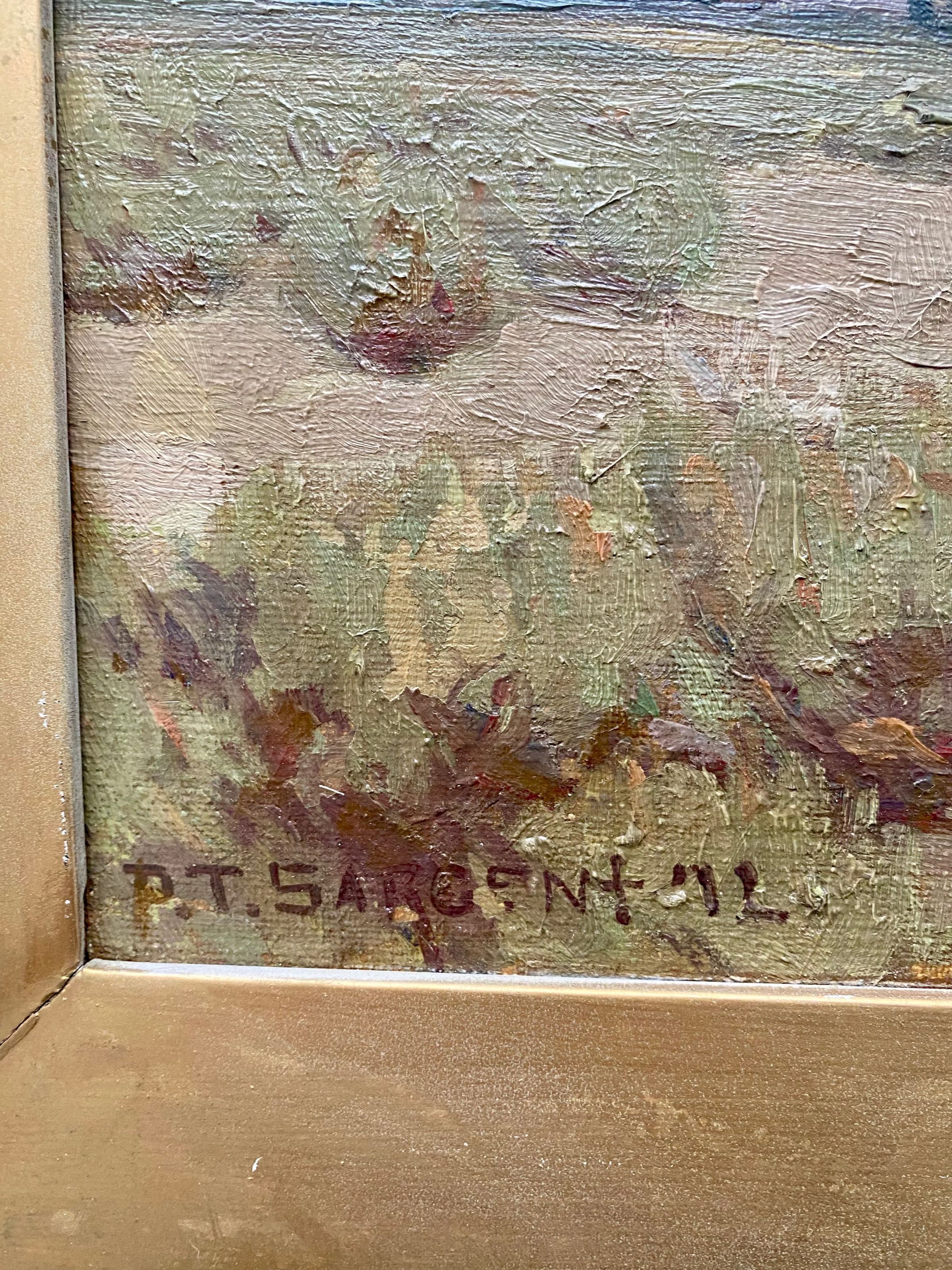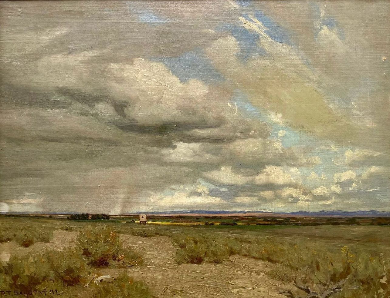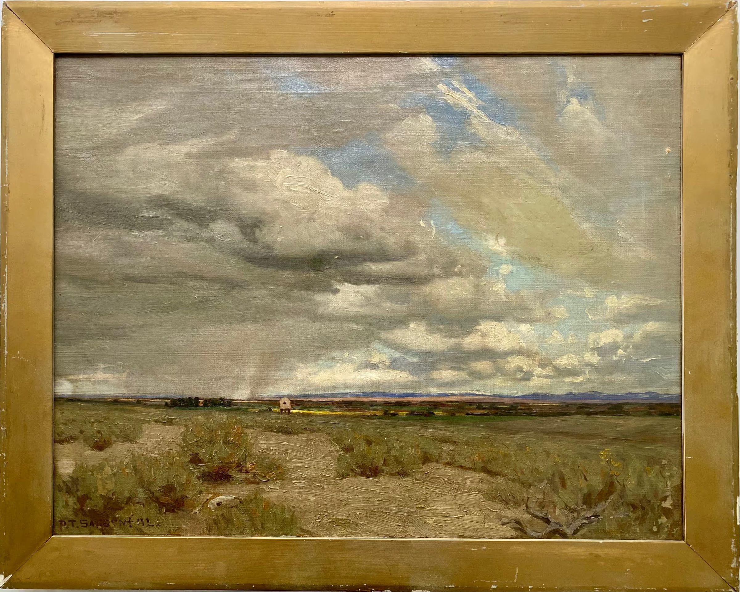 Cloudy skies over covered wagon on plain. Signed: P.T. Sargent-'12" in lower left corner- wood frame painted dark cream/color.Collection