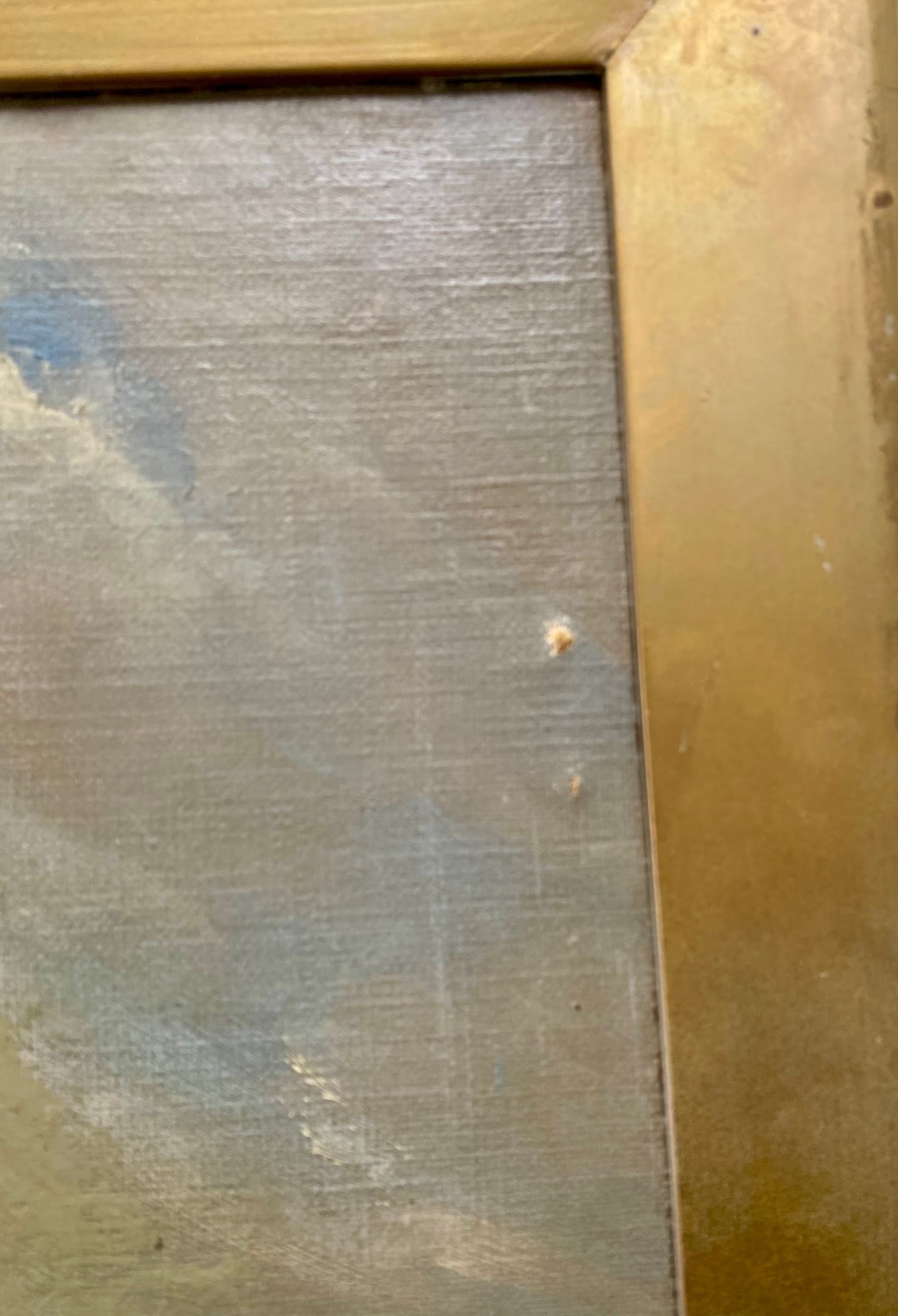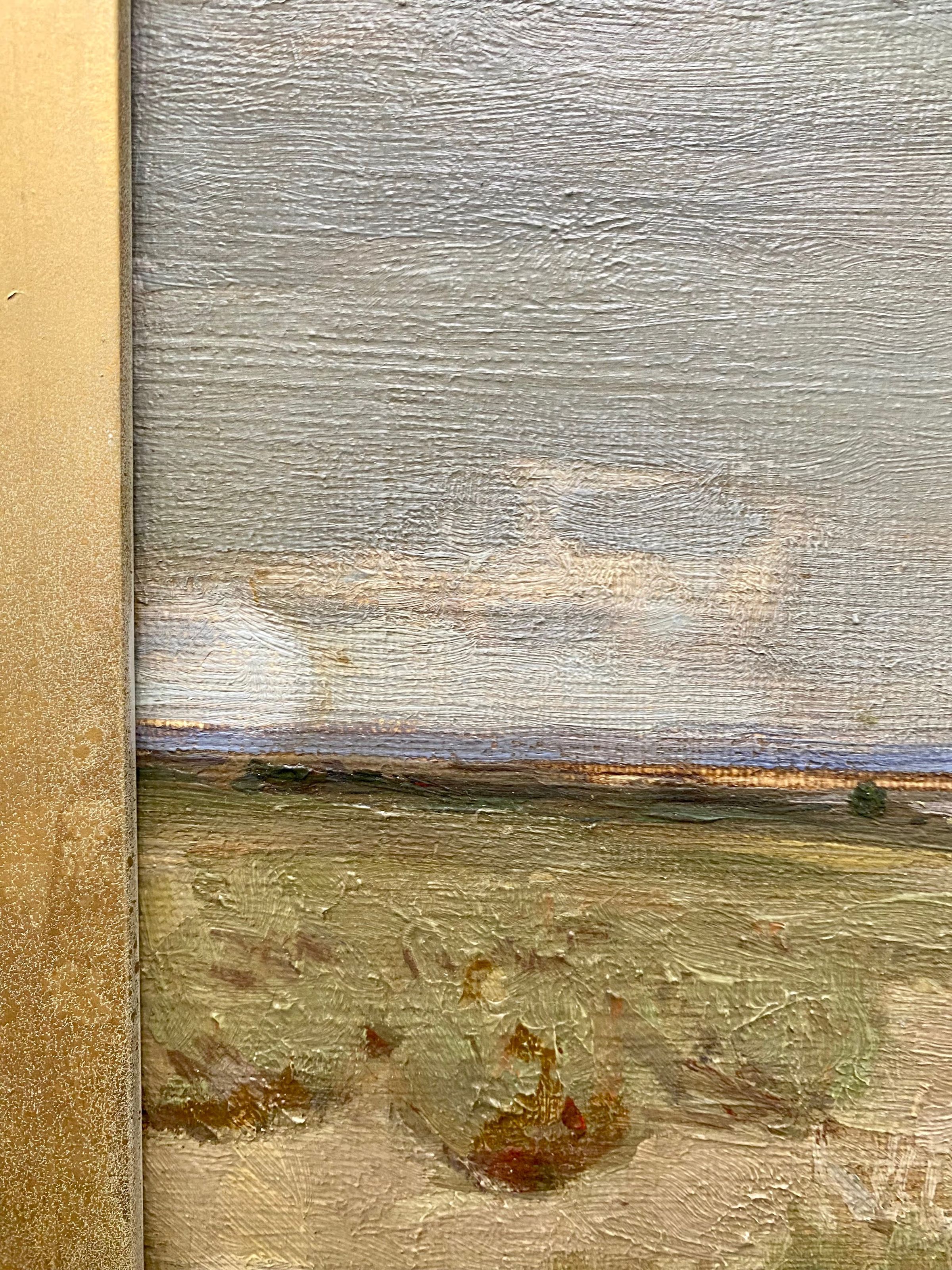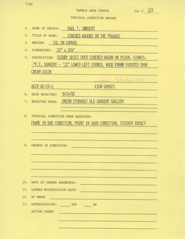 Cloudy skies over covered wagon on plain. Signed: P.T. Sargent-'12" in lower left corner- wood frame painted dark cream/color.Collection