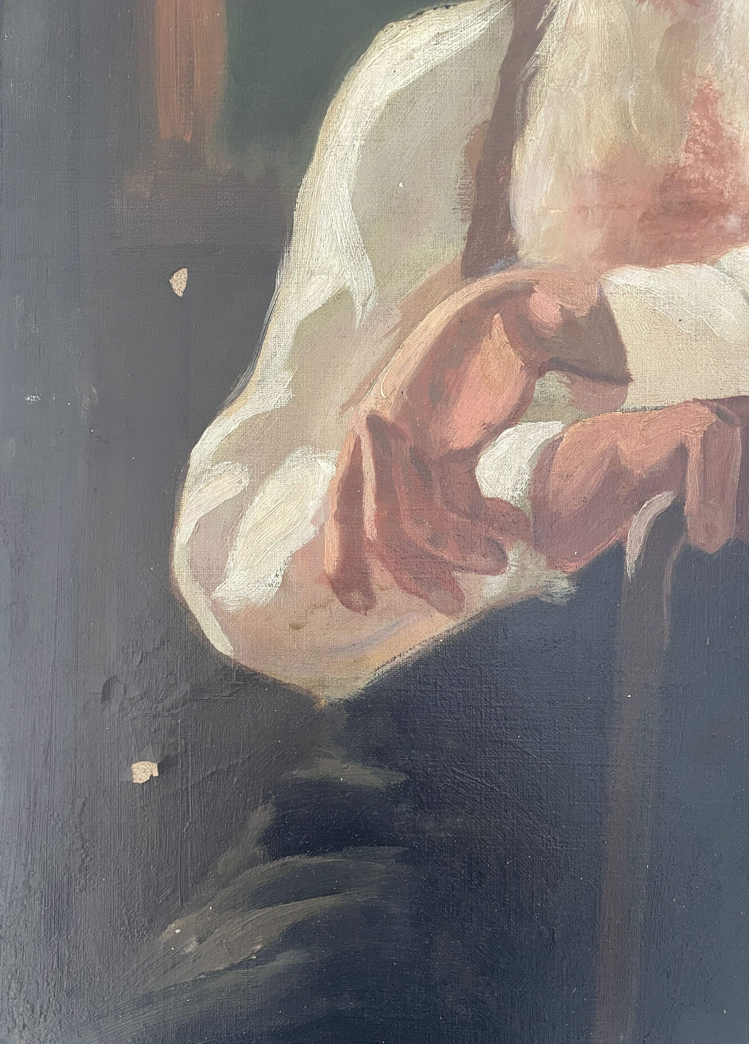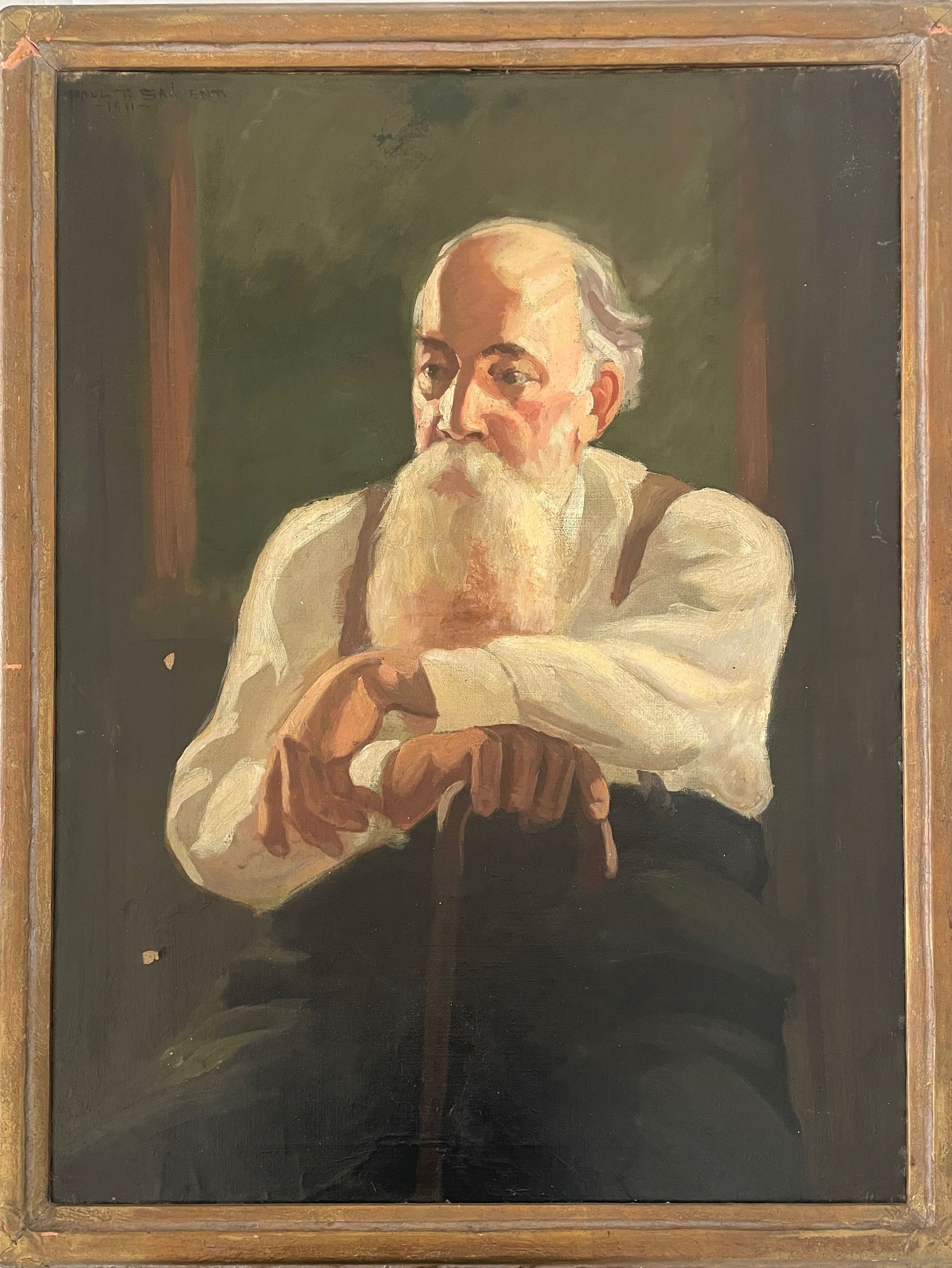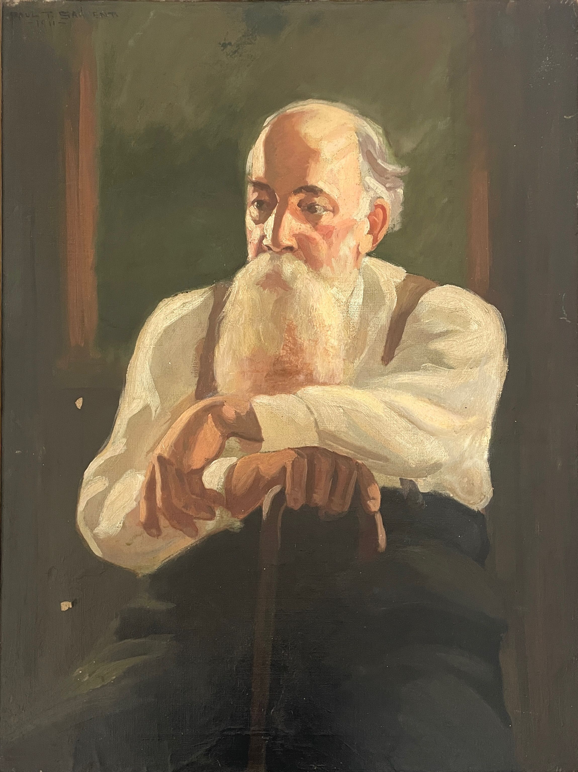 Portrait of old bearded man supported on cane, sitting.Collection