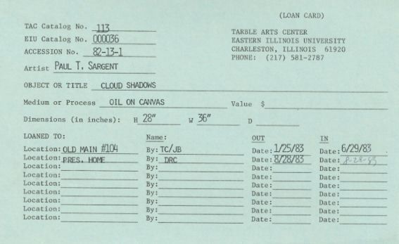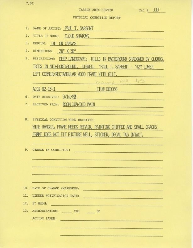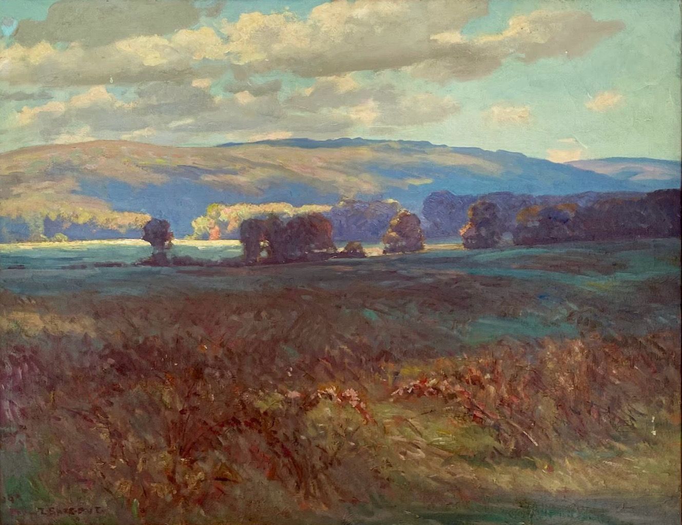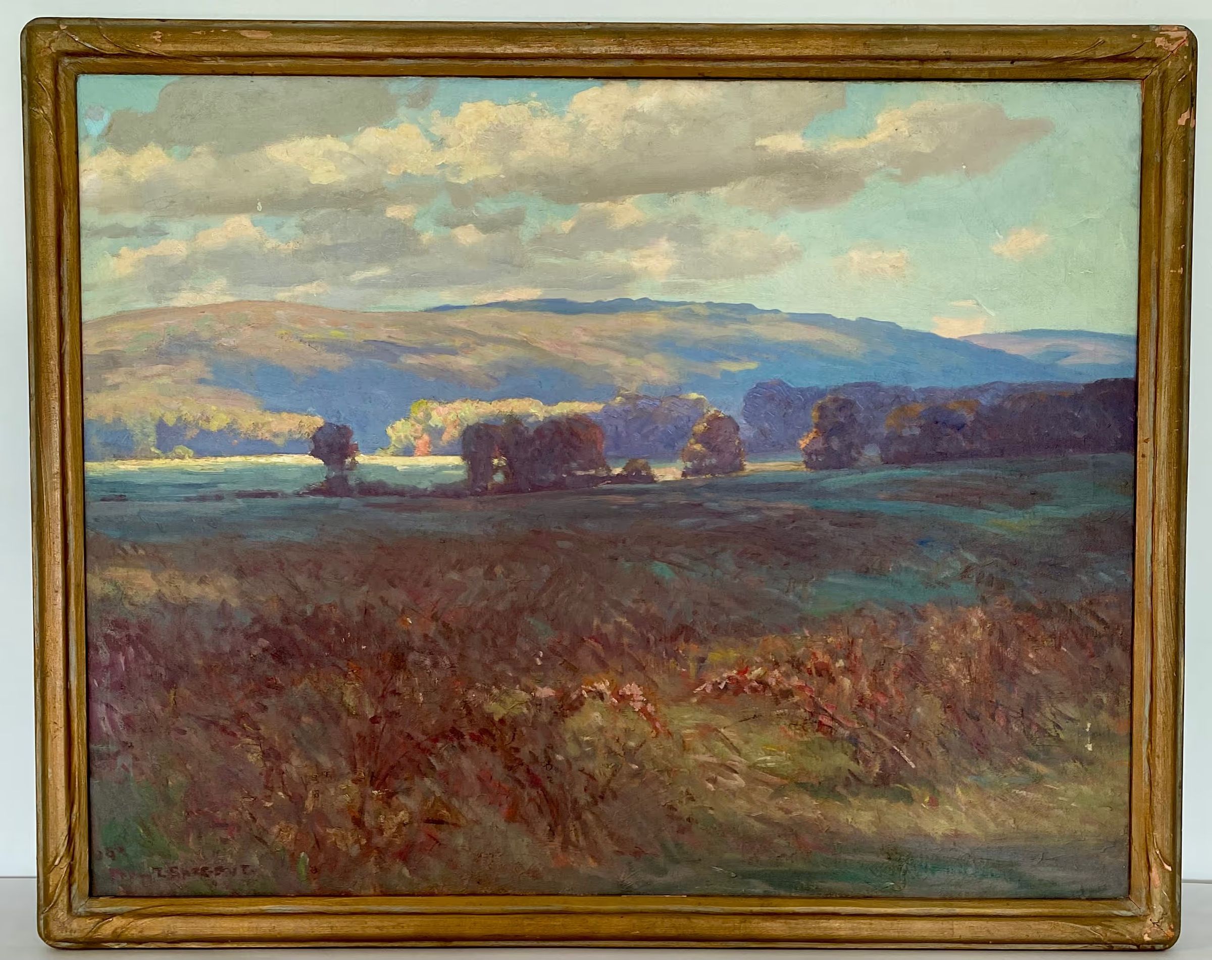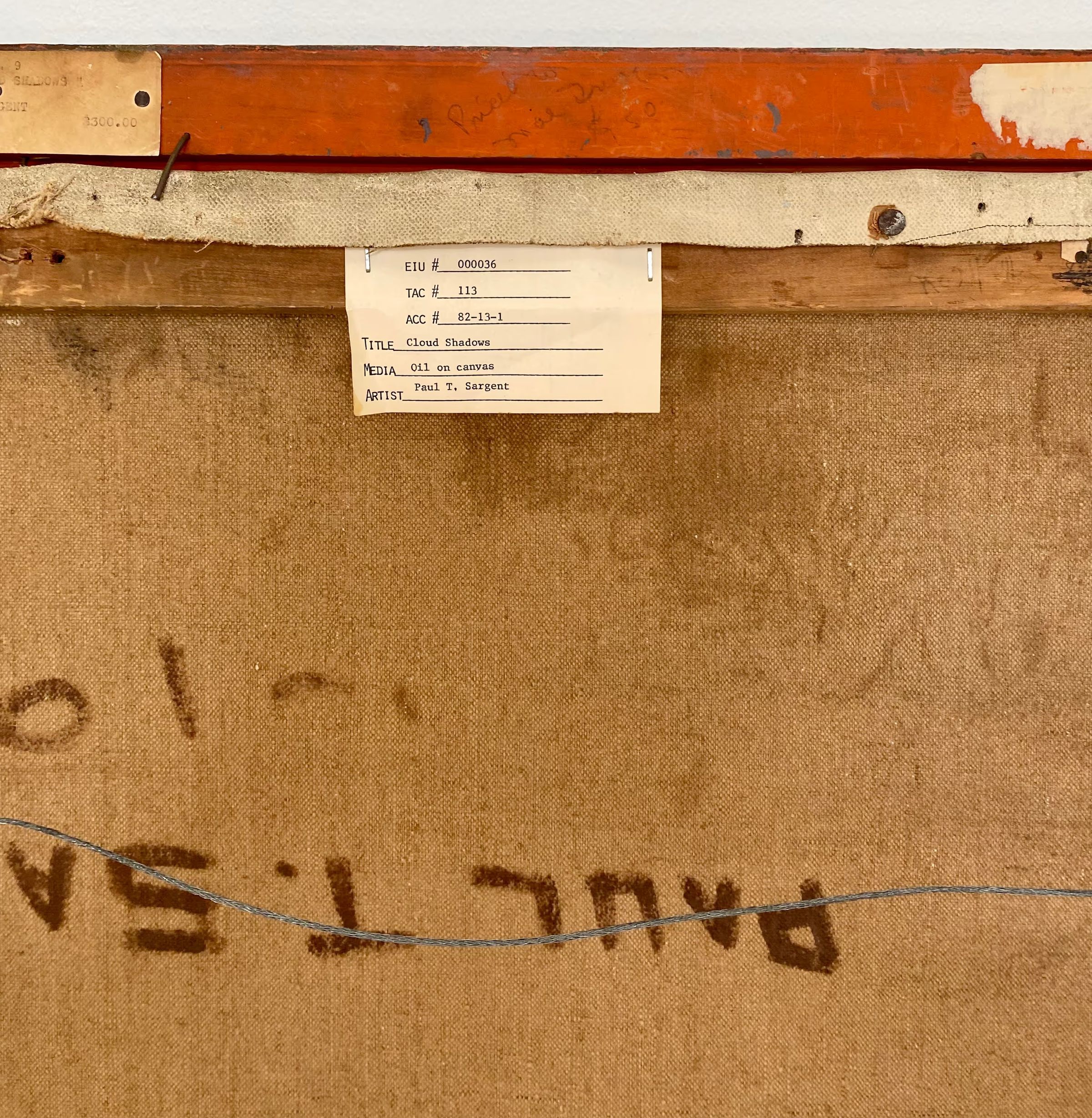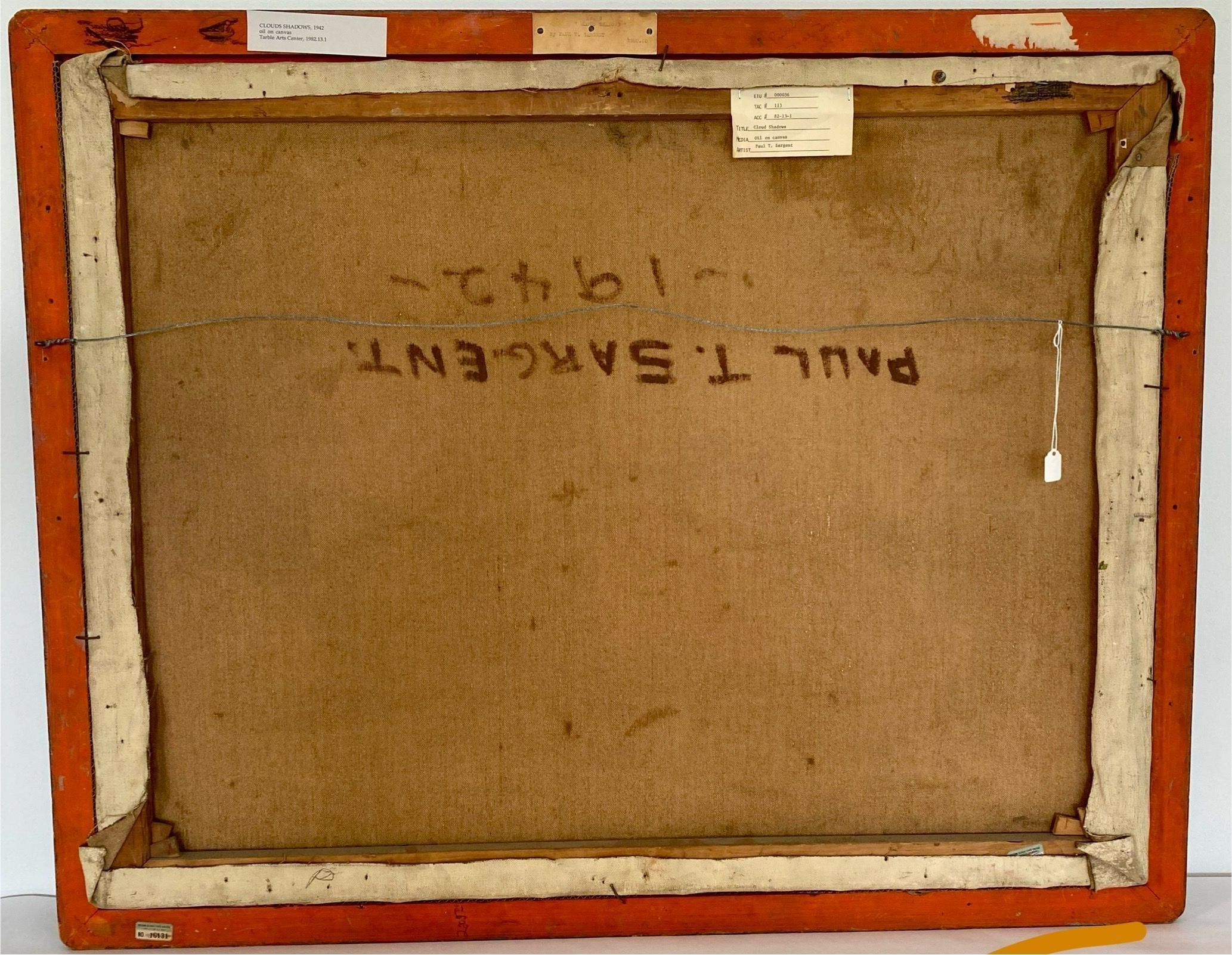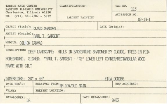 Deep landscape: Hills in background shadowed by clouds- trees in mid-foreground. Signed: "Paul T. Sargent-'42" lower left corner/rectangular wood frame with gilt.Collection