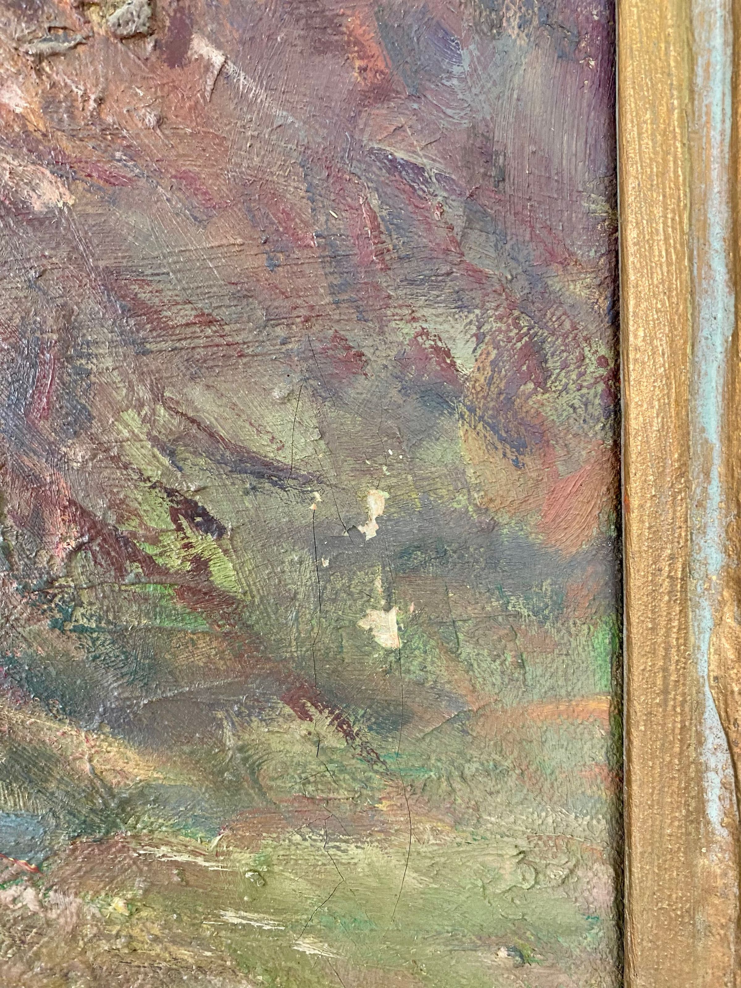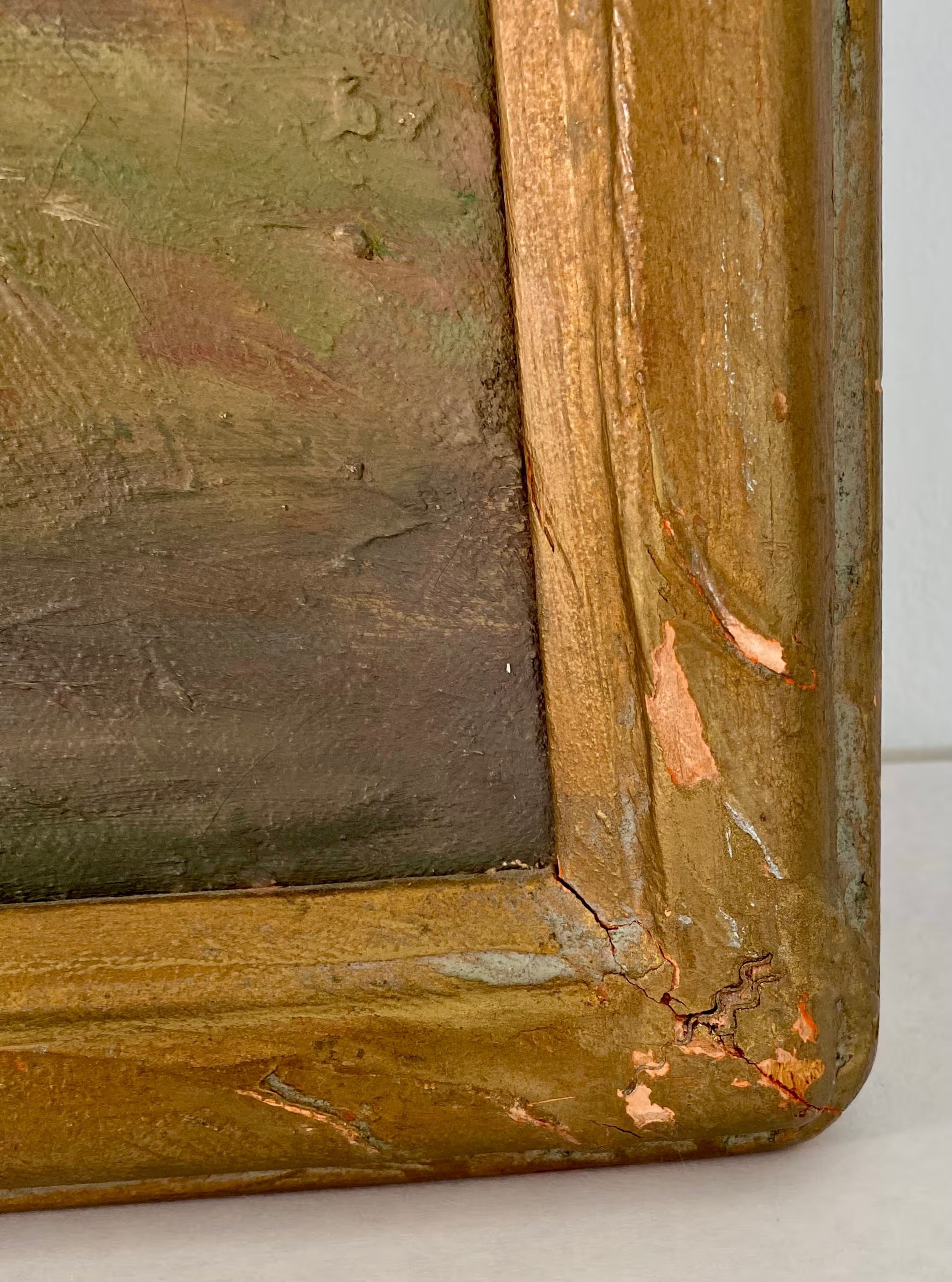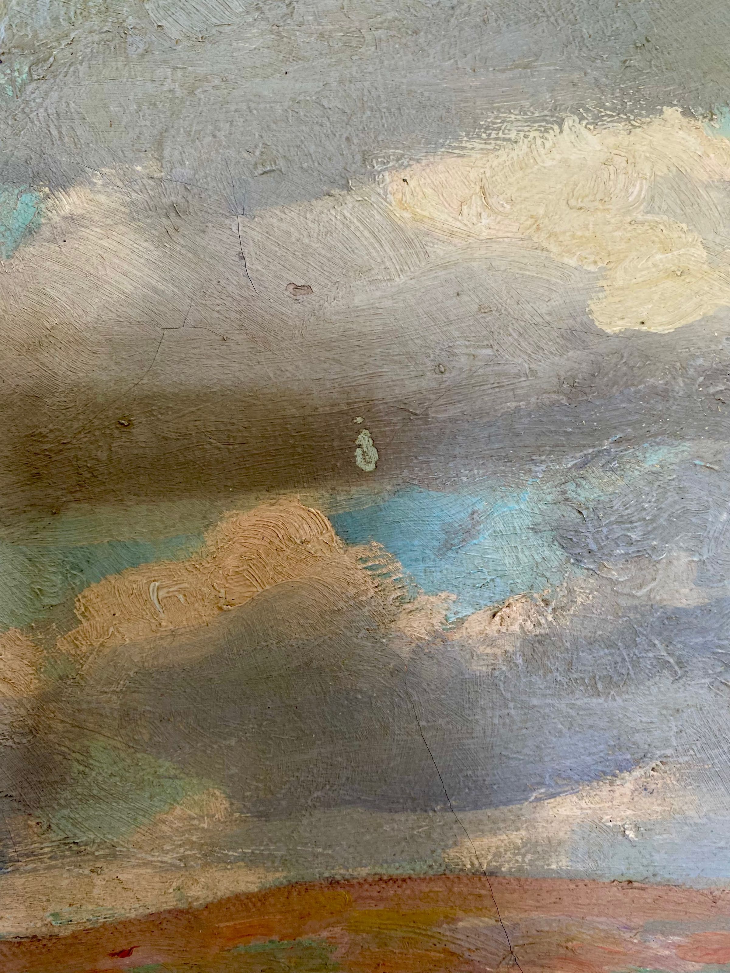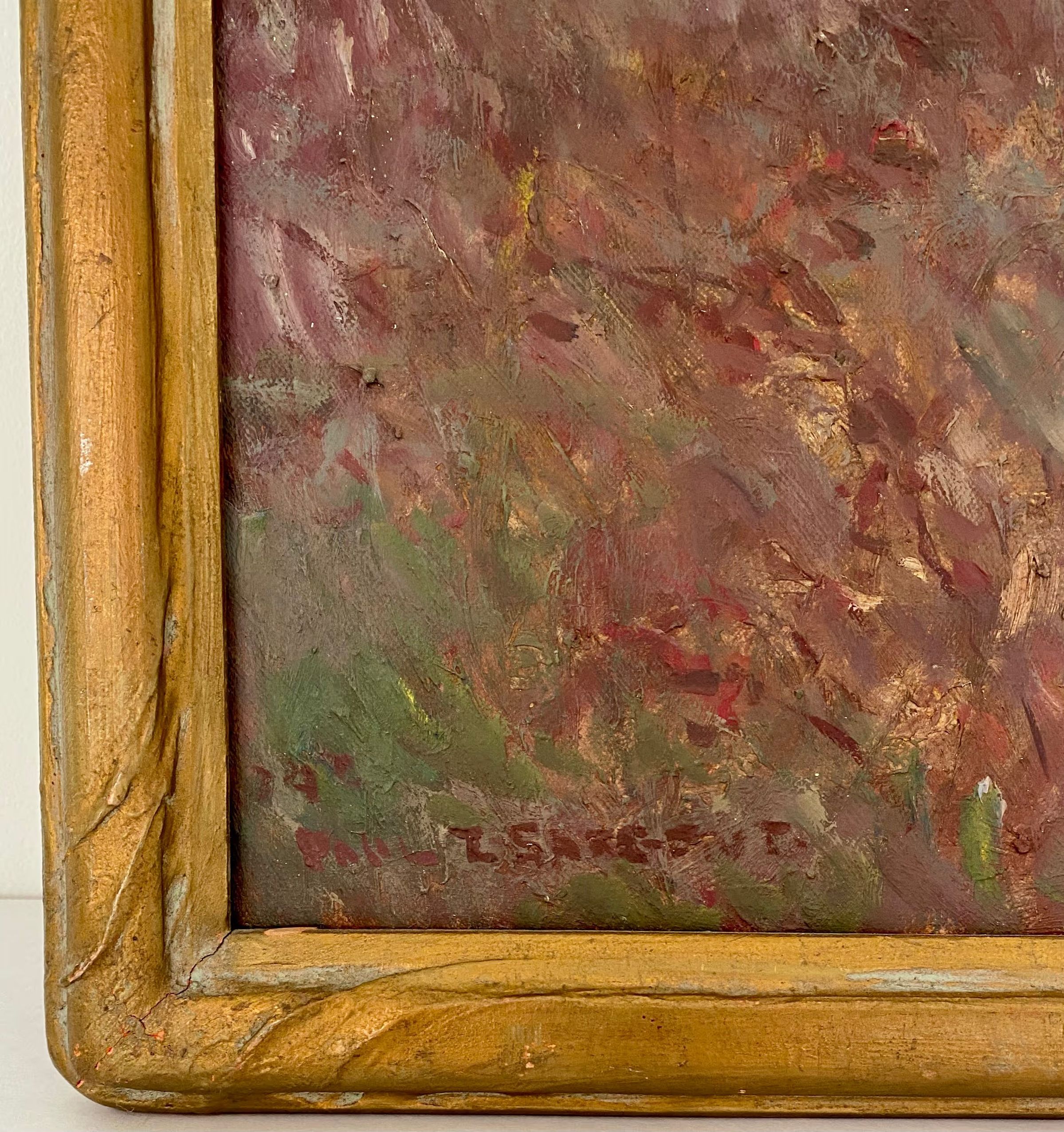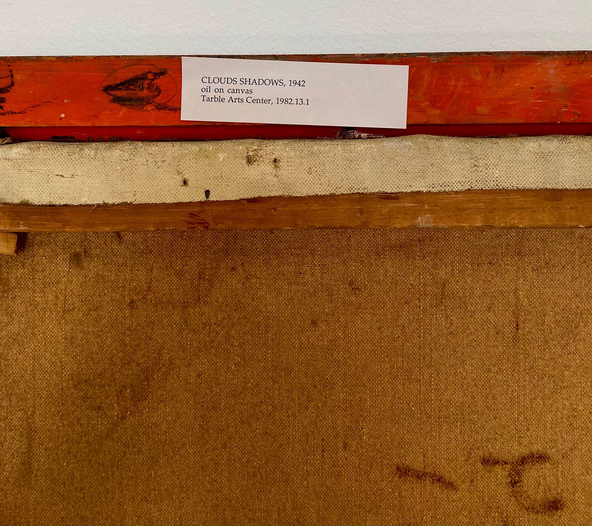 Deep landscape: Hills in background shadowed by clouds- trees in mid-foreground. Signed: "Paul T. Sargent-'42" lower left corner/rectangular wood frame with gilt.Collection