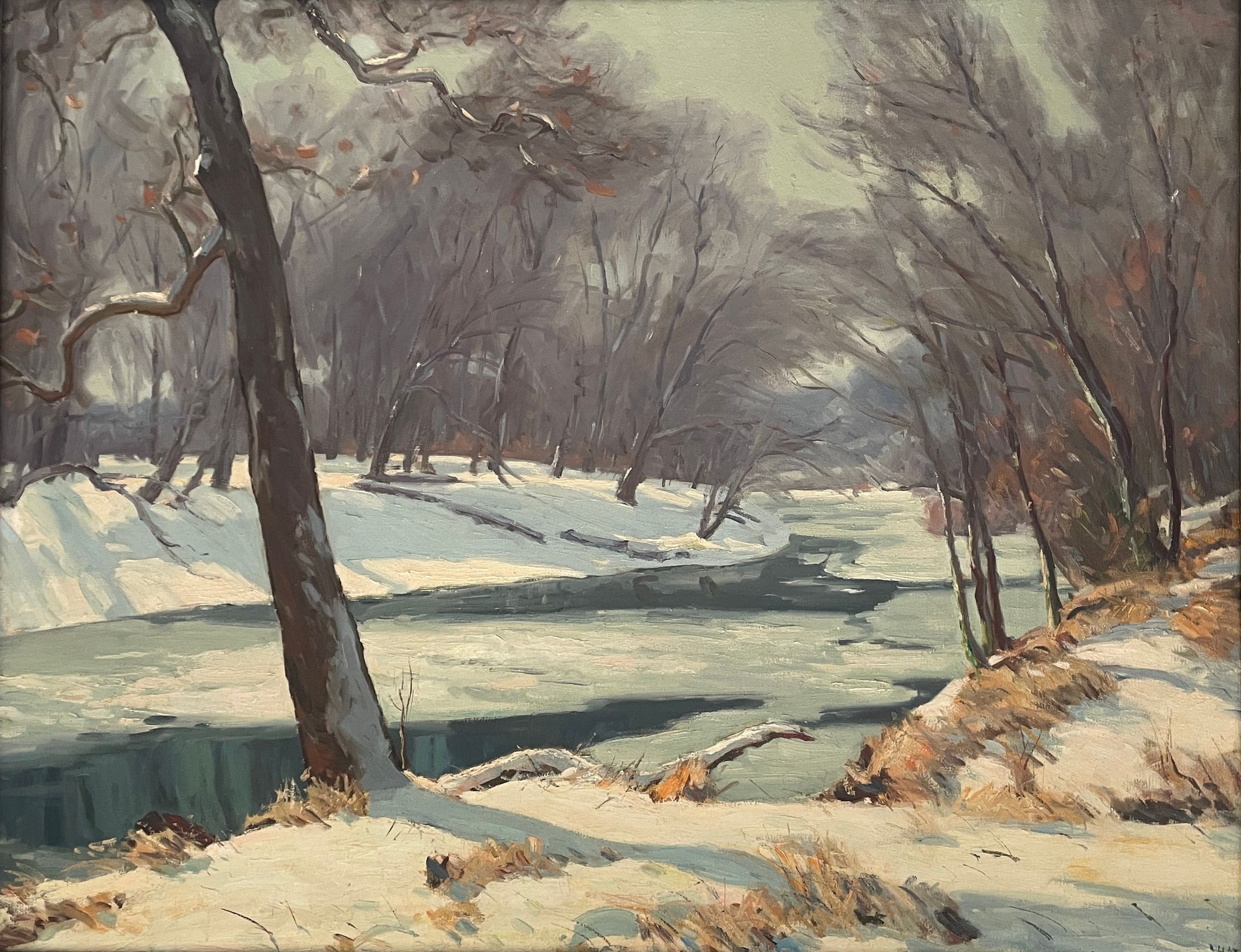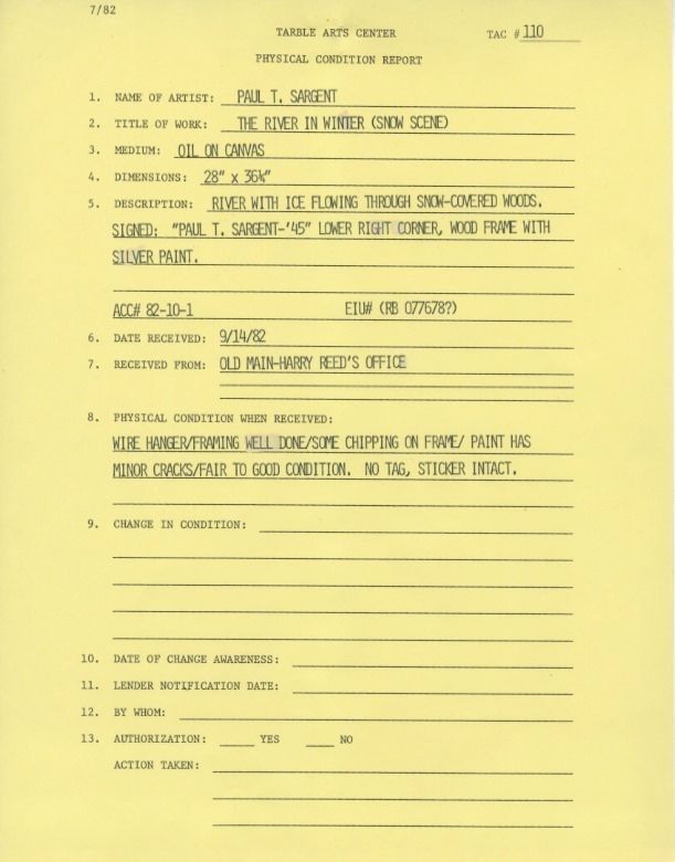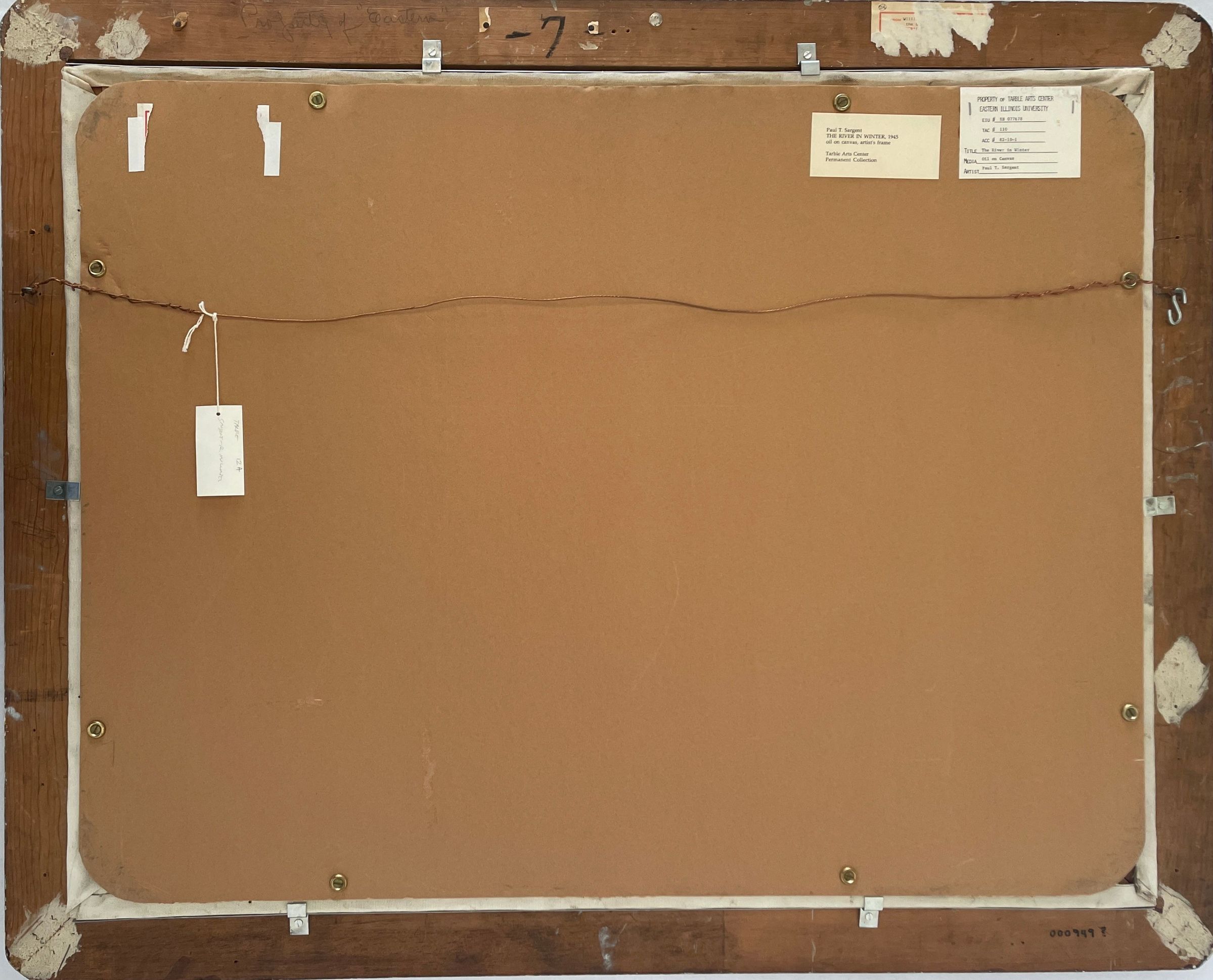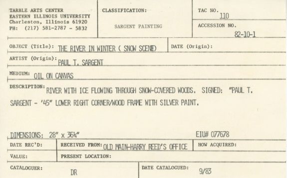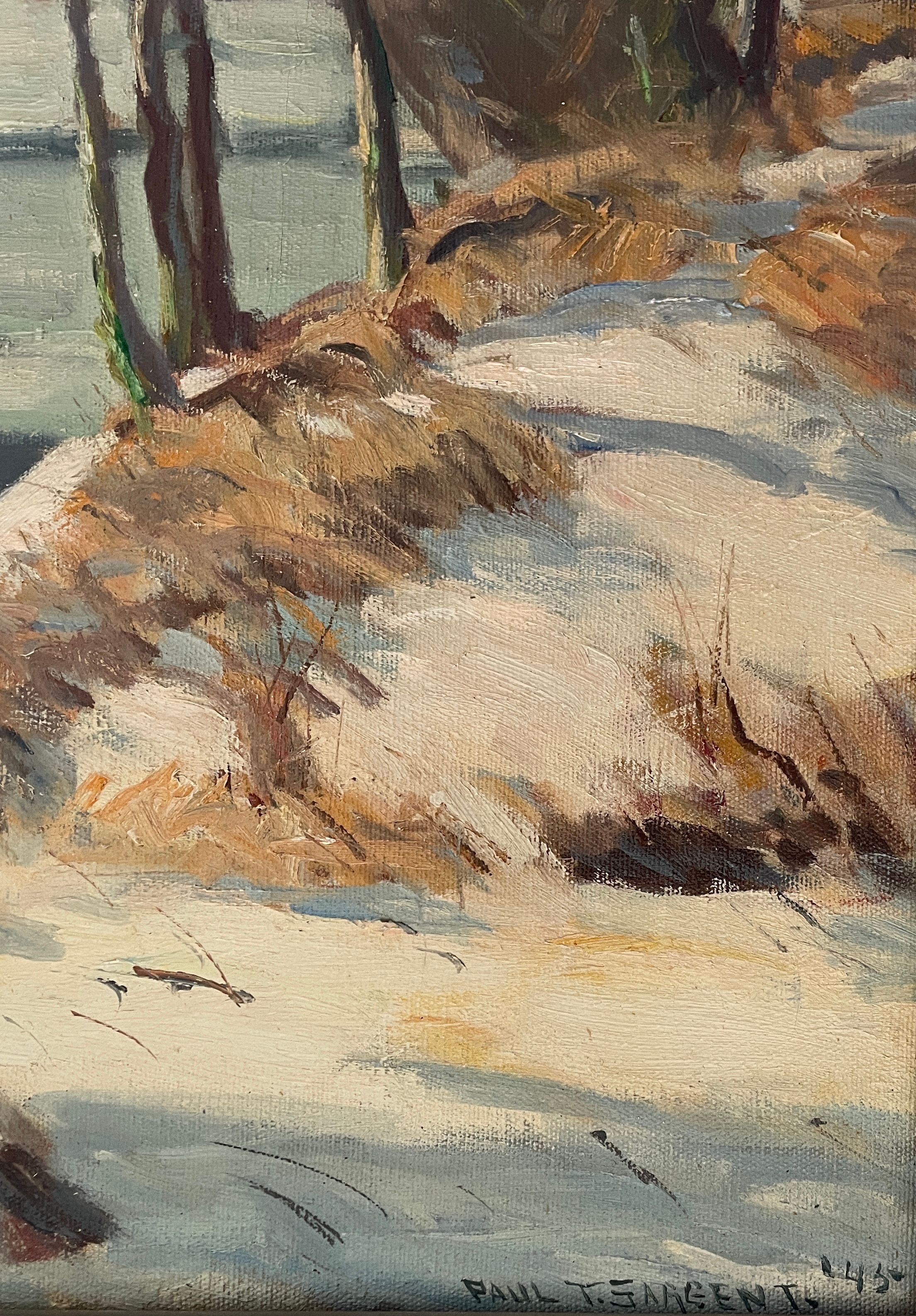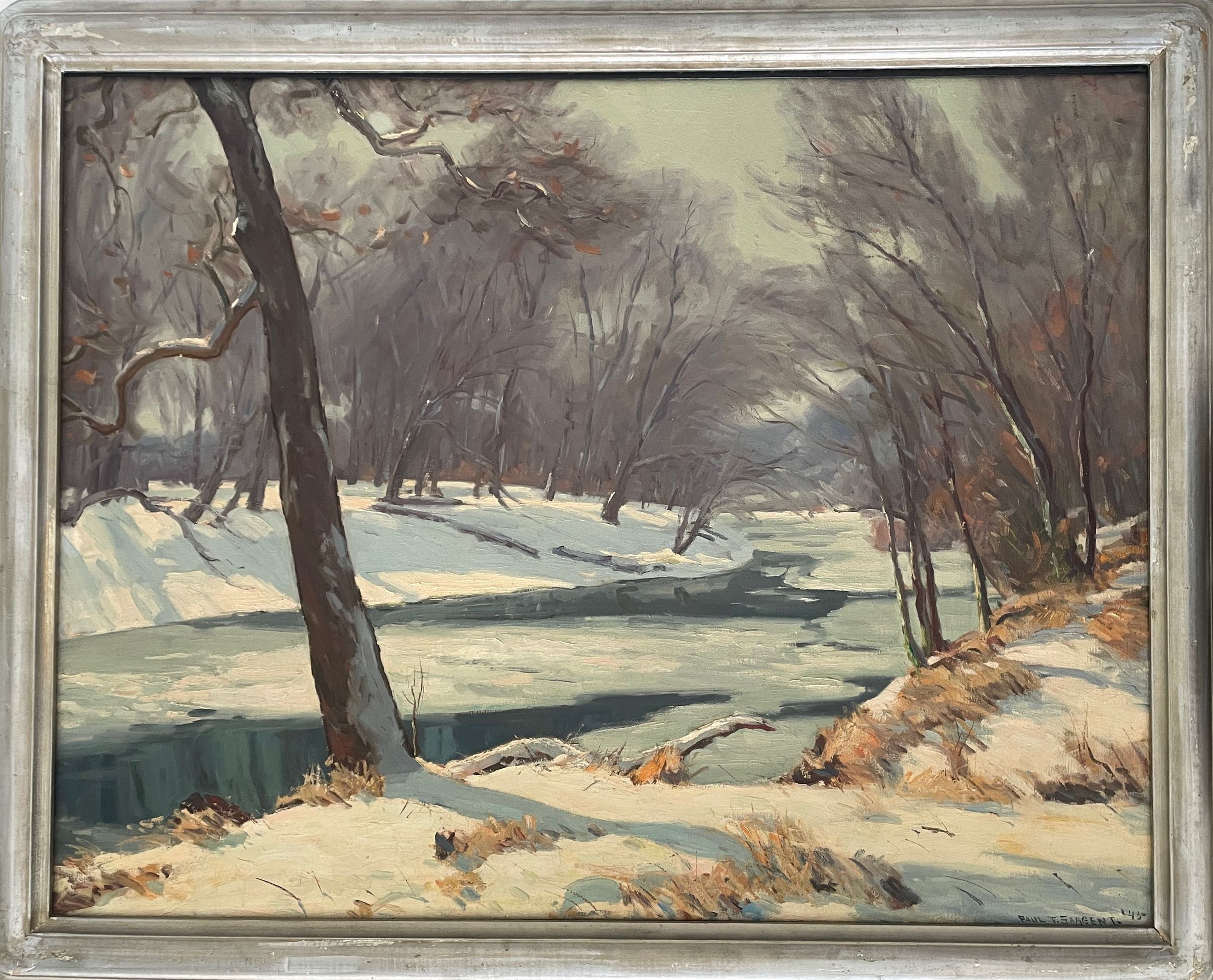 River with ice flowing through snow-covered woods. Signed: Paul T. Sargent-'45 in lower right corner. Wood frame with silver paint.Collection