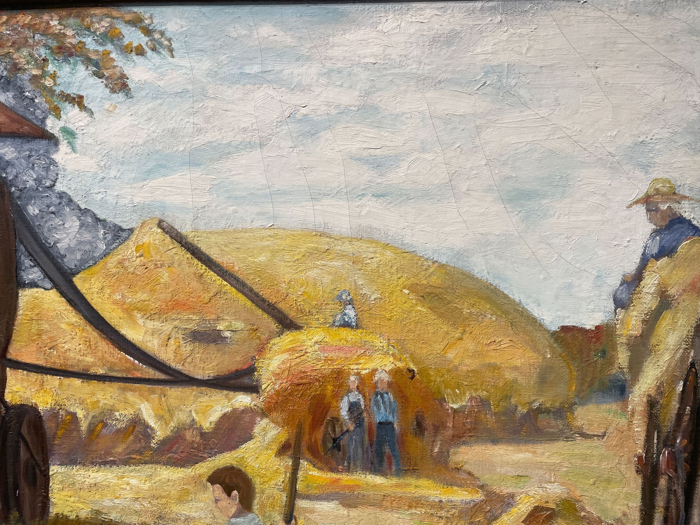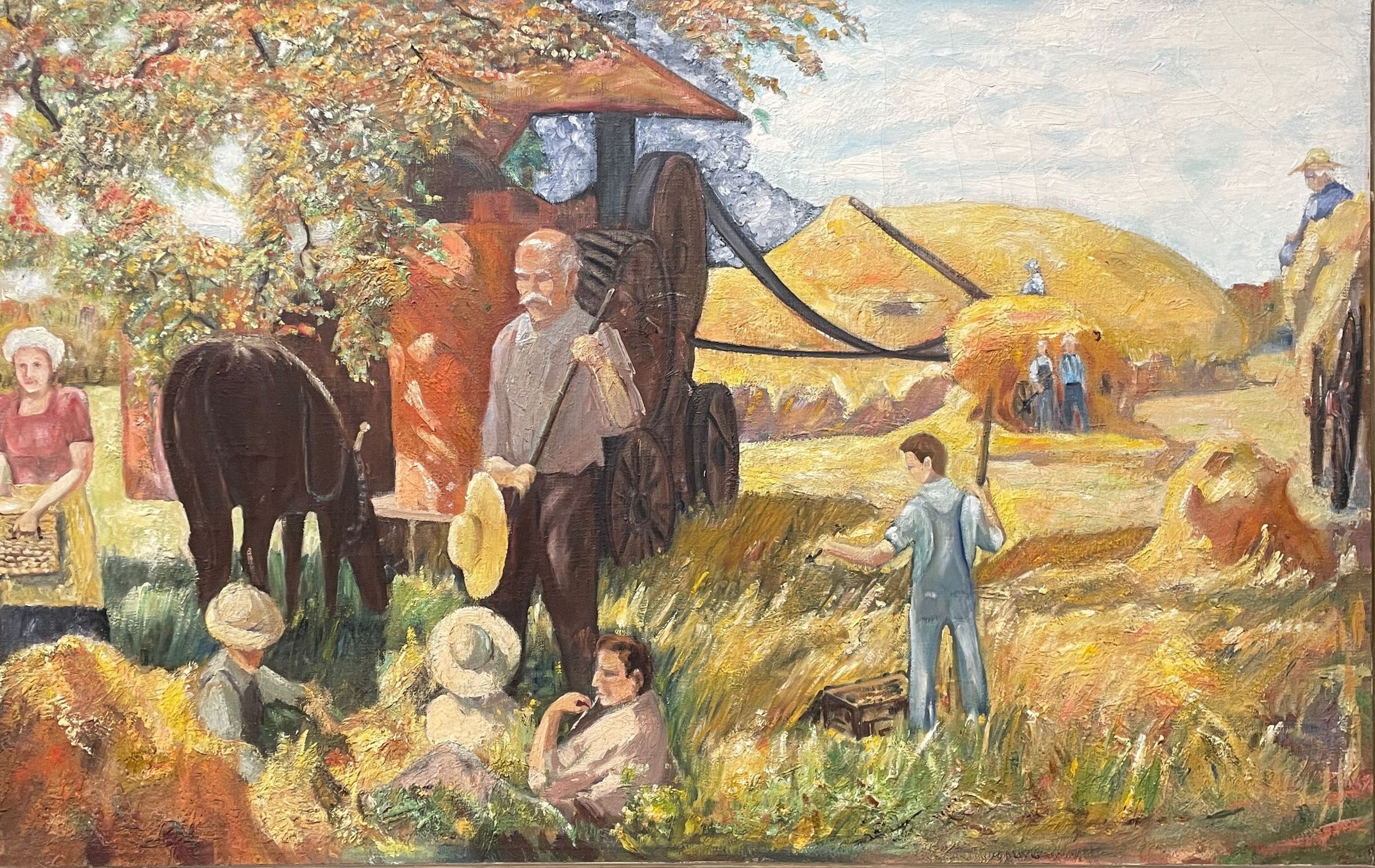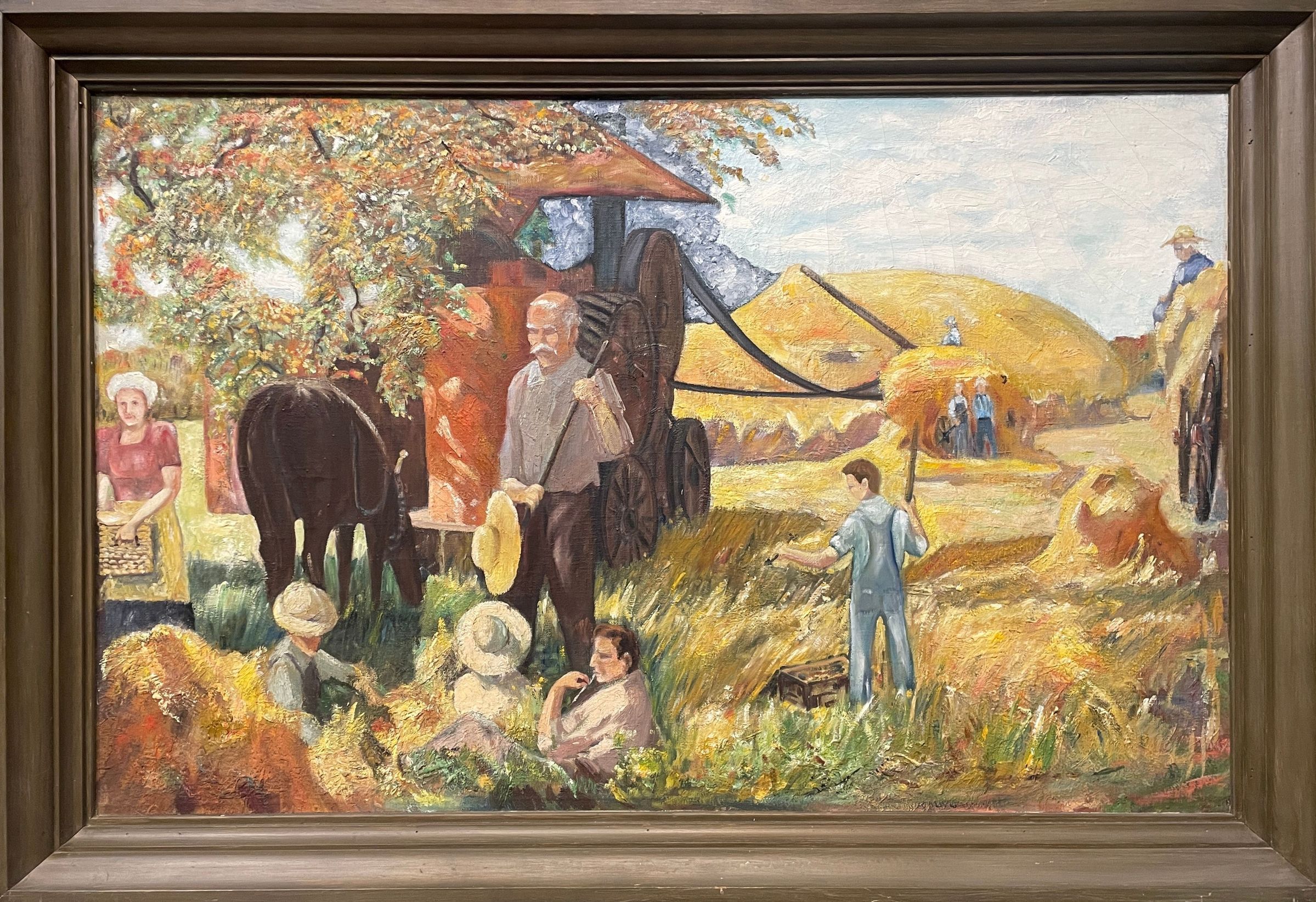 Harvest scene/people, steam engine in foreground left- Unsigned-rectangular-painted wood frame.Artwork Details