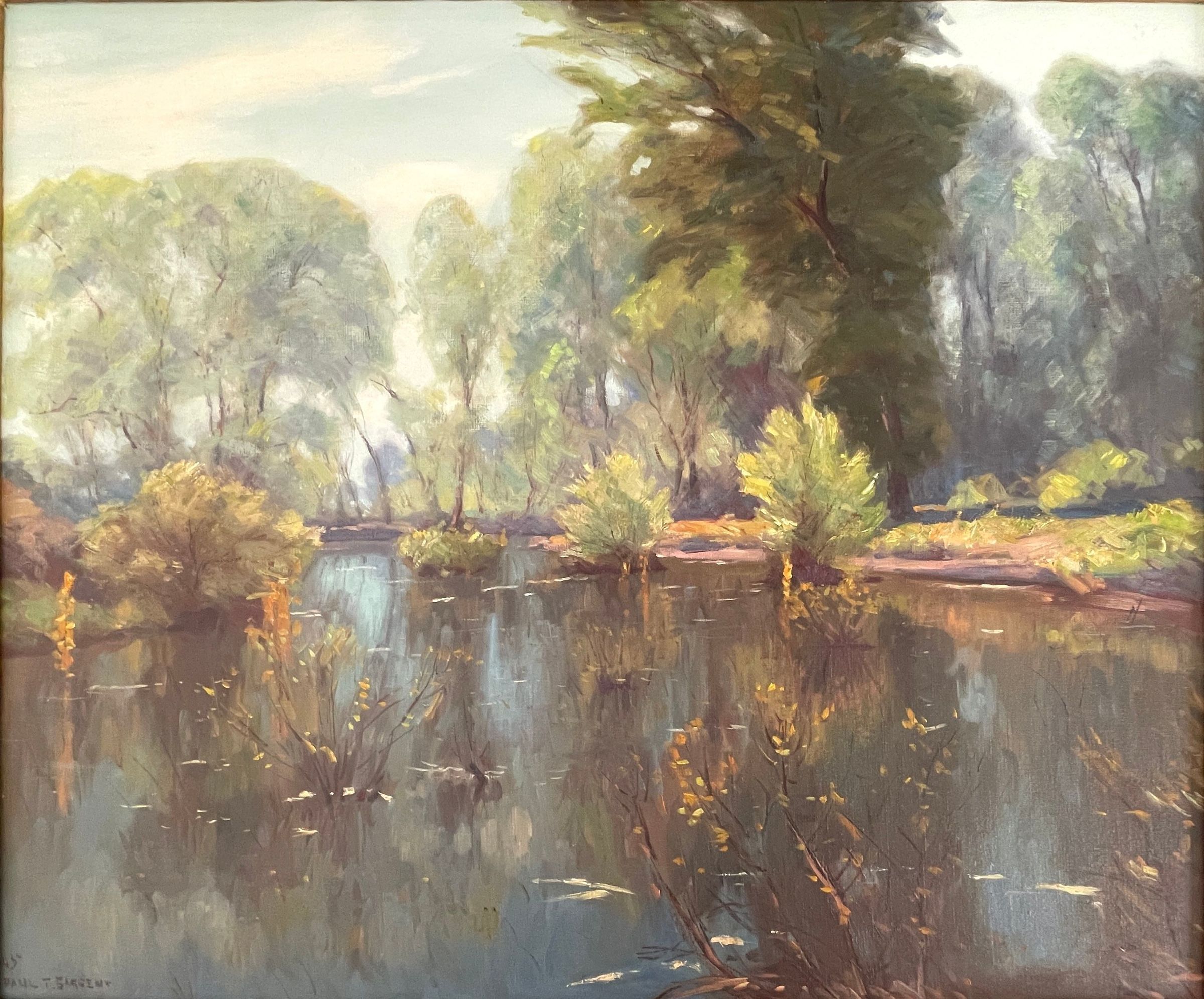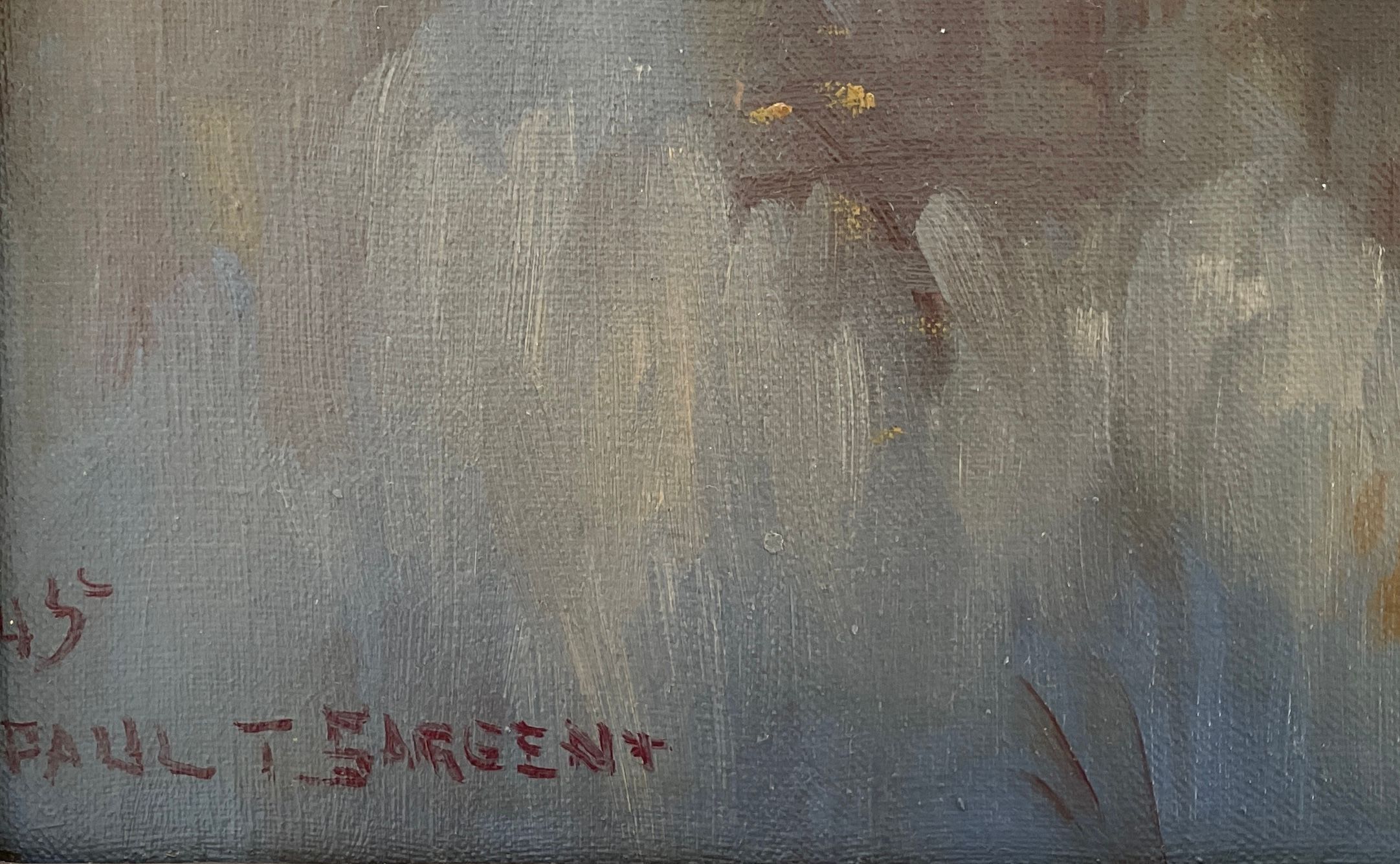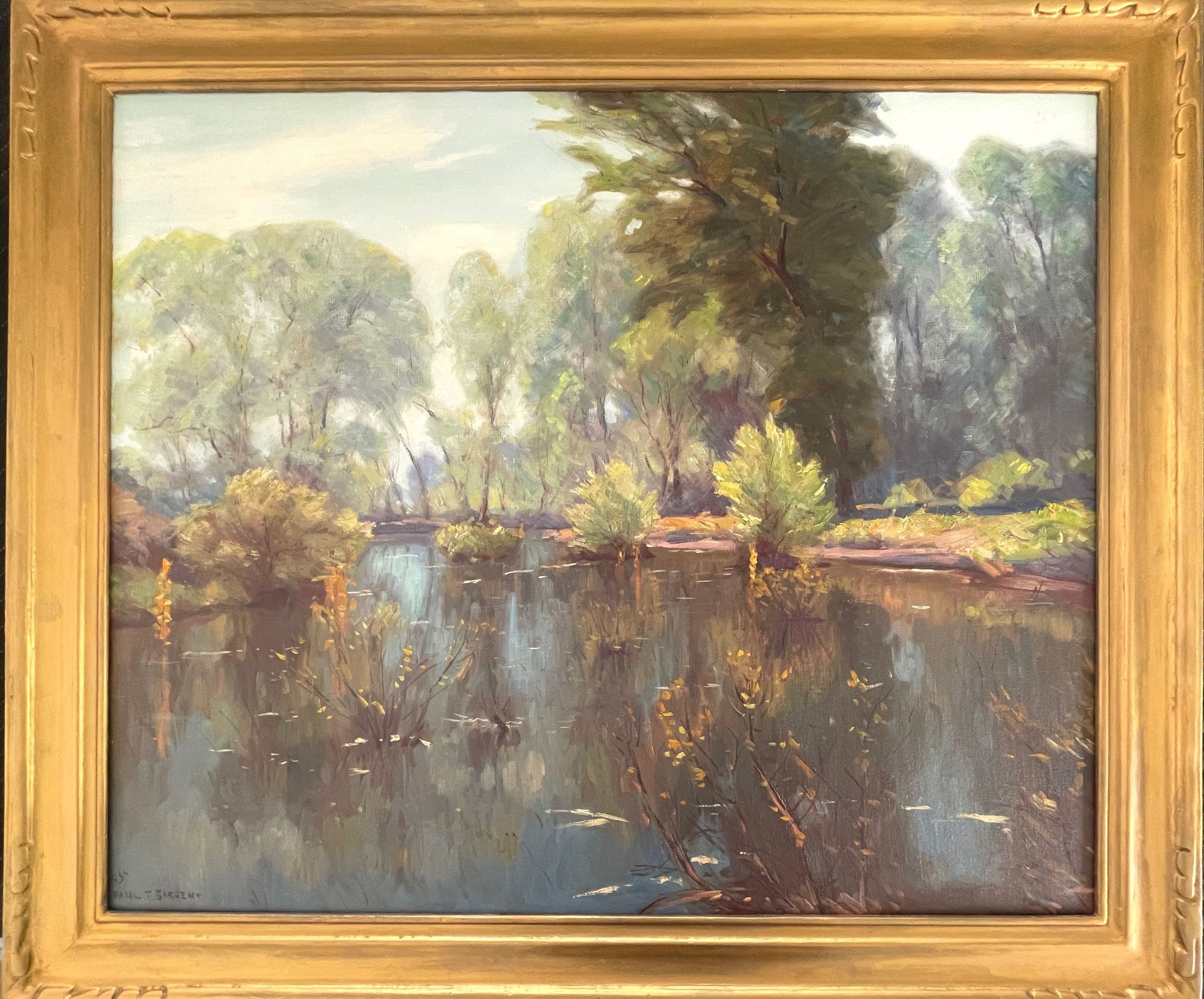 Landscape: spring scene with lake. Signed: "Paul T.Sargent-'45" in lower left corner. Frame: carved wood with gilt.Collection