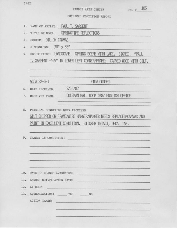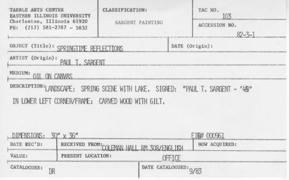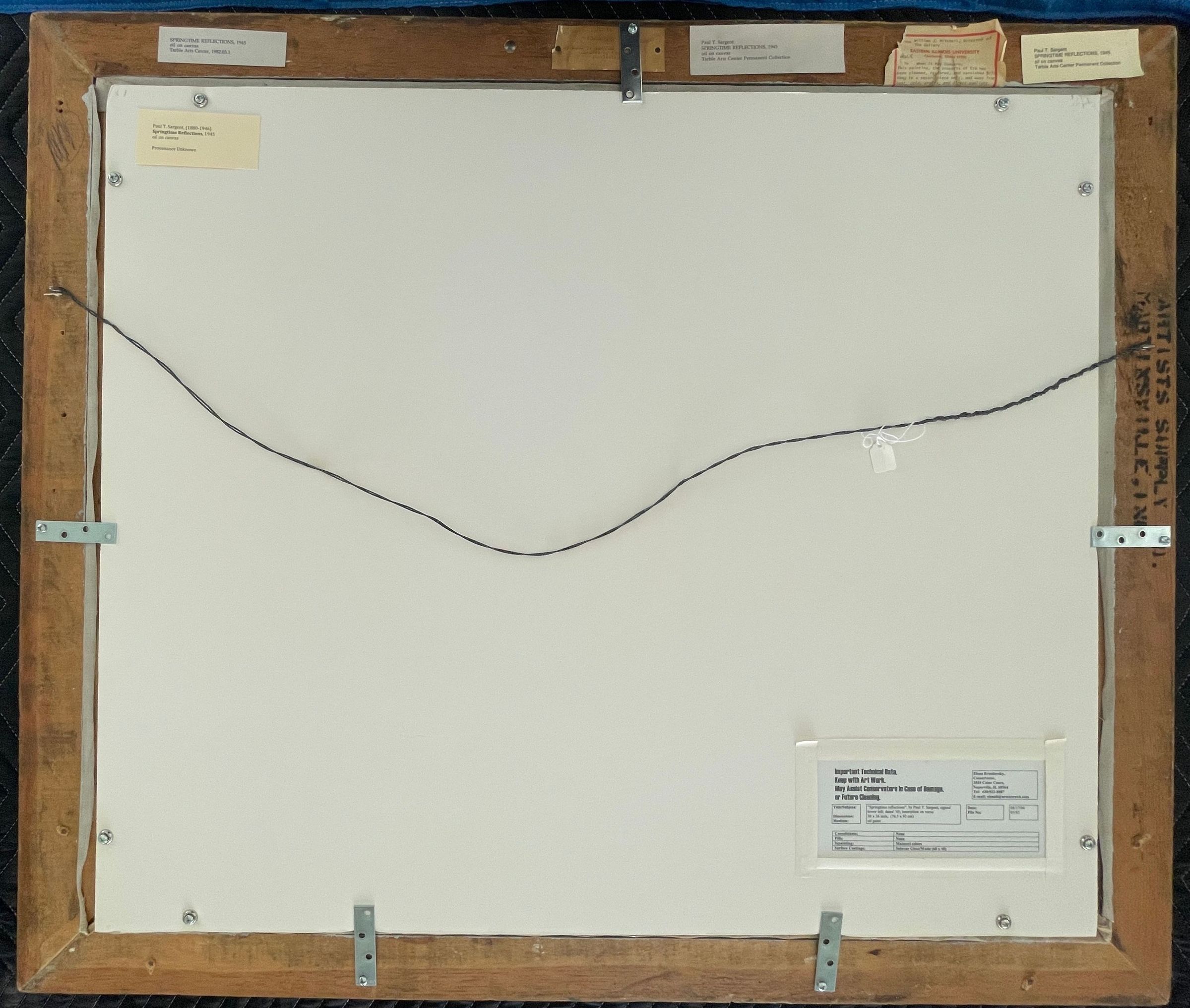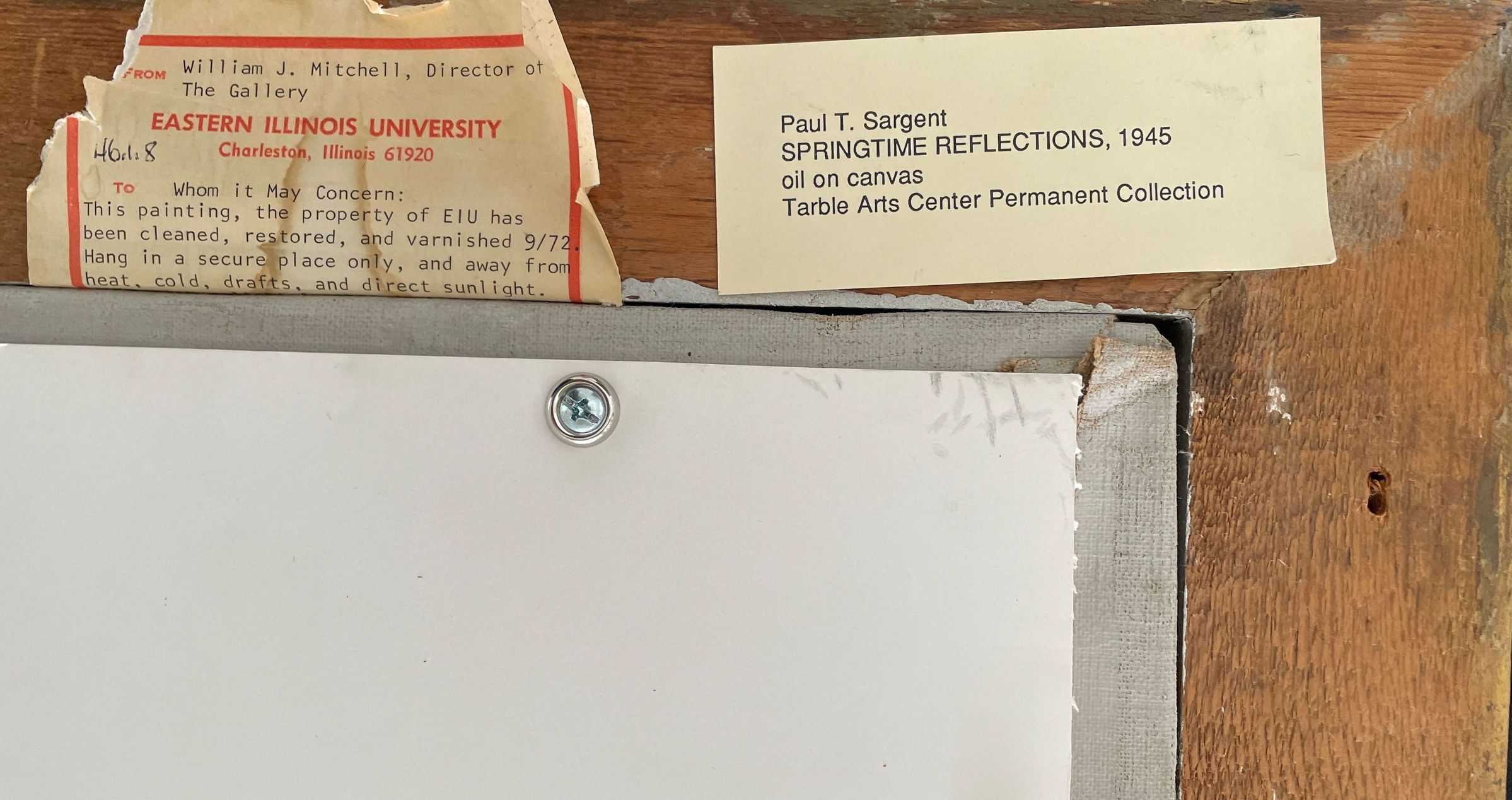 Landscape: spring scene with lake. Signed: "Paul T.Sargent-'45" in lower left corner. Frame: carved wood with gilt.Collection
