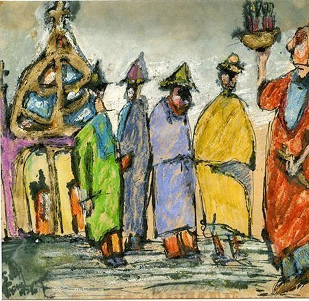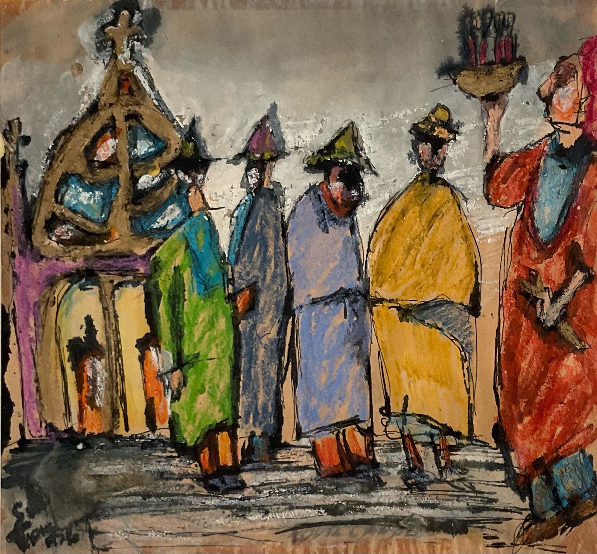 Four figures standing in center and one off to the right holding up an item. Figures are dressed in bright clothing (red- green- yellow- purple- and blue) and are standing to the right of a gold shrine or church.Artwork Details