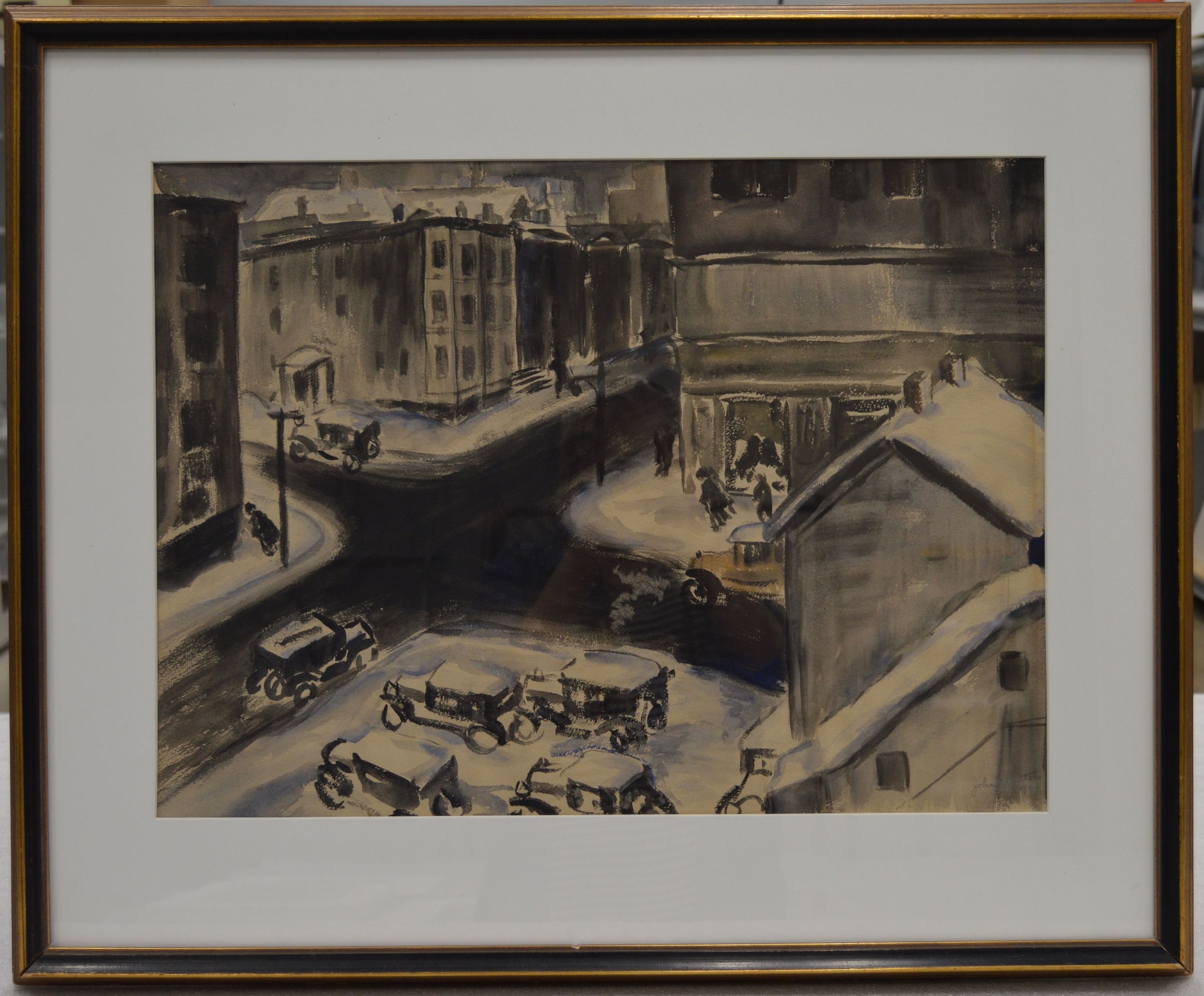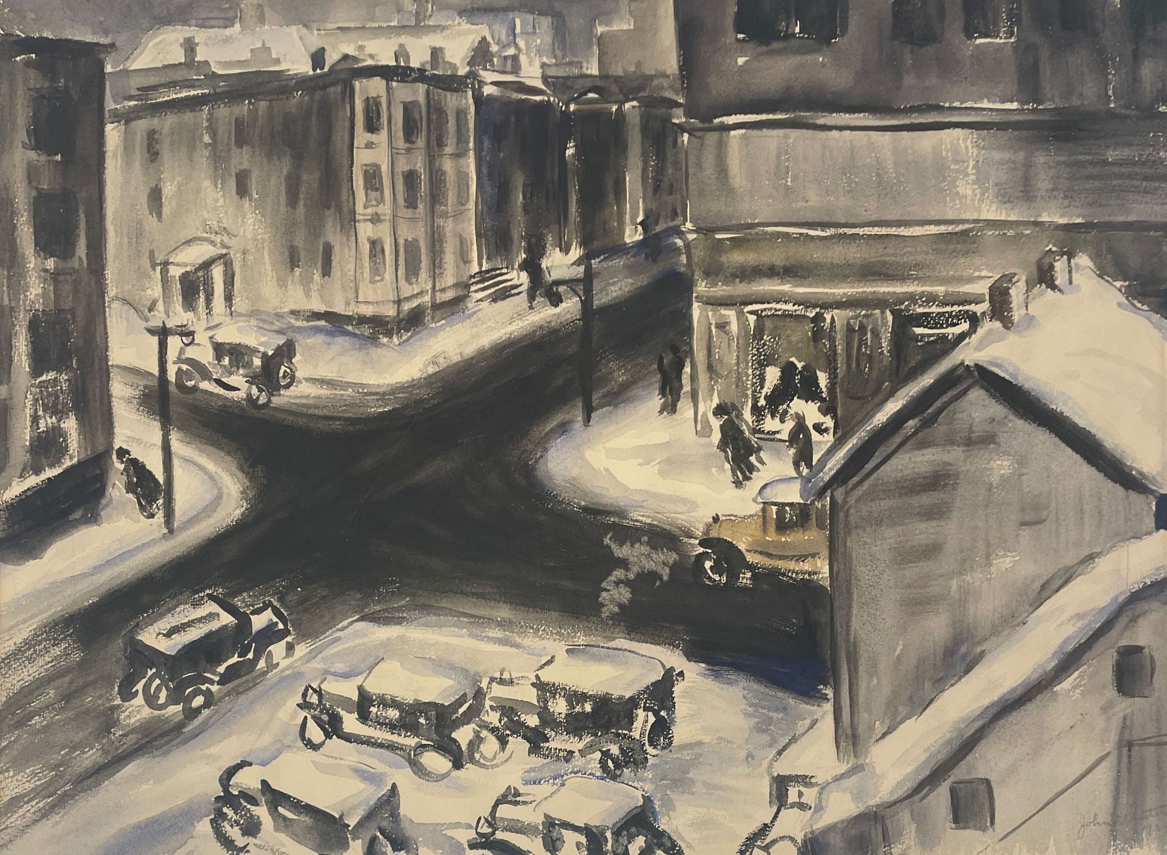 city corner- big black x in middle of painting- black- grey- white with a touch of blue.produced under the auspices of the Works Progress Administration (WPA).inscription (stamp) on verso of sheet: "Property of U. S. Government."Collection