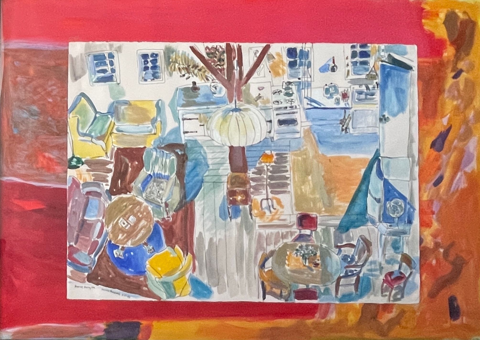 horizontal; aerial view of a house's interior; couches tables kitchen appliances etc. are visible in rooms throughout the house; house is a converted barn; signed lower left; Interior Barn P.M. Paulette Thenhaus 5/27/87Collection
