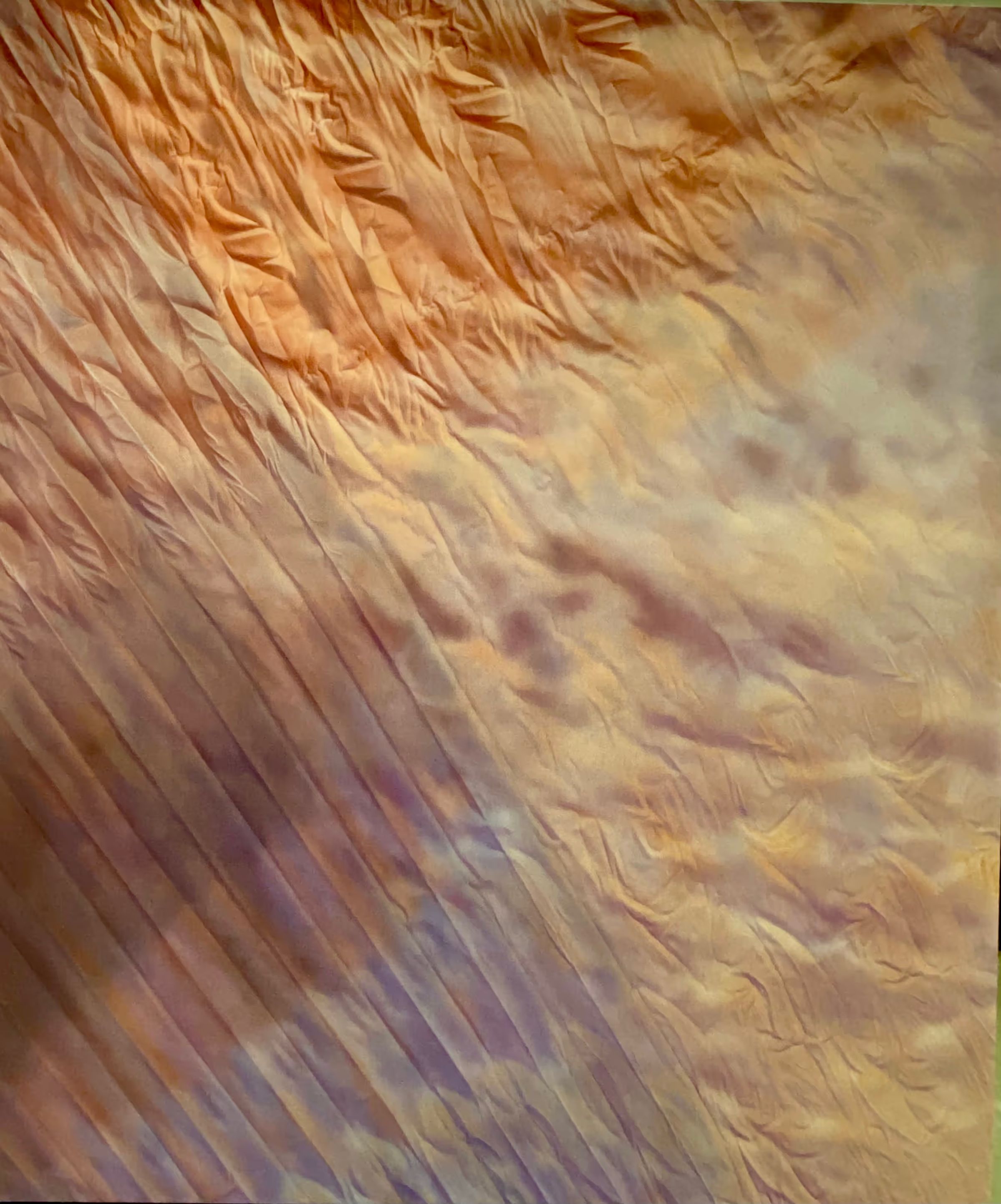 Large work in tones of purple and pinks. Looks kind of like crinkled tie-dye. Painting wraps around unframed edges.Artwork Details