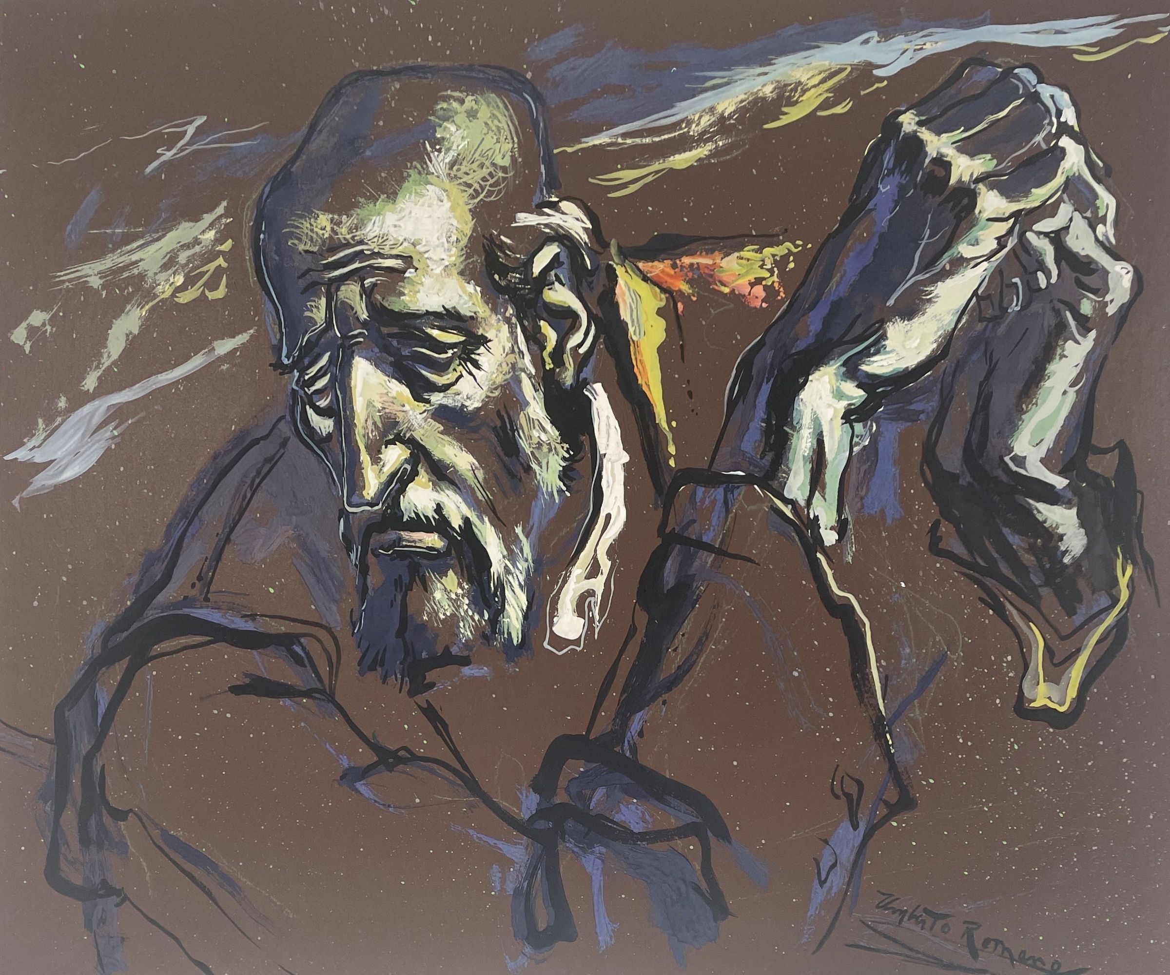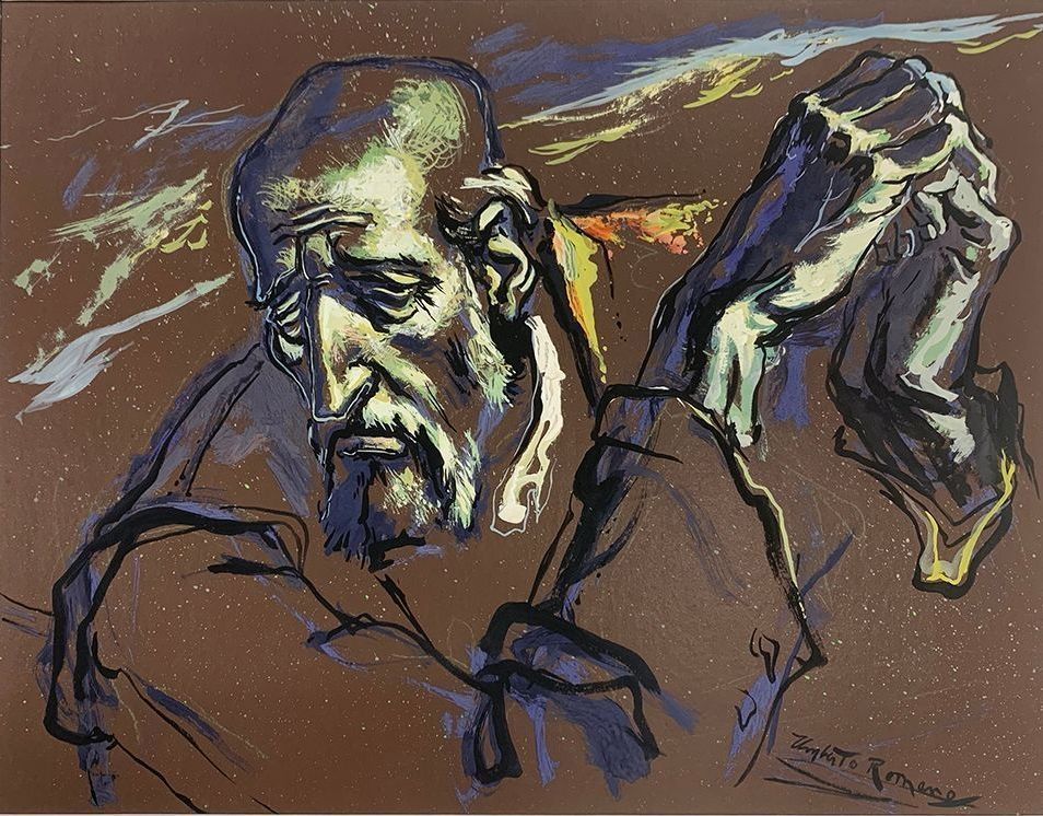 Man with beard and mustache with up raised clasped hands.Artwork Details
