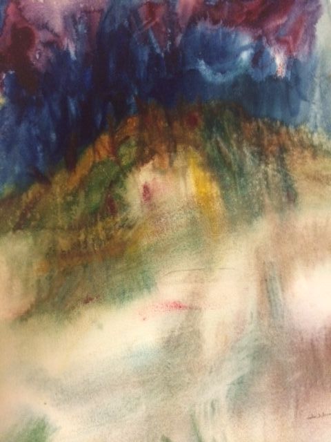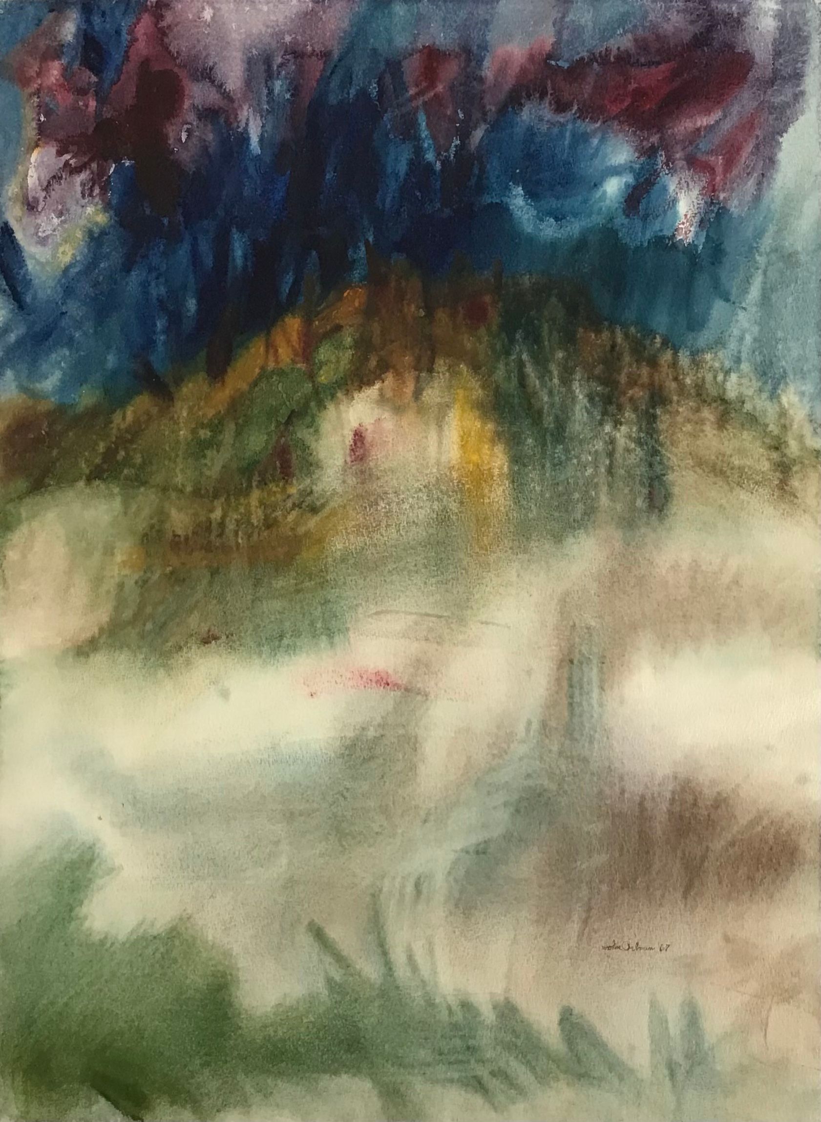 Wash, no direct shapes, level, maroon, navy gold and green. Gold tone metal frame, white mat and glass cover.Collection