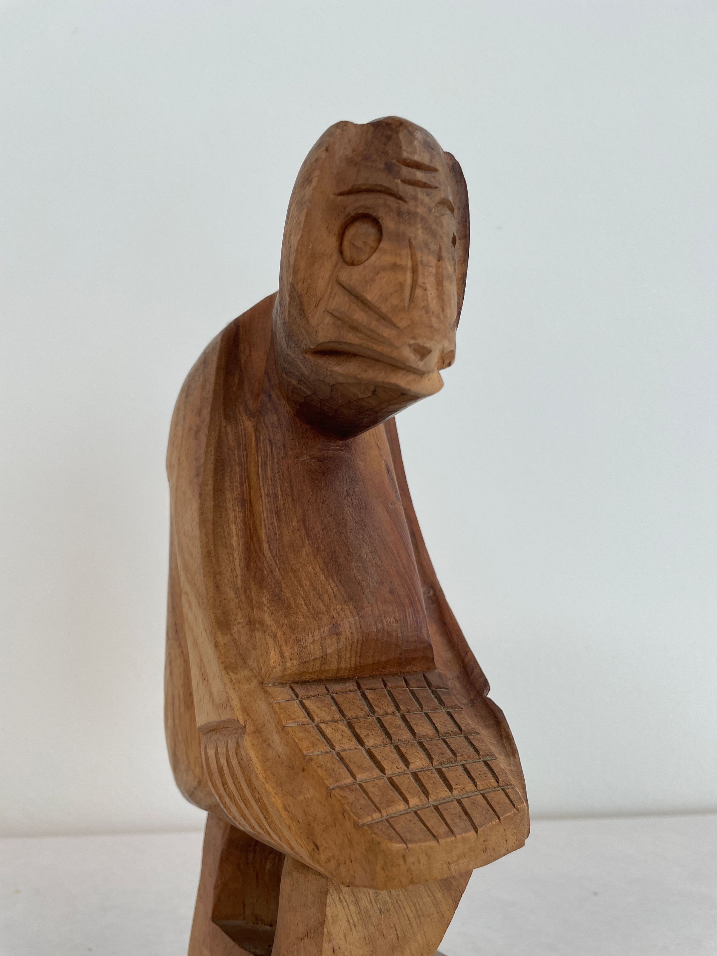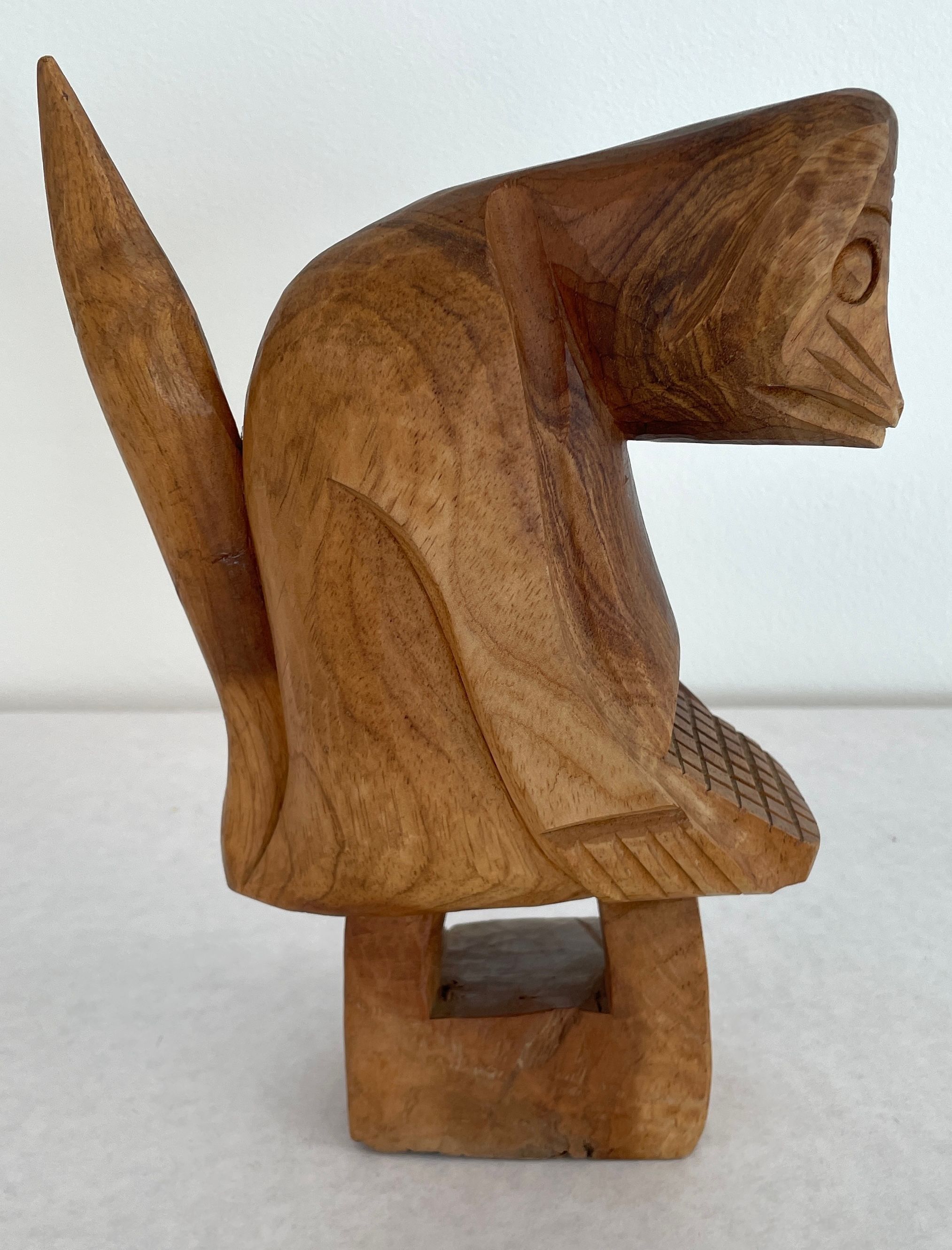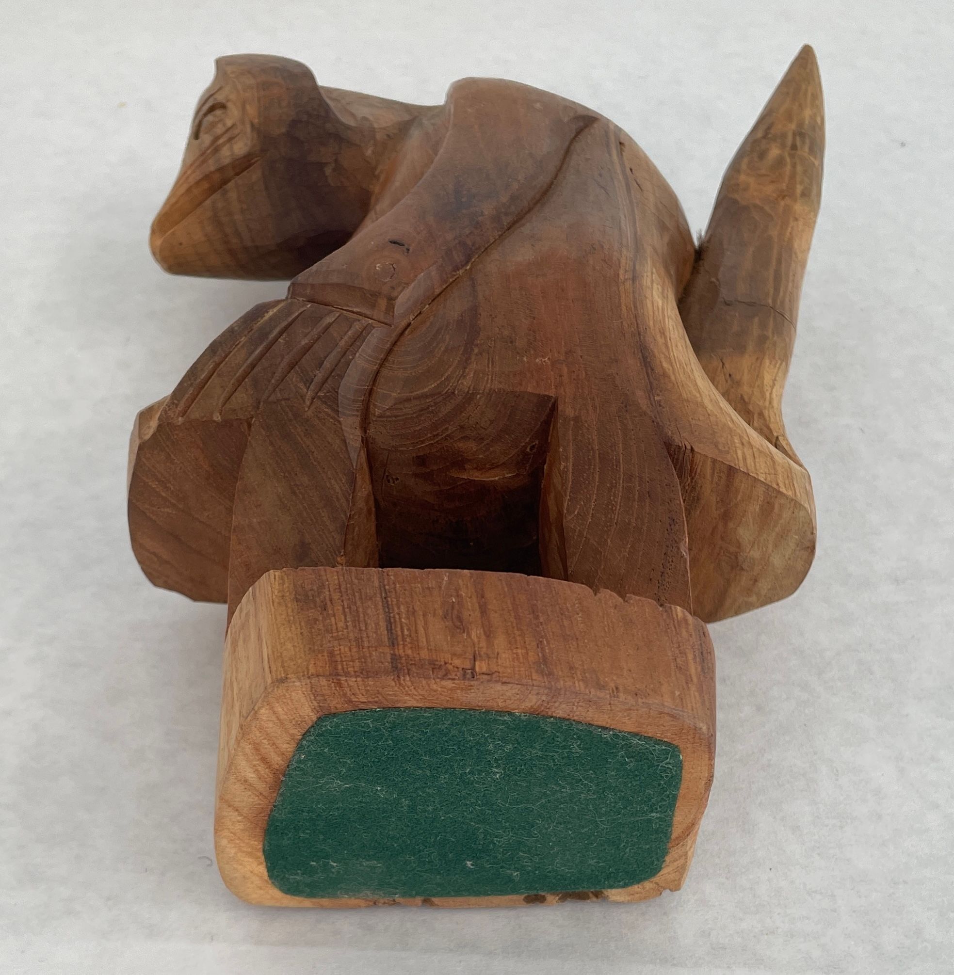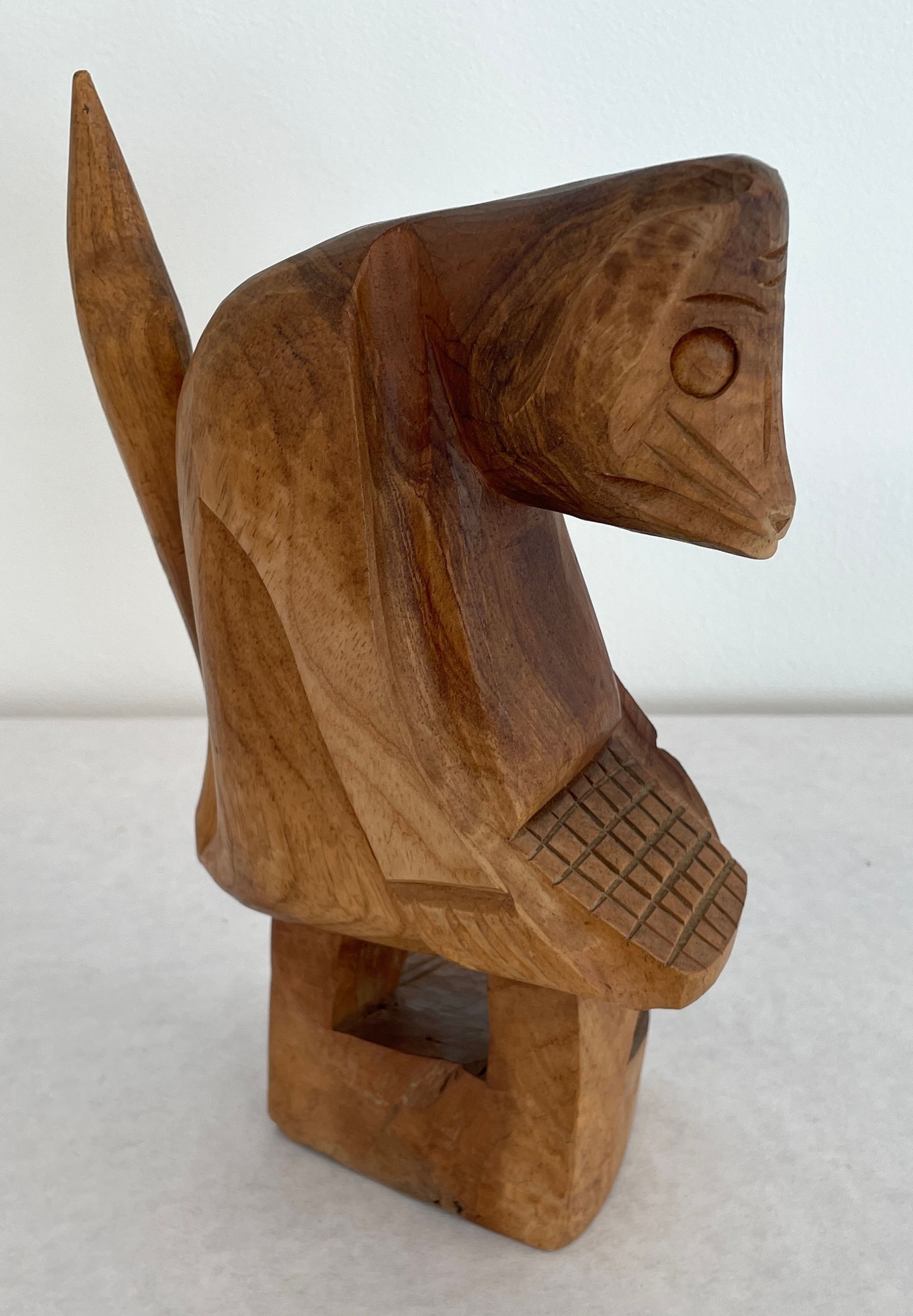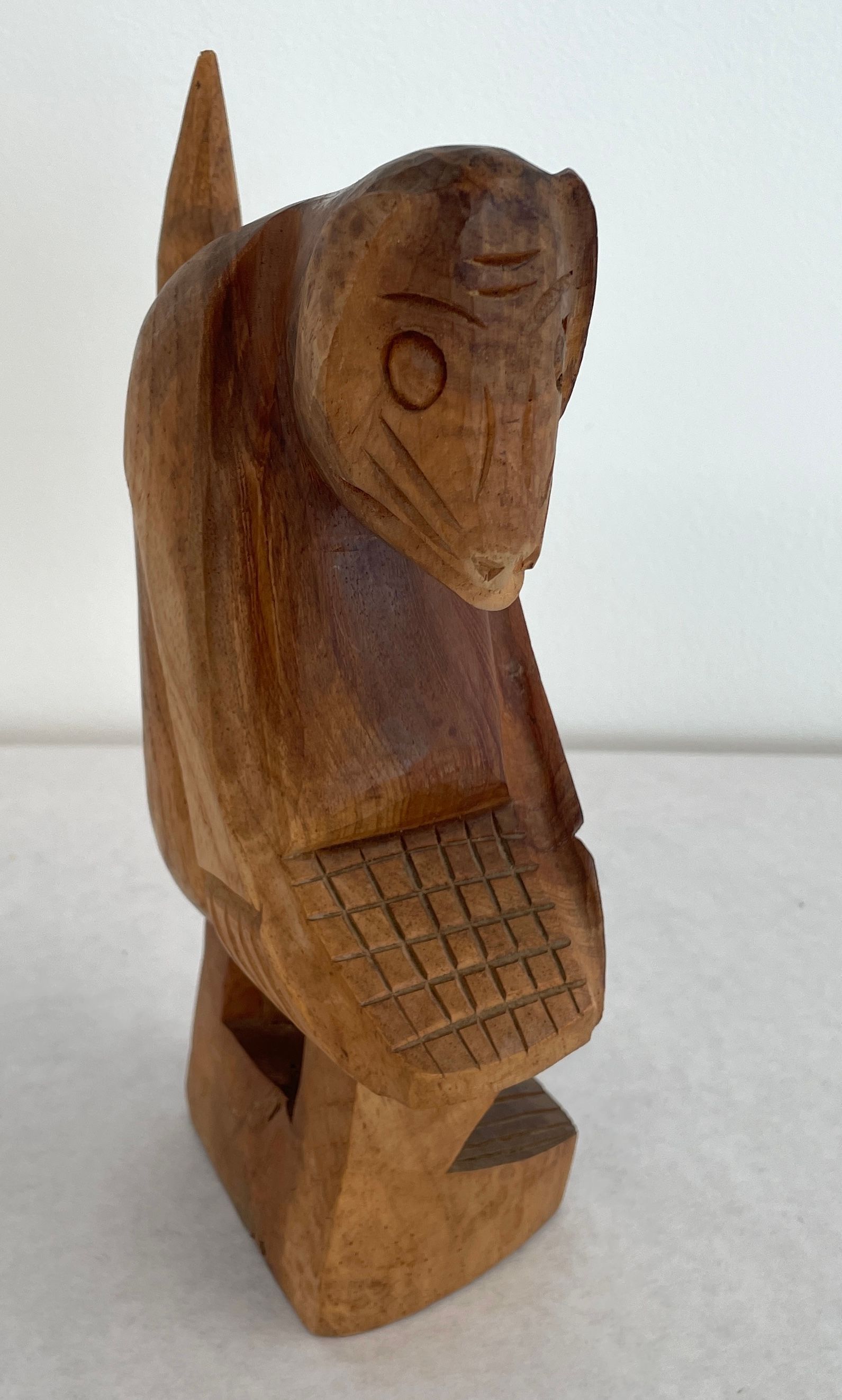 Carved wood sculpture of stylized Possum. Is standing on hind legs with tail sticking vertically in air Front view has possum facing PR.