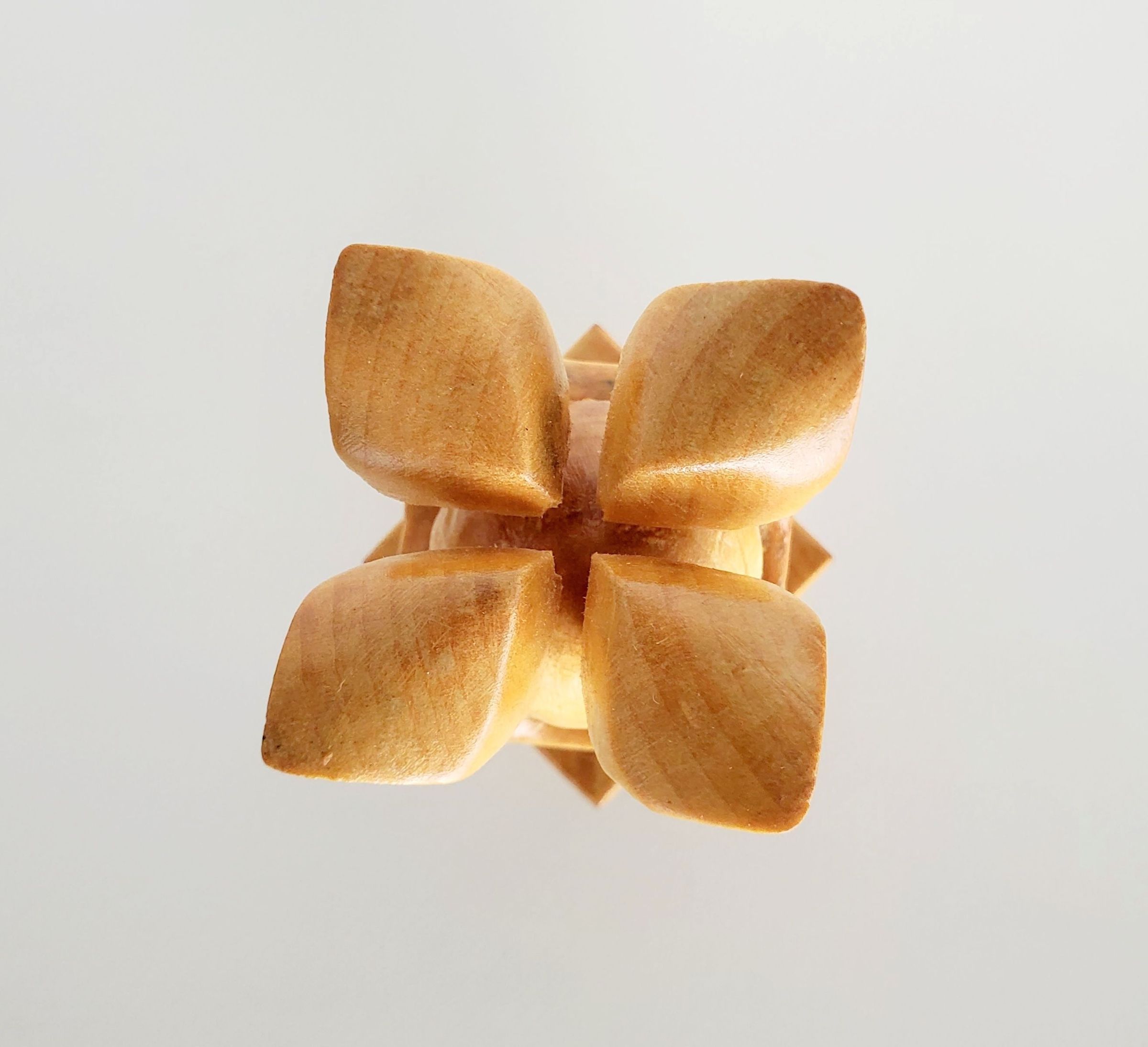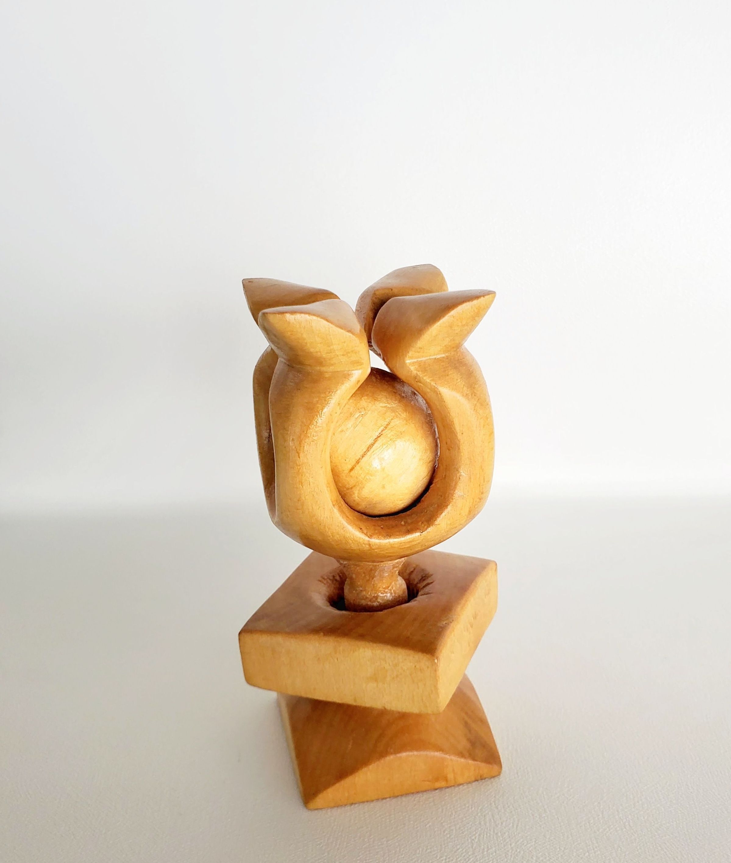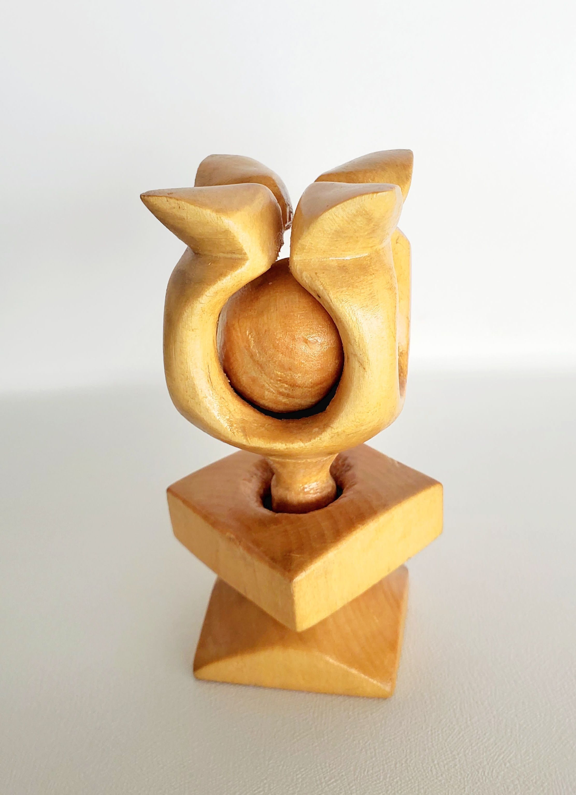 Light wood carved form. abstact tulip form on top holding a loose ball. Stem narrows holding a rounded square bangle.Collection