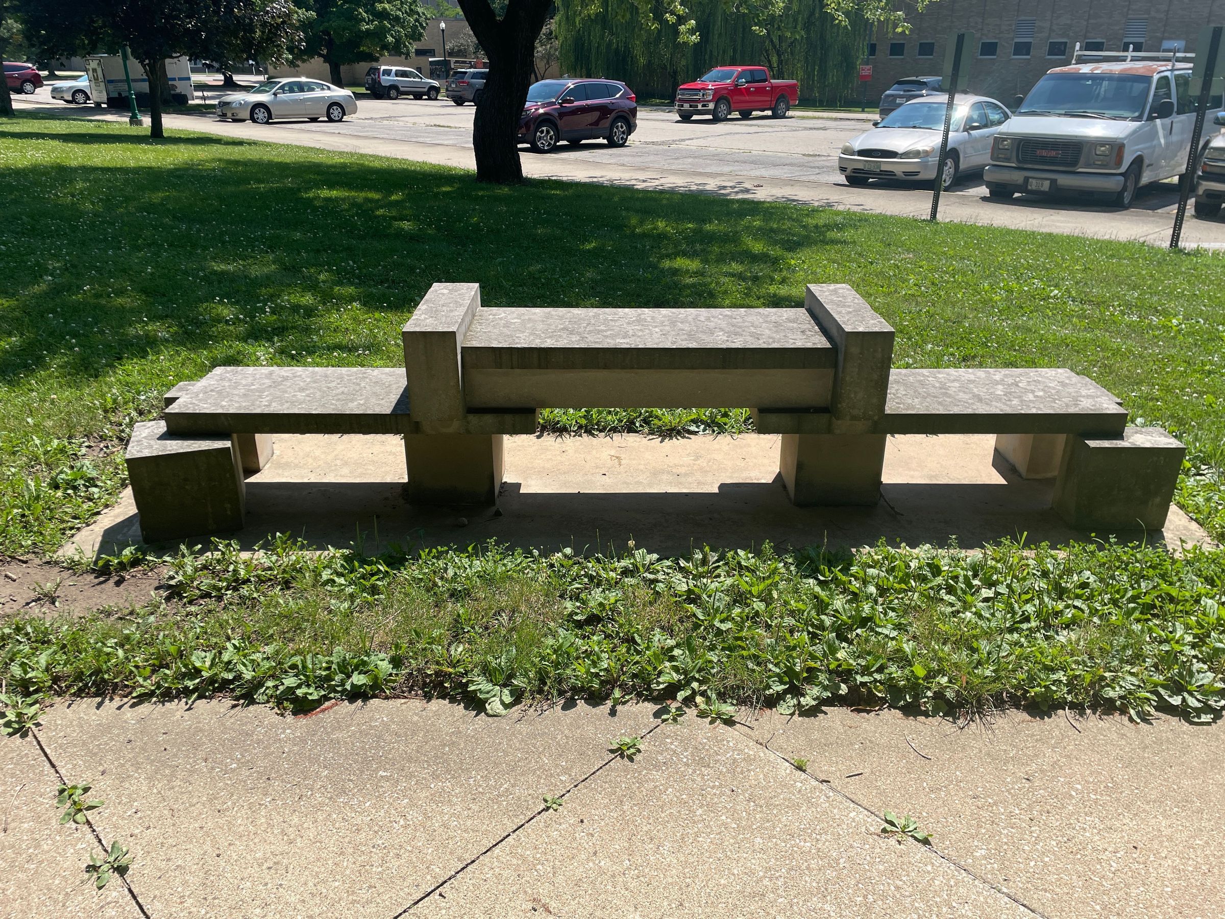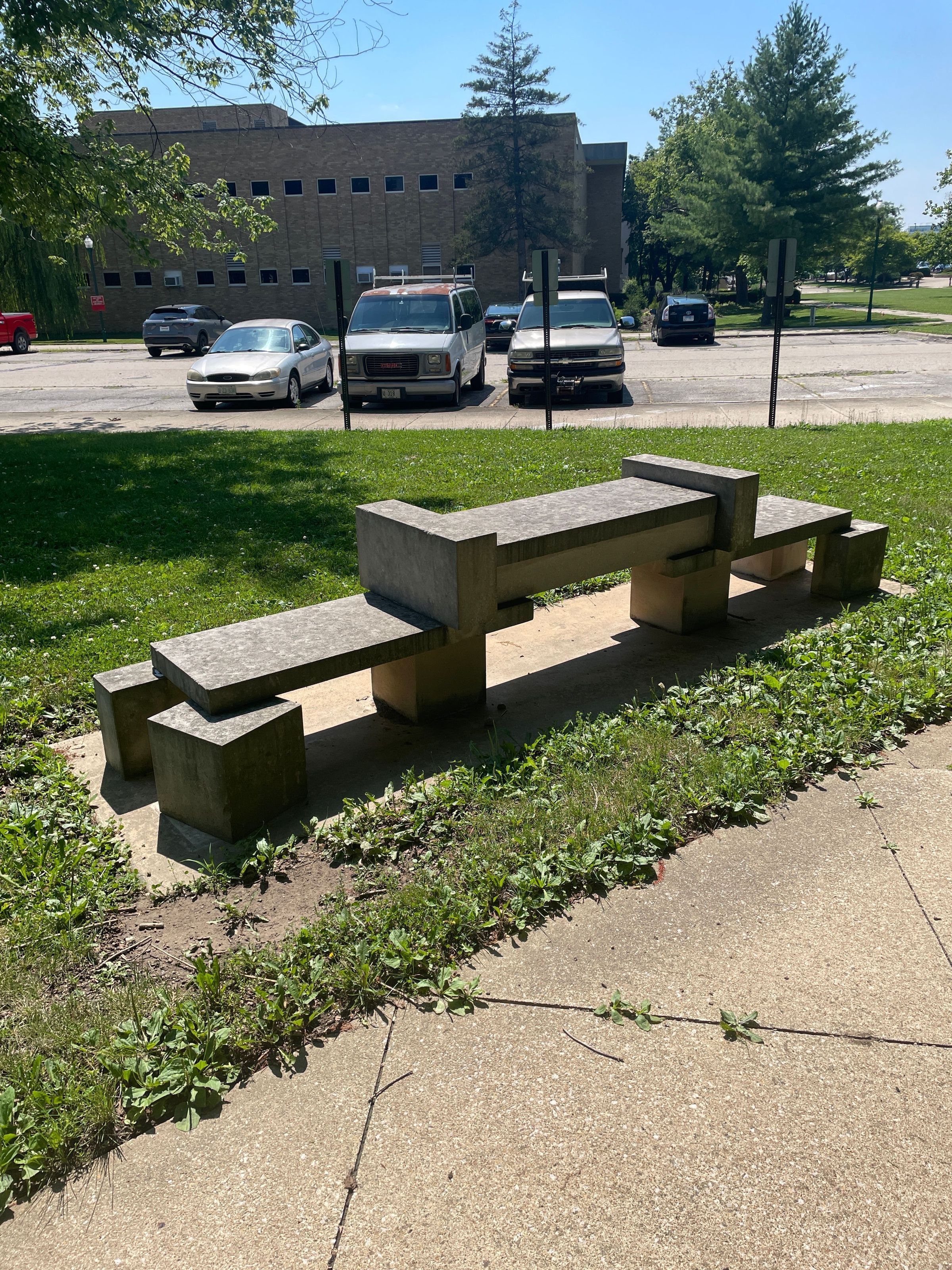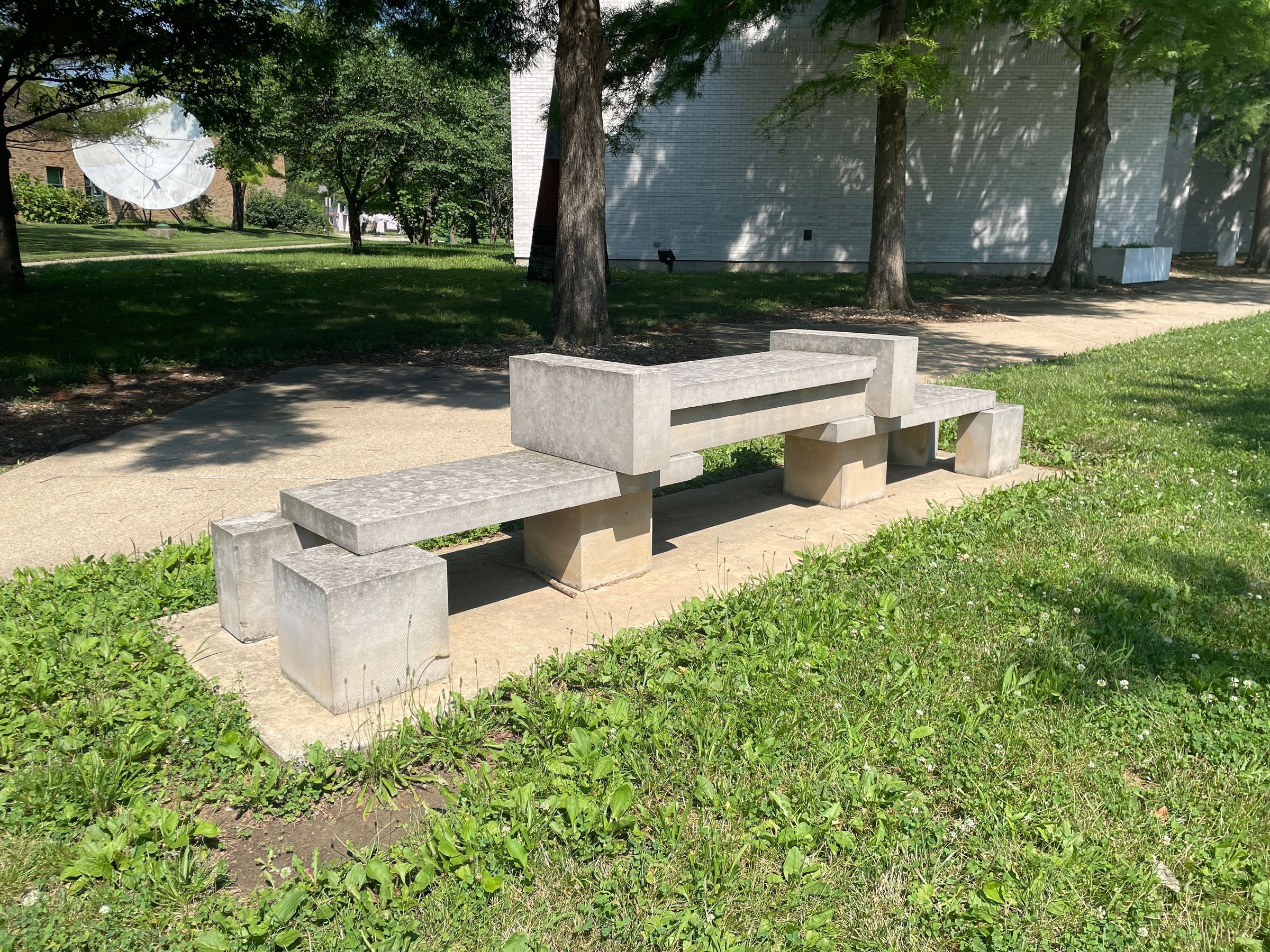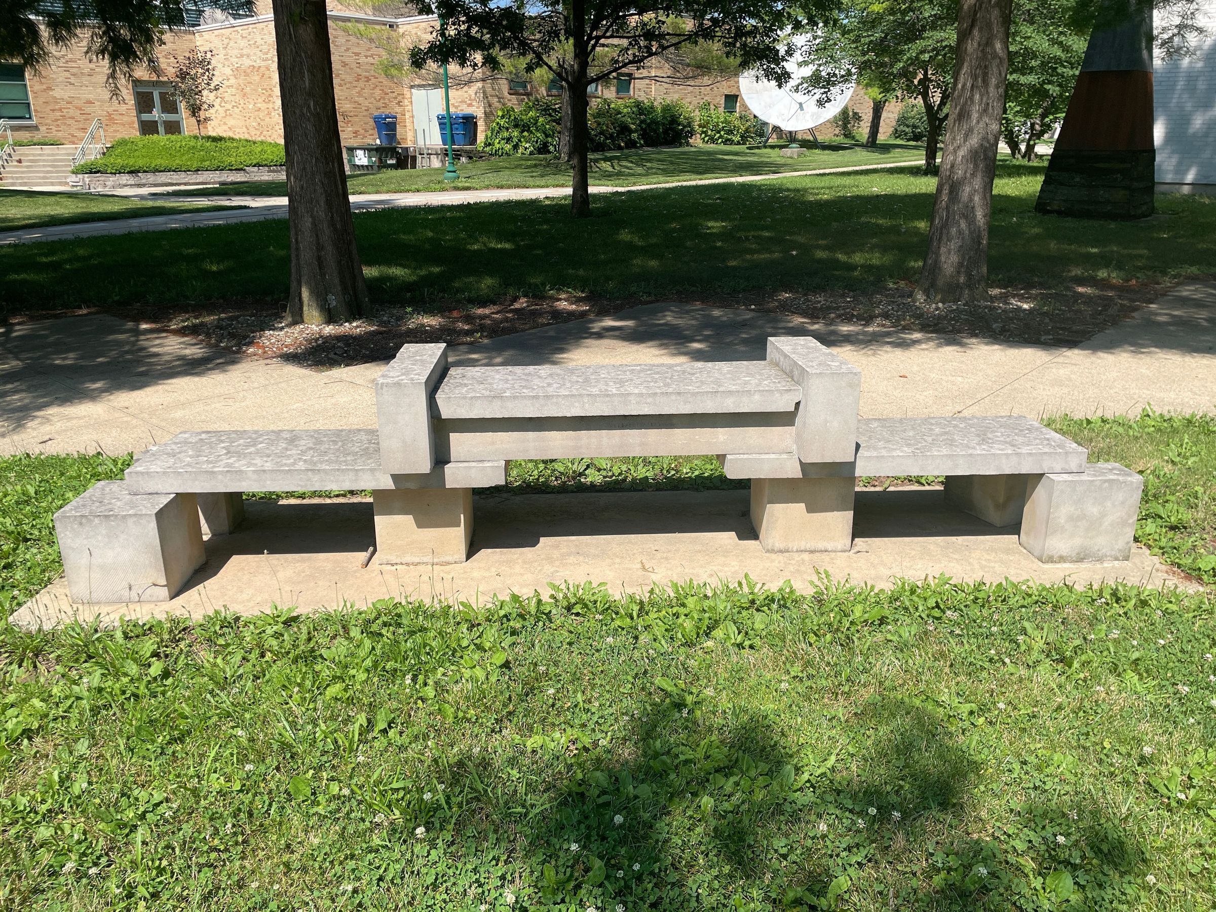 Architectural limestone Sculpture bench. Grey in color. Comprised of vertical and horizontal slabs. Center section elevated.Collection