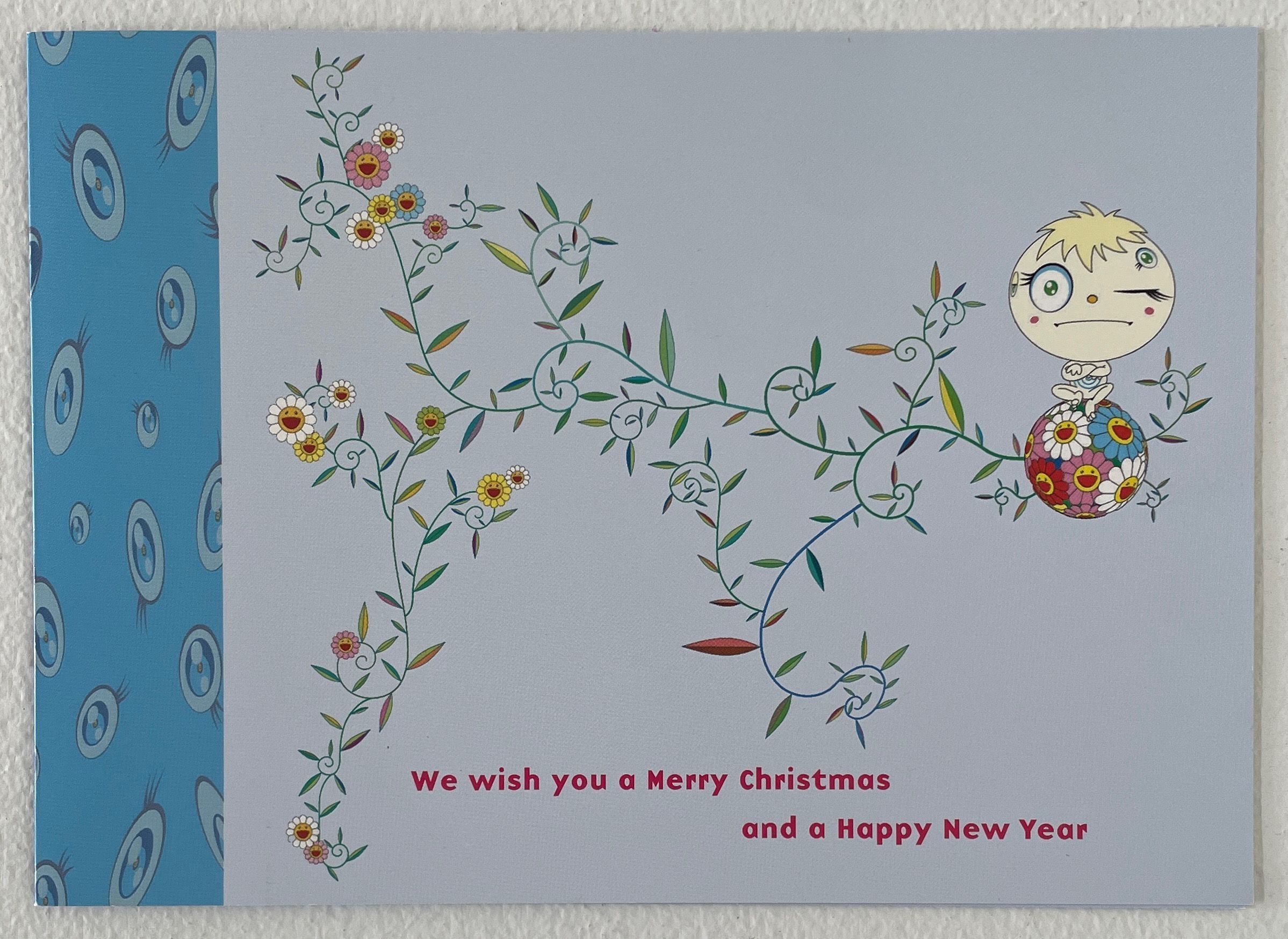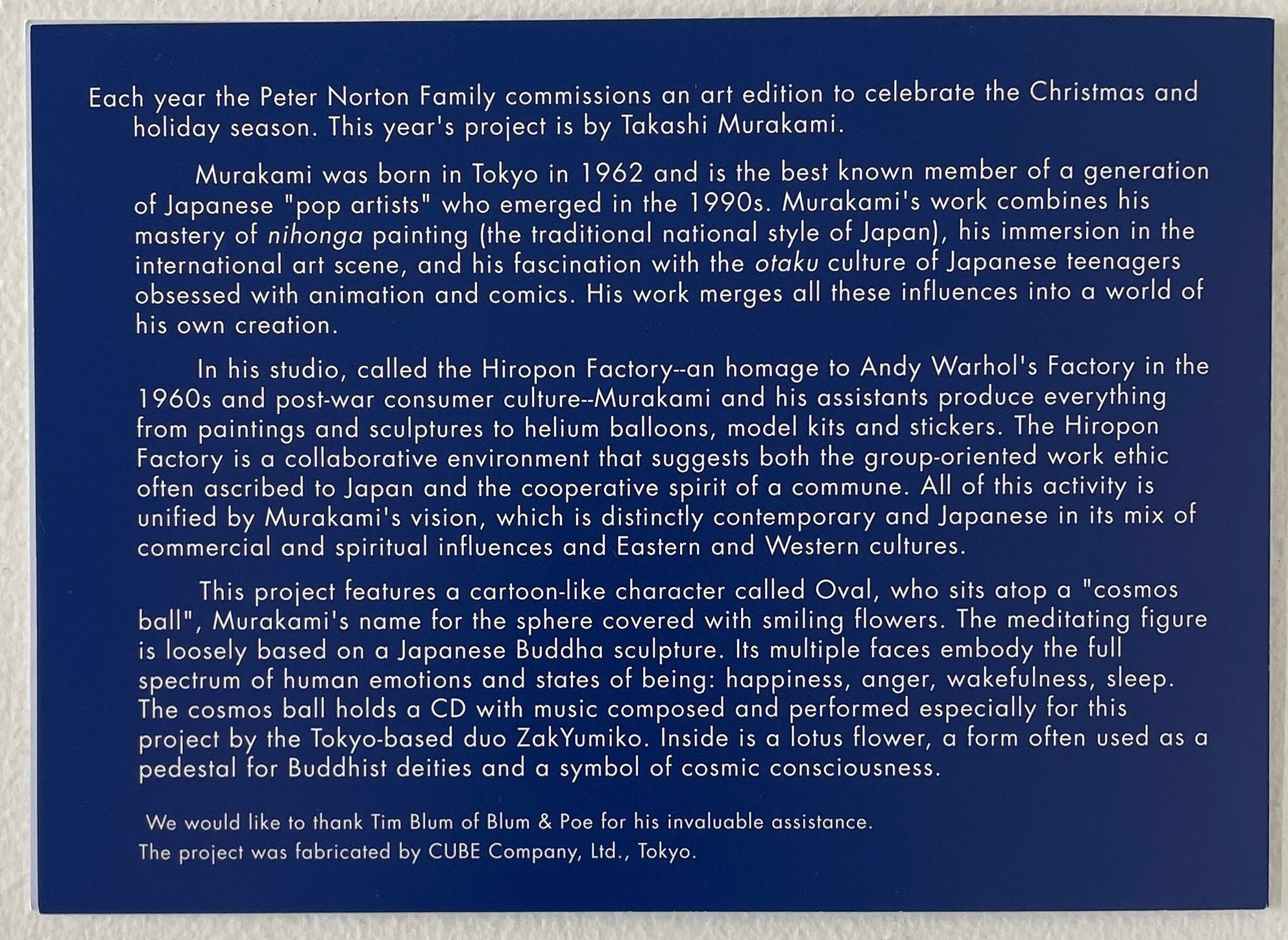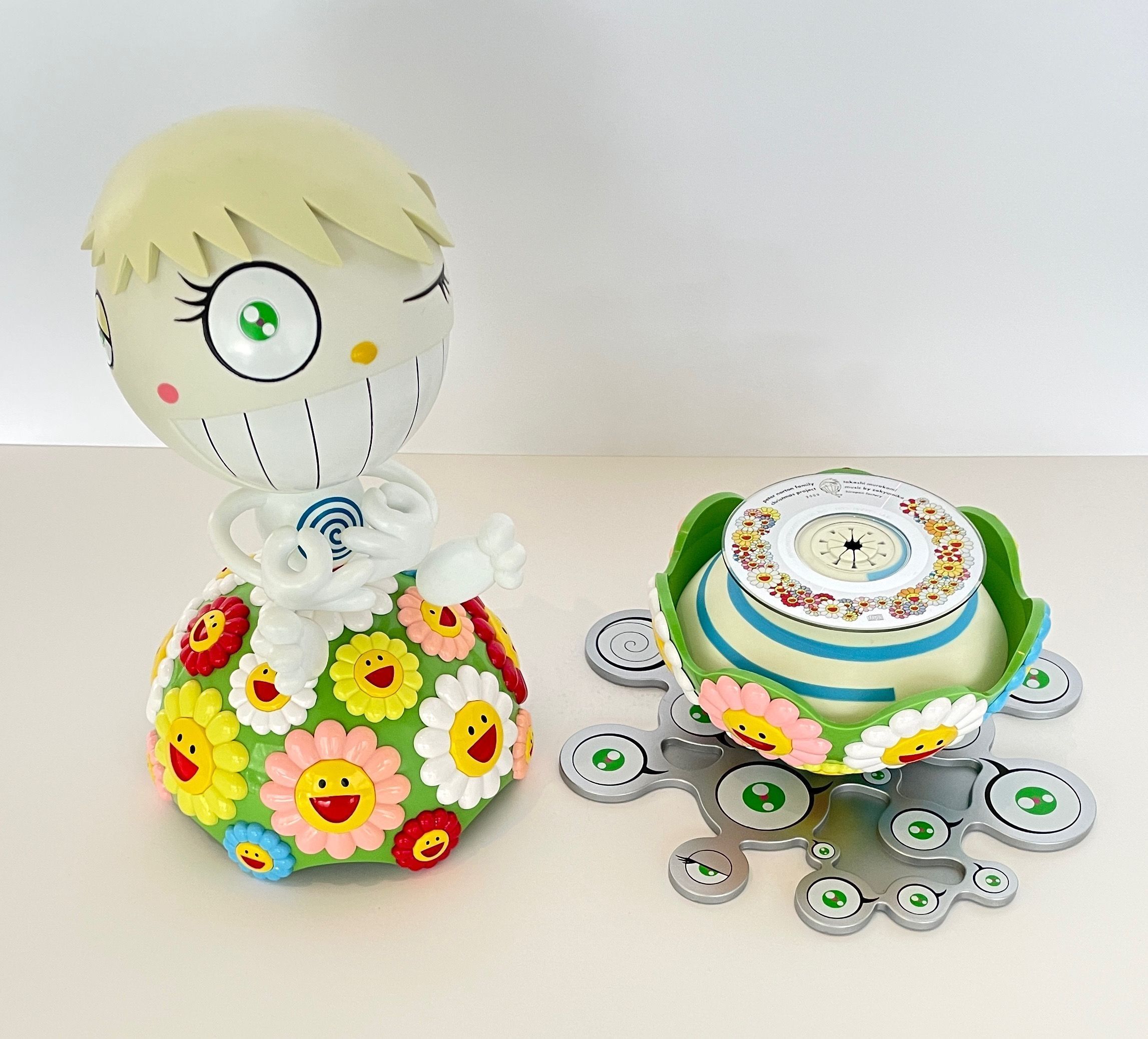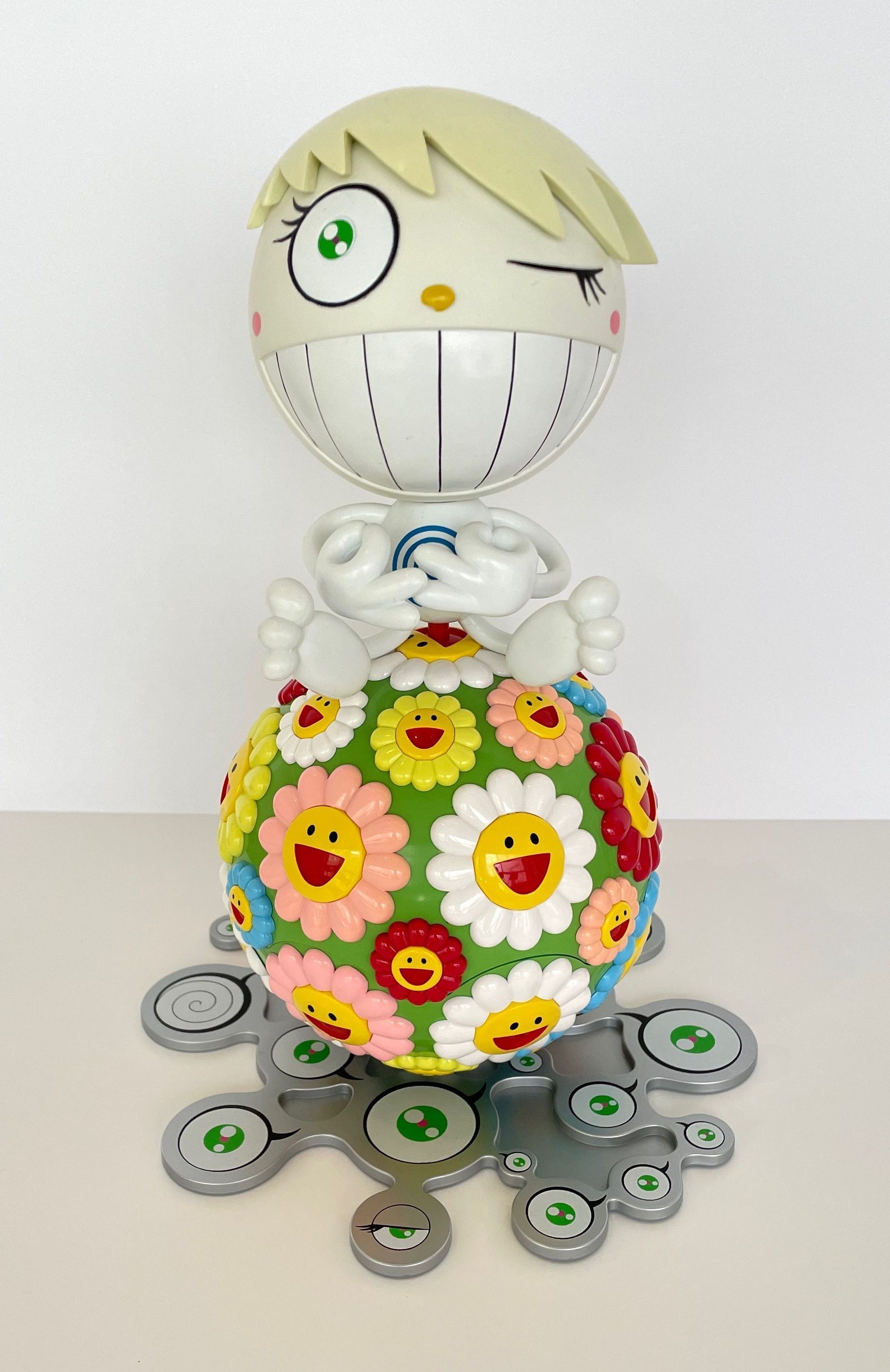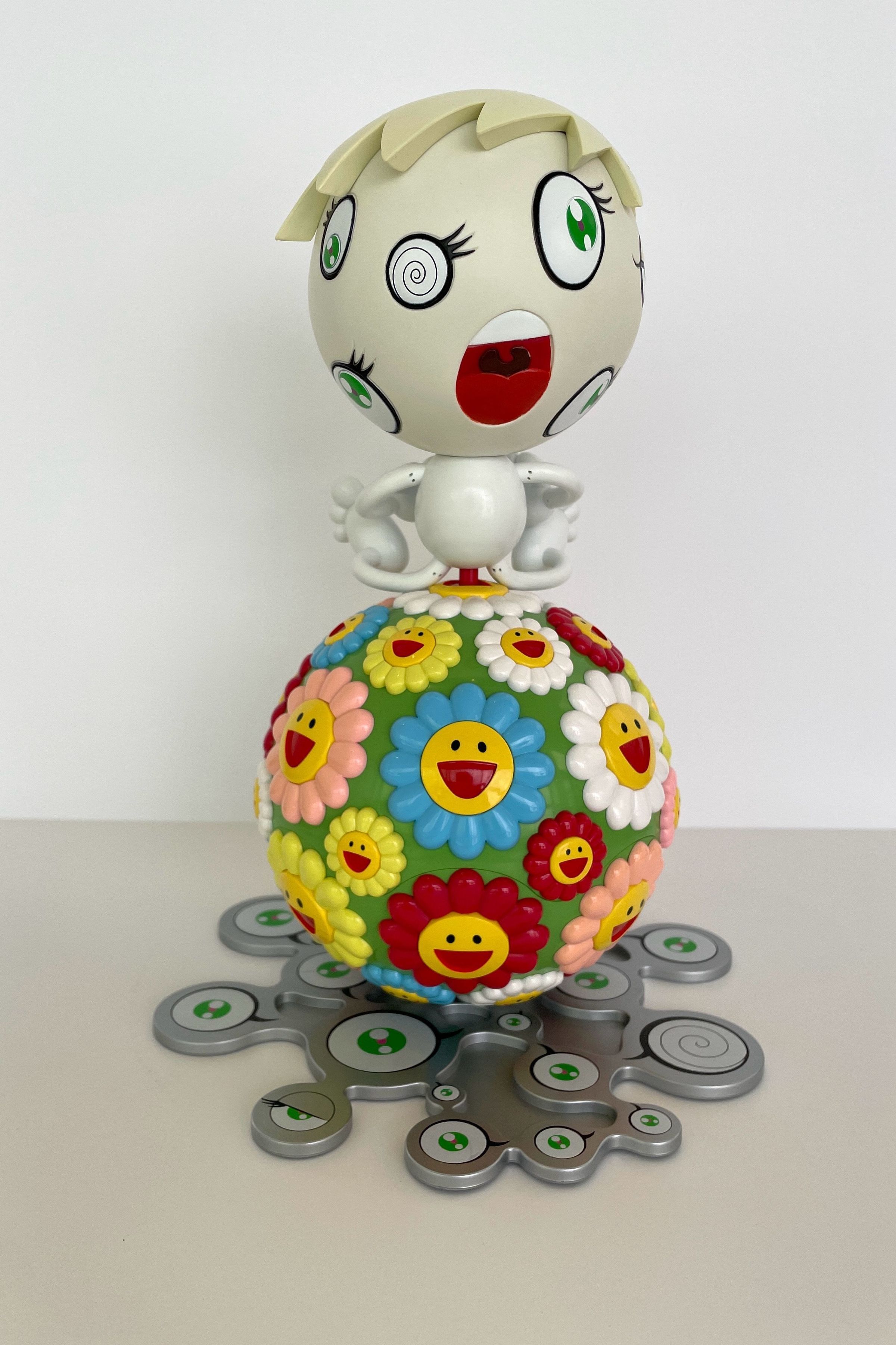 Buddha figure(Oval) seated in lotus position atop ball covered with smiling flowers. figure is smiling with one eye closed blonde hair several smaller eyes on head.Set on Plastic base sphere open op to reveal compact disc. Four component pieces altogetherCollection