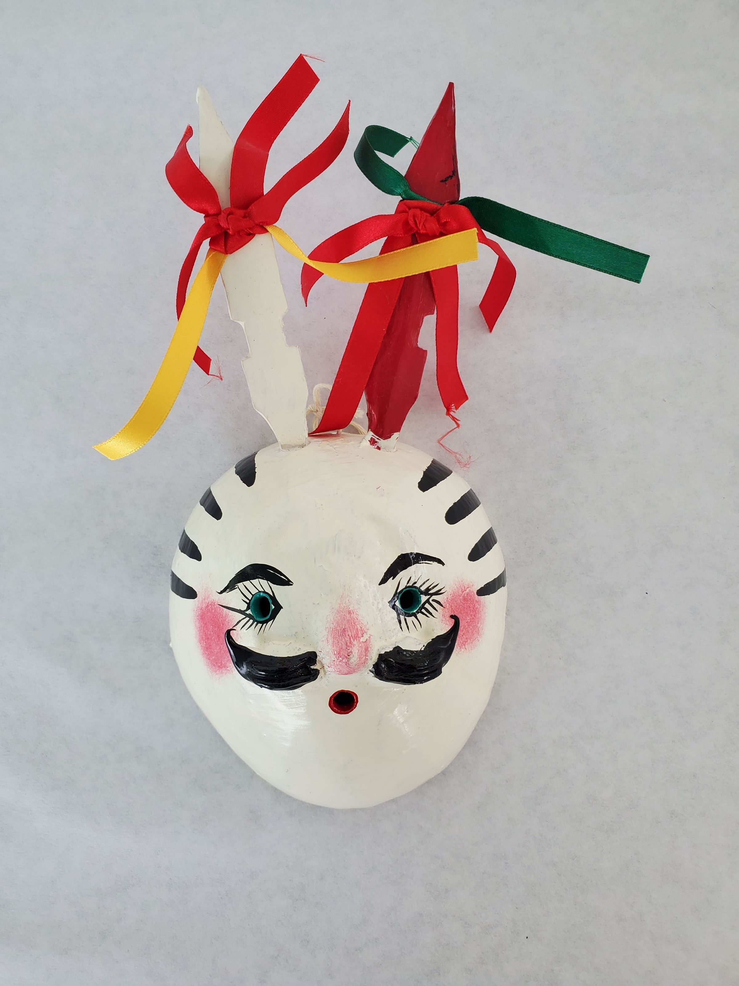 resembles a rabbit on red ear one white ear with red and green ribbon tied to red ear and red and yellow ribbon tied to white earwhite face pink cheeks black handlebar mustacheCollection