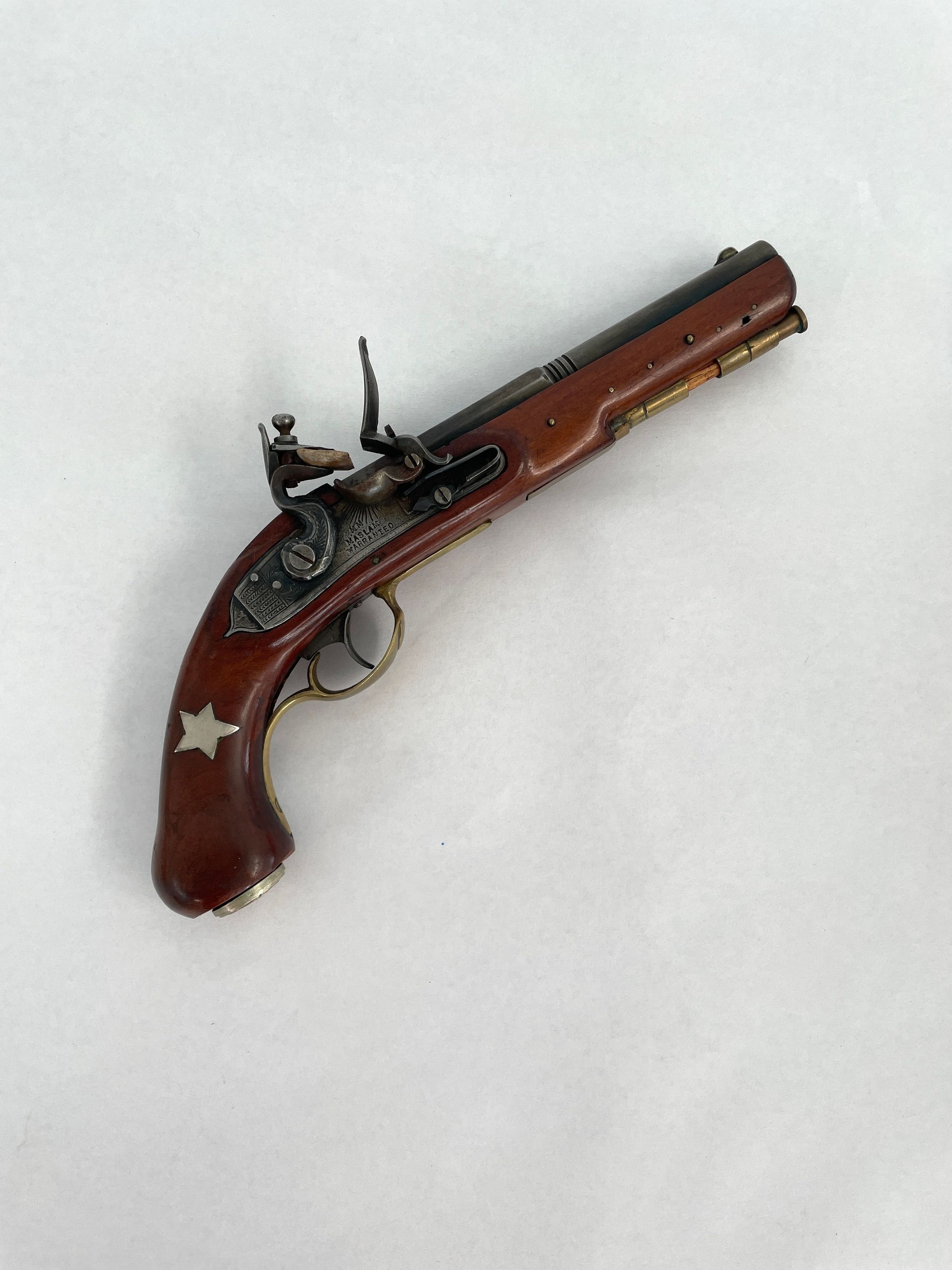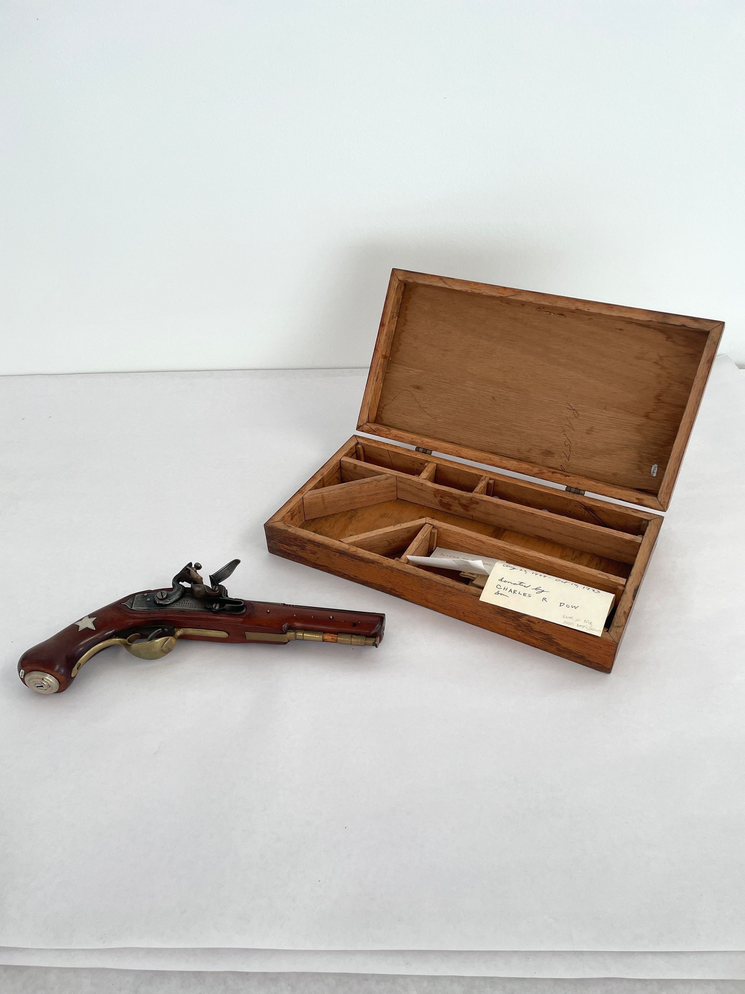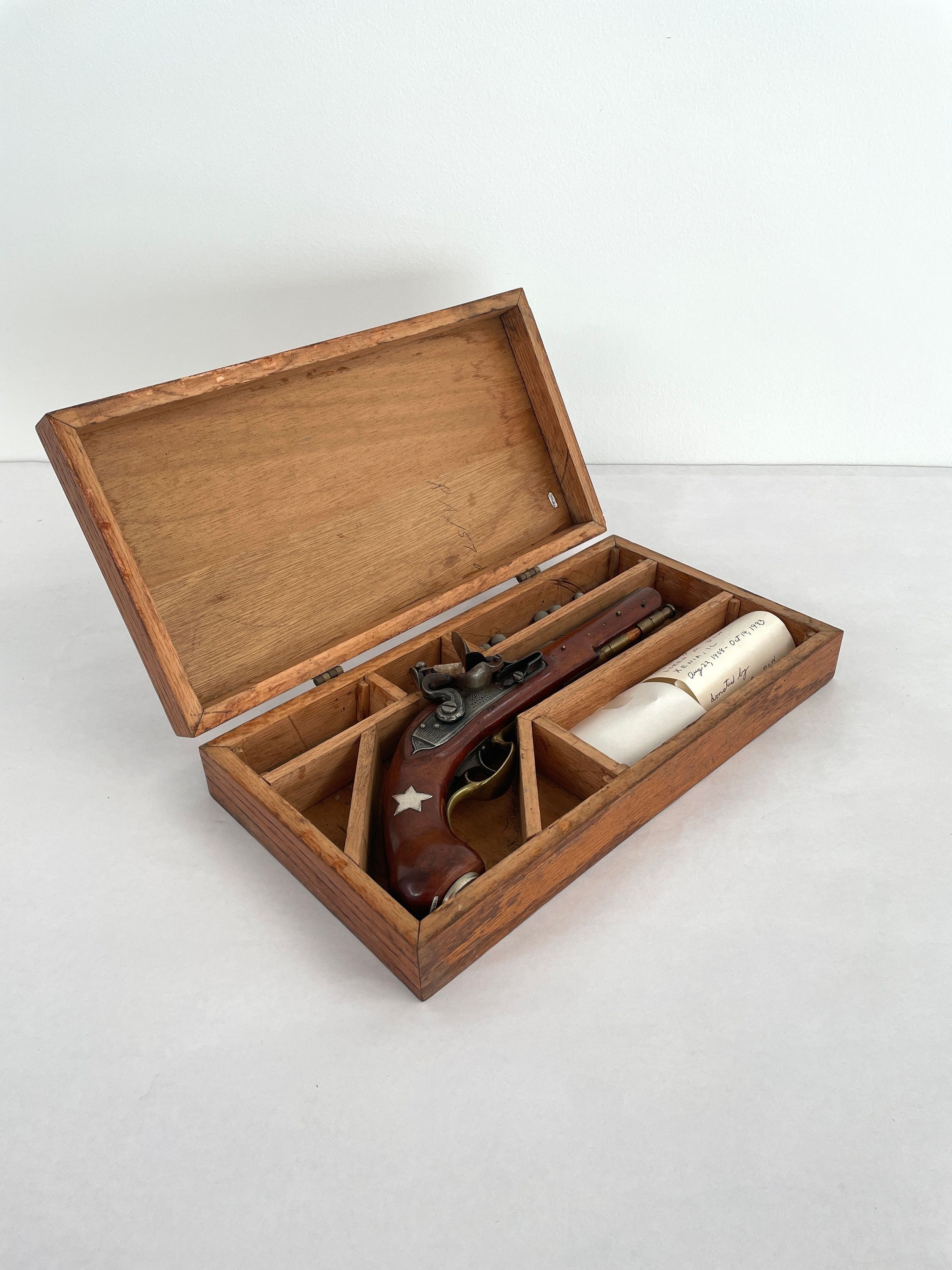 12" flintlock pistol hand-made; maple handle steel works & barrelbrass triggerguard 7" barrel; with oak presentation box (unfinished)Collection
