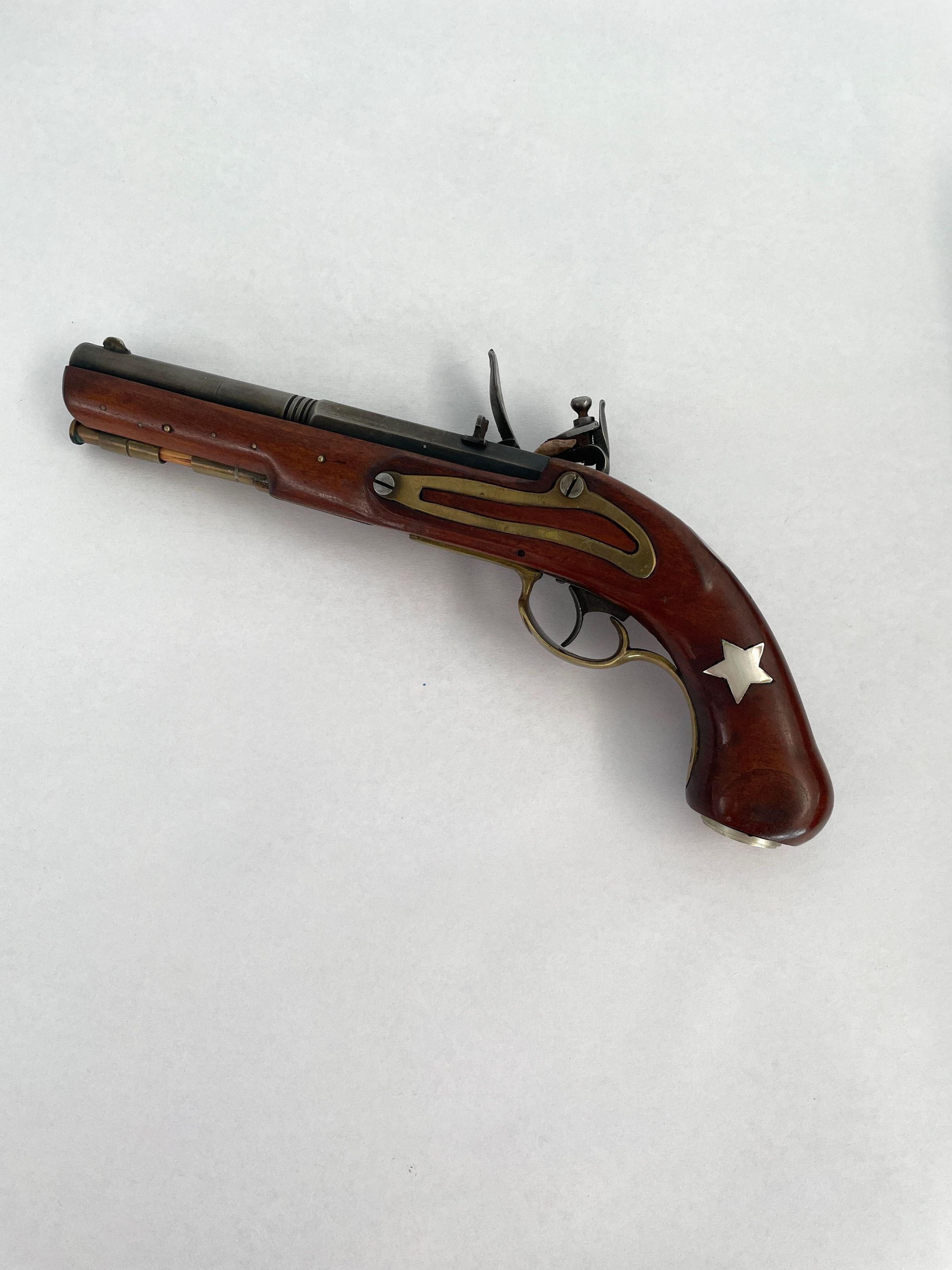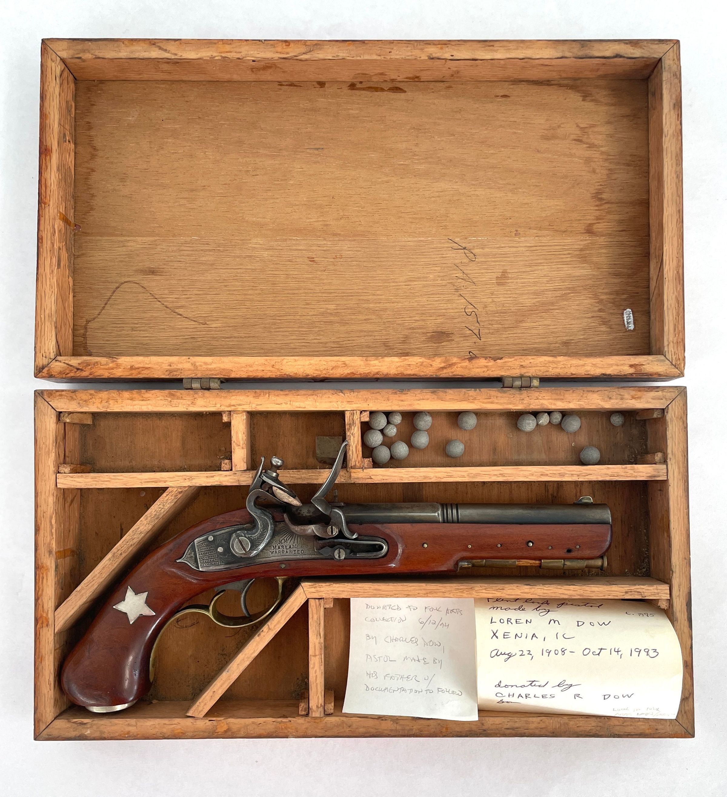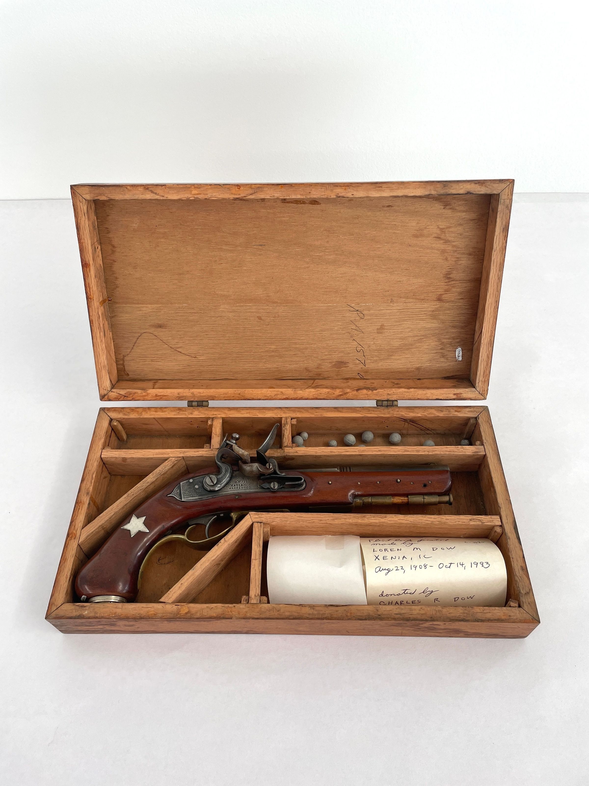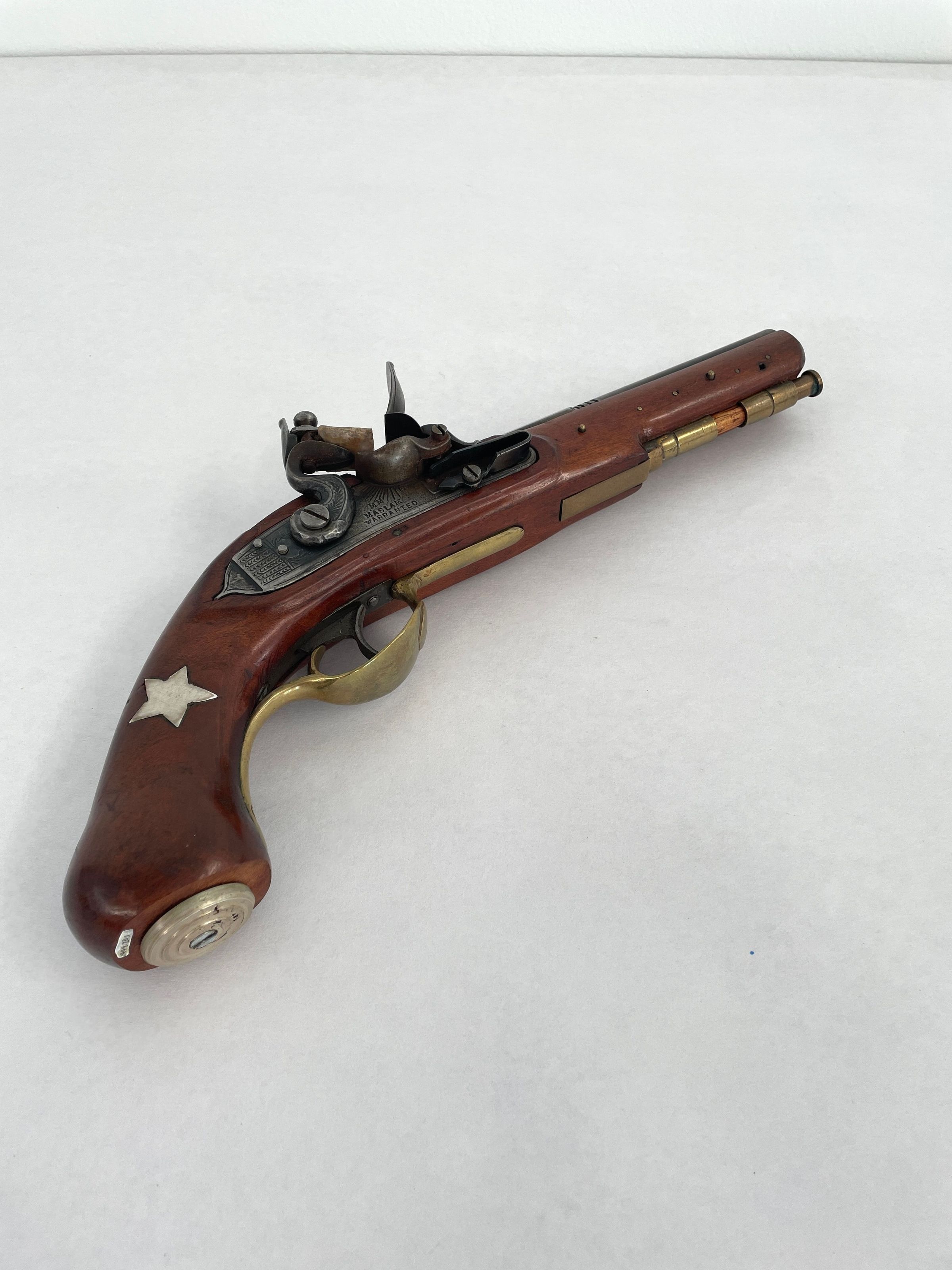 12" flintlock pistol hand-made; maple handle steel works & barrelbrass triggerguard 7" barrel; with oak presentation box (unfinished)Collection