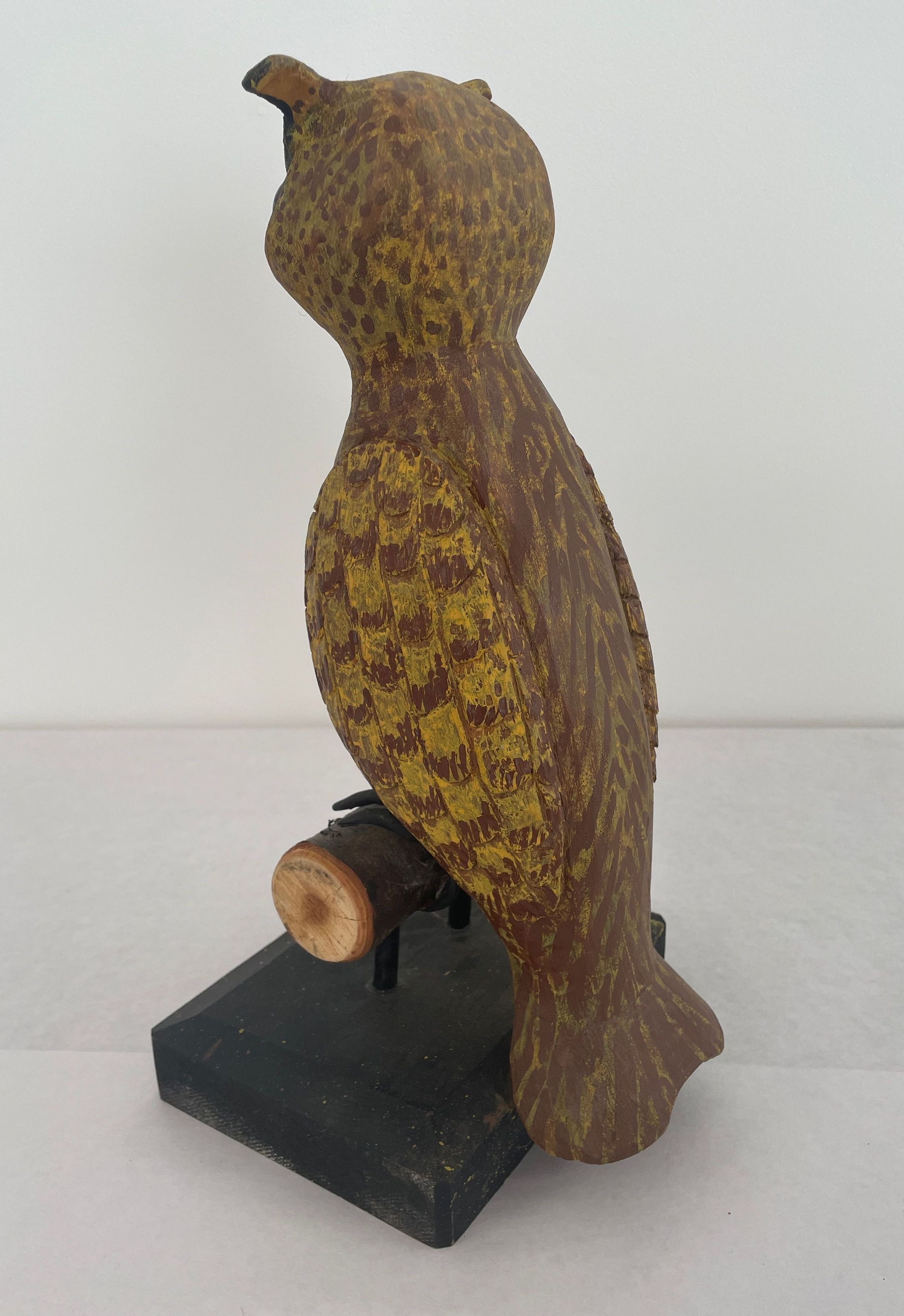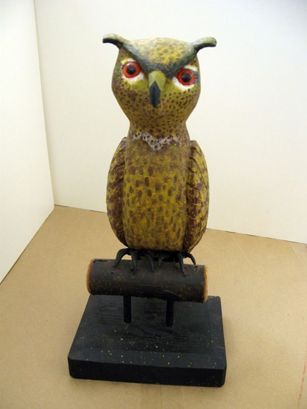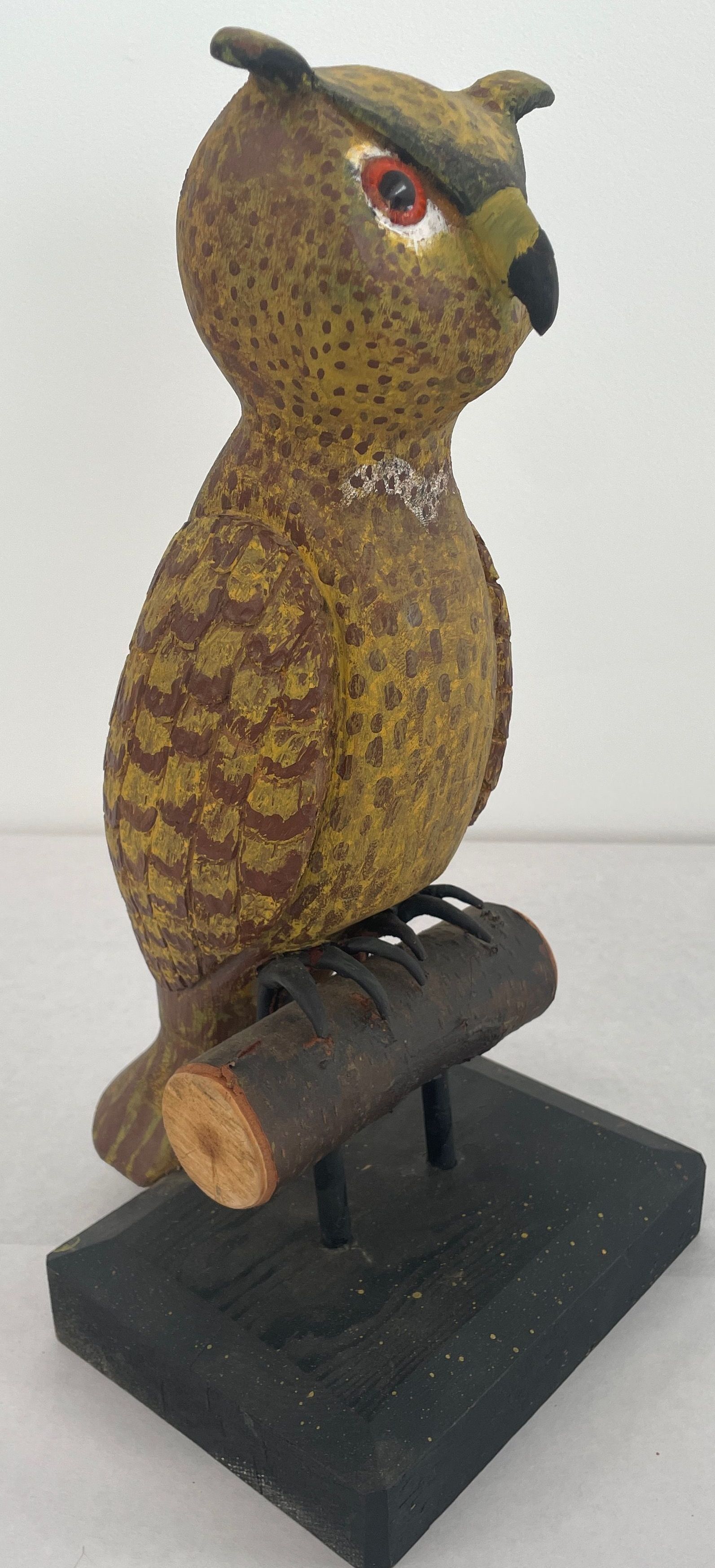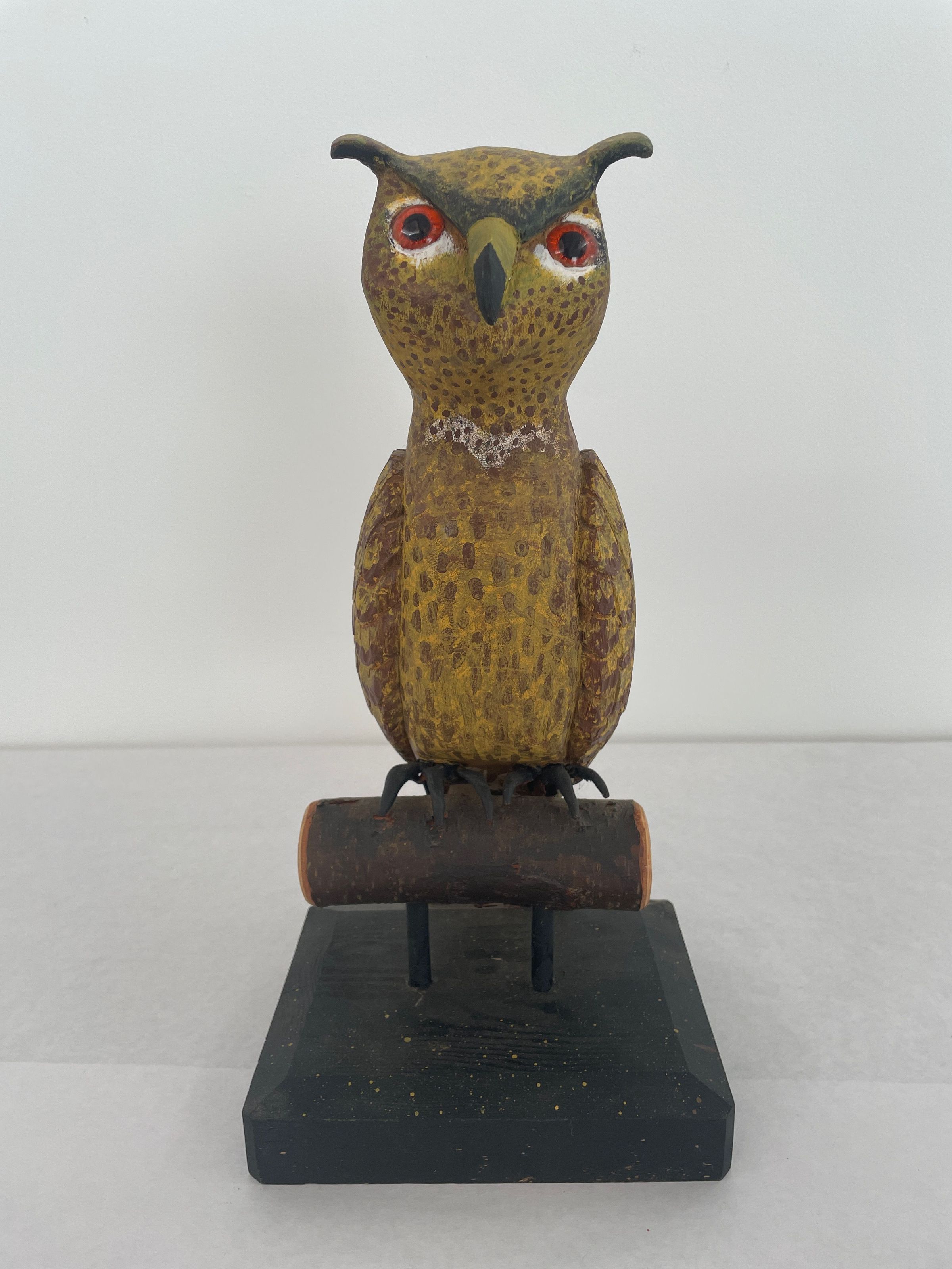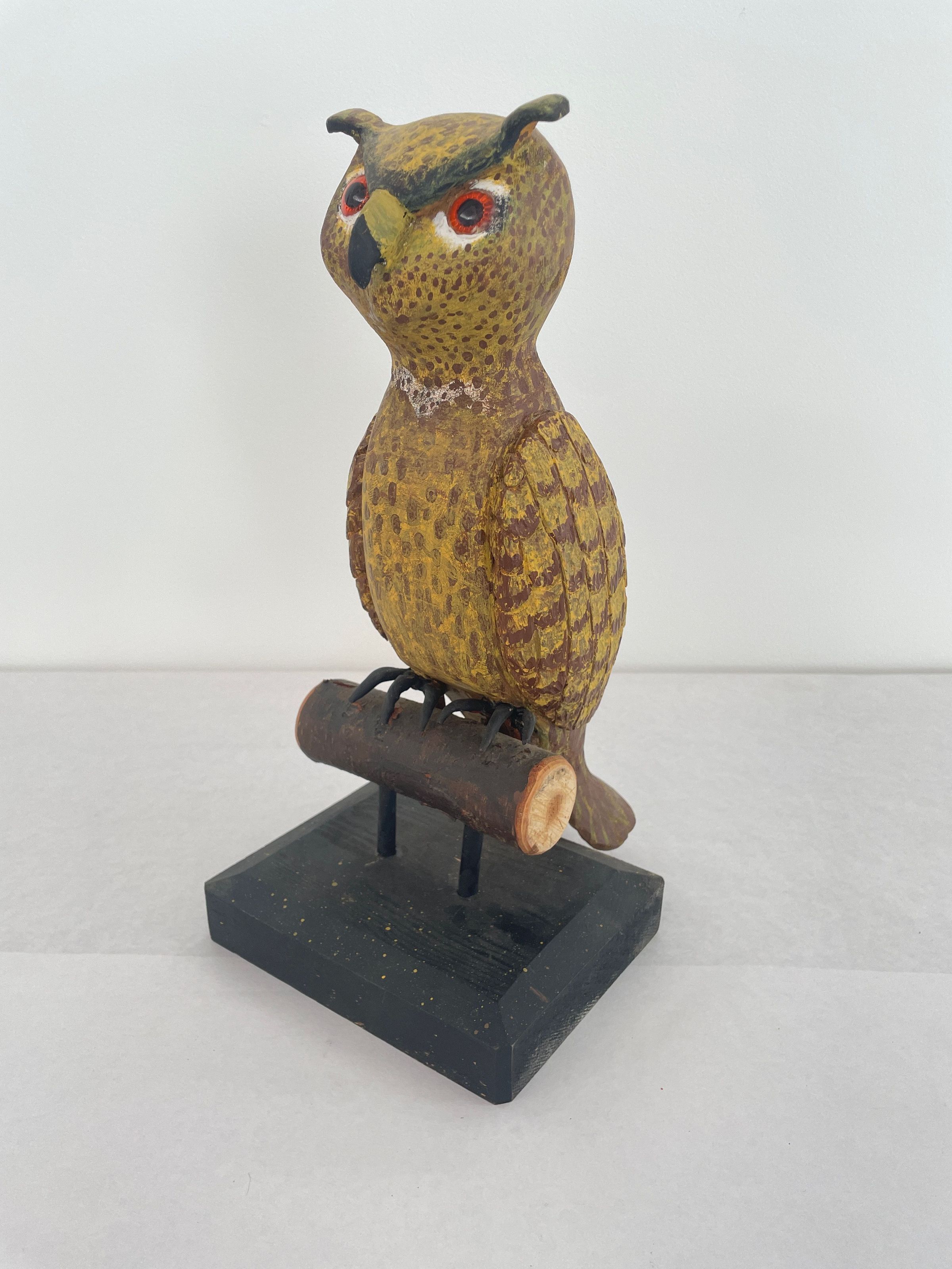 carved owl; painted wood glass eyes; mounted on tree branch which is mounted on square baseCollection
