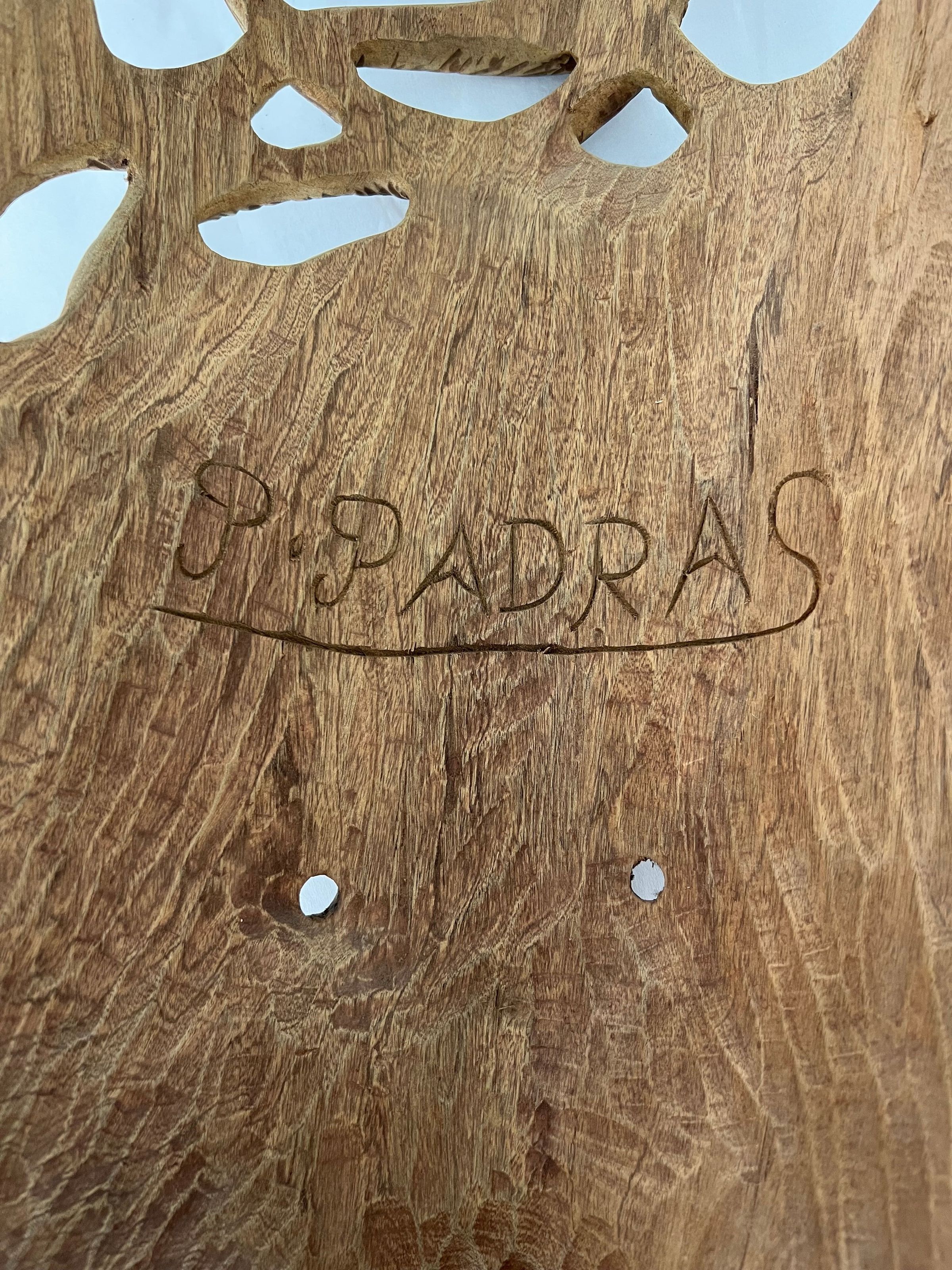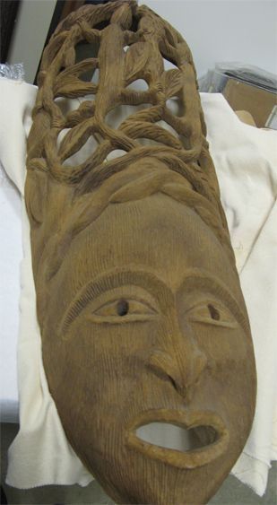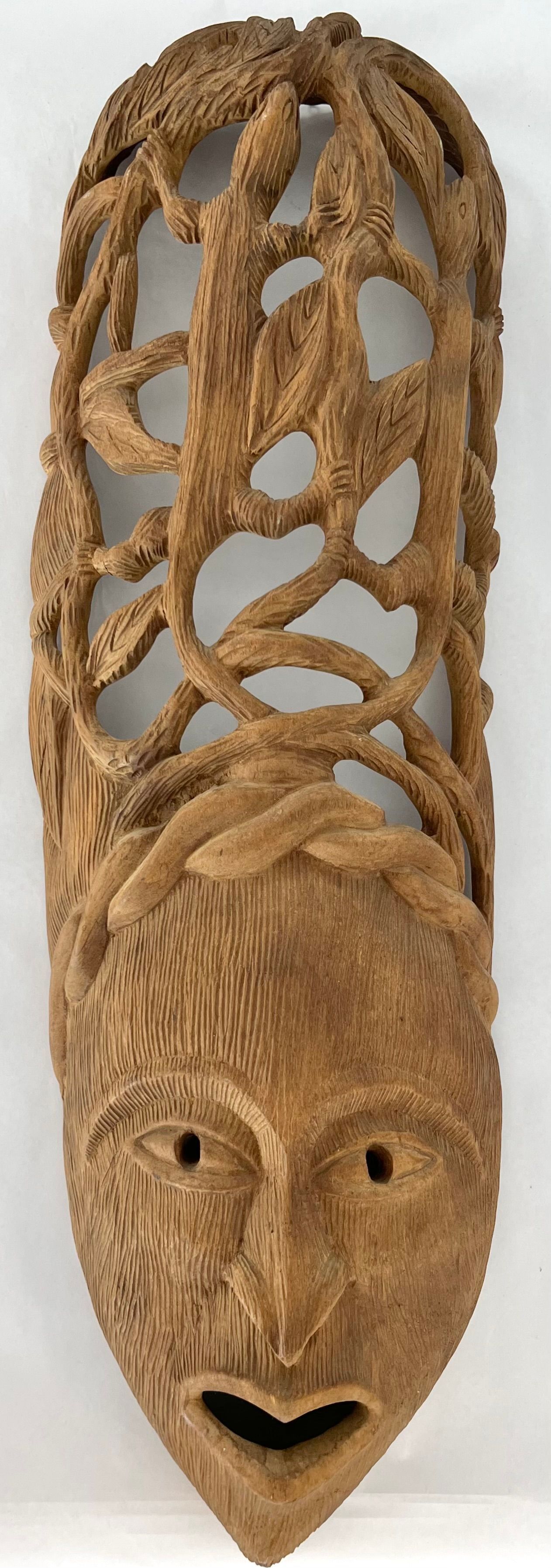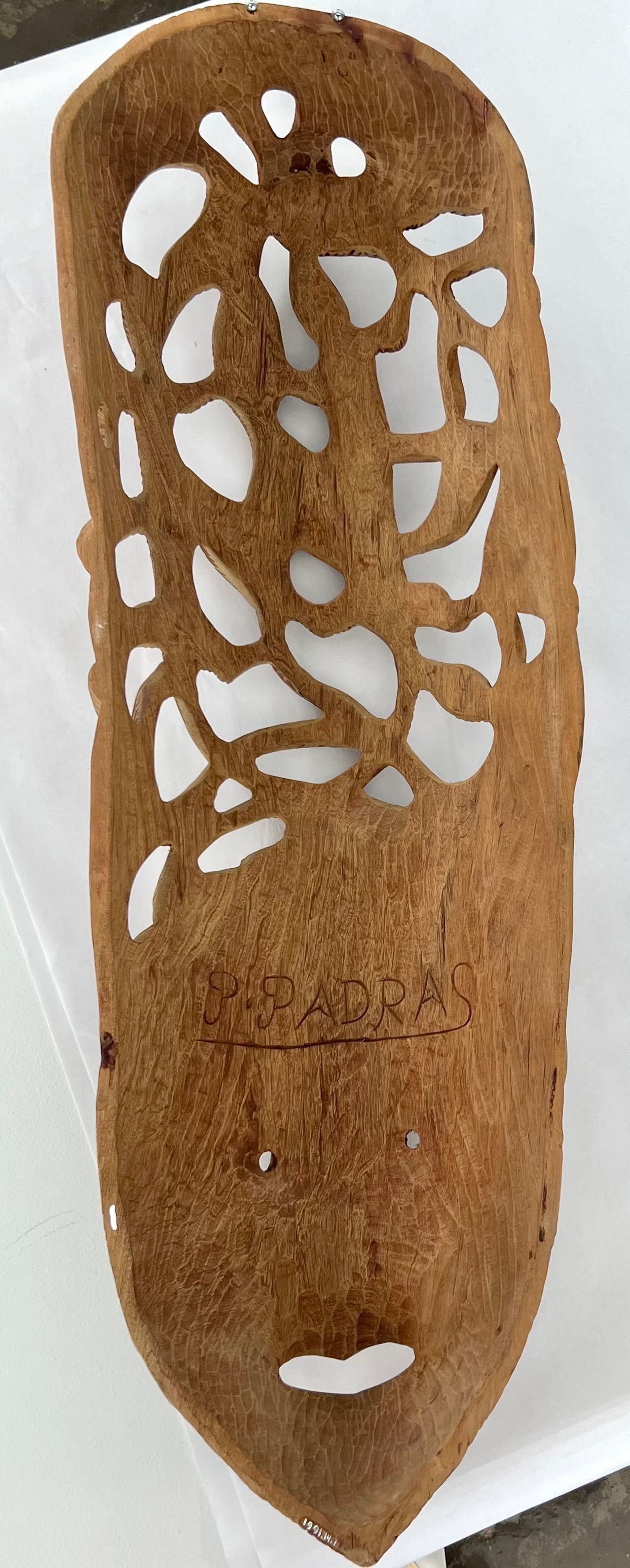 carved wooden mask with elaborate interweaving form on top of the head; 'P. PADRAS' carved on verso, insideCollection