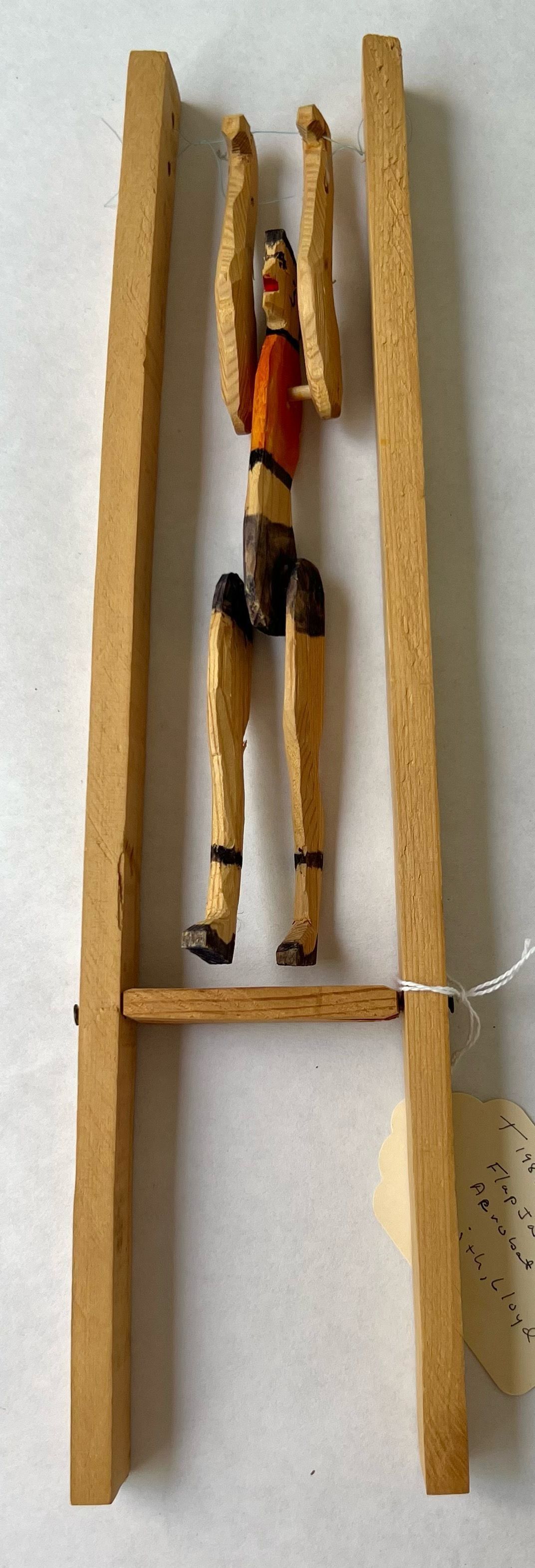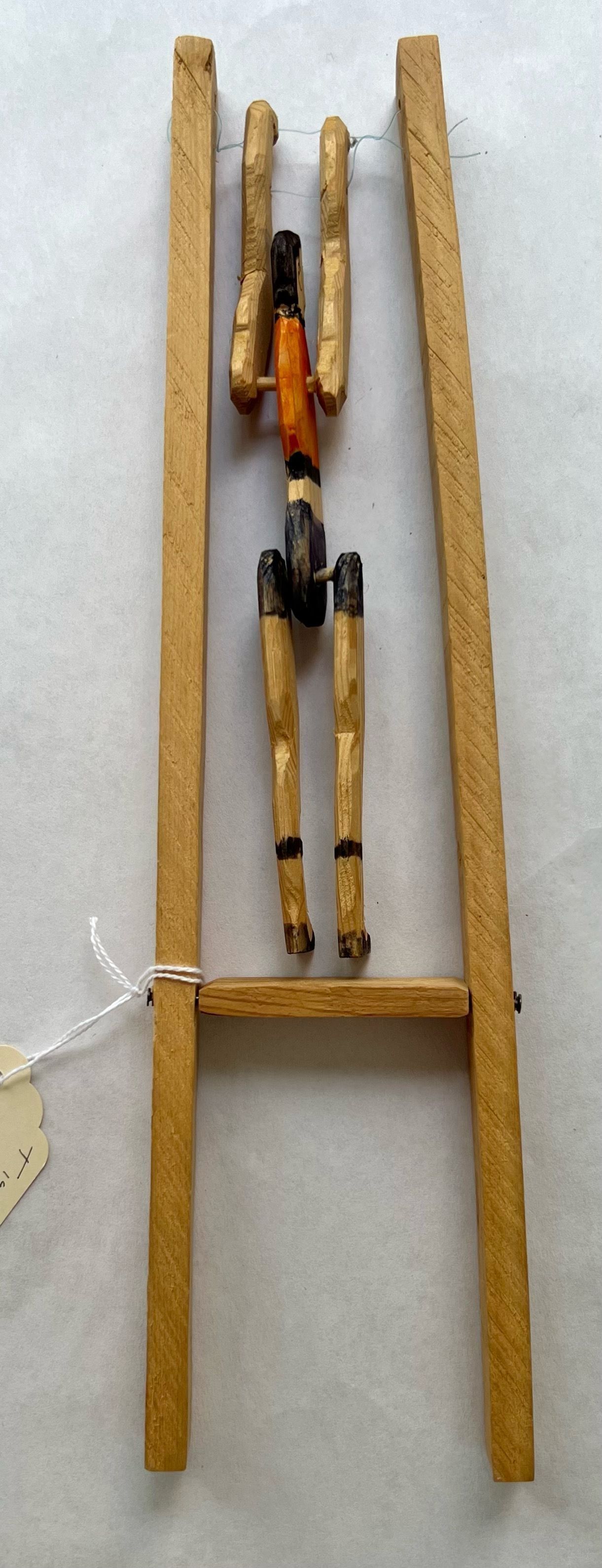 Carved wood figure hanging from fishing line in a wood frame shaped like an "H".Artwork Details