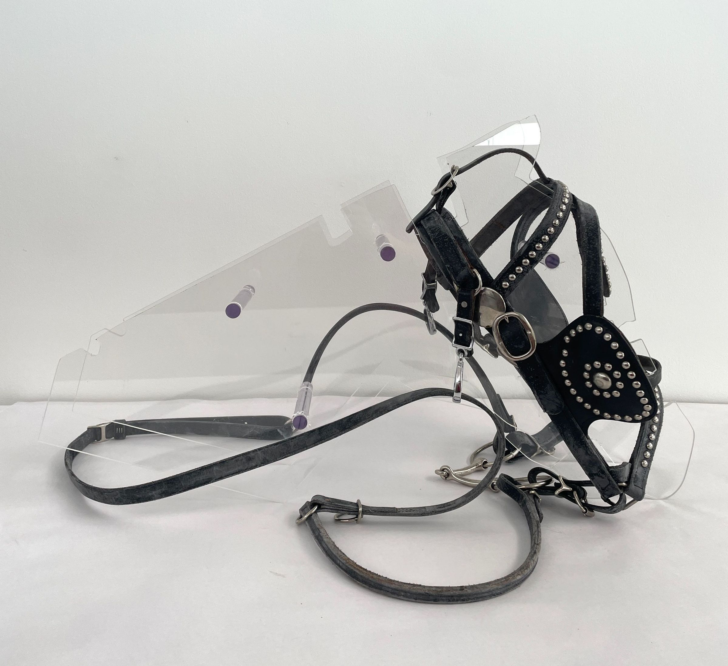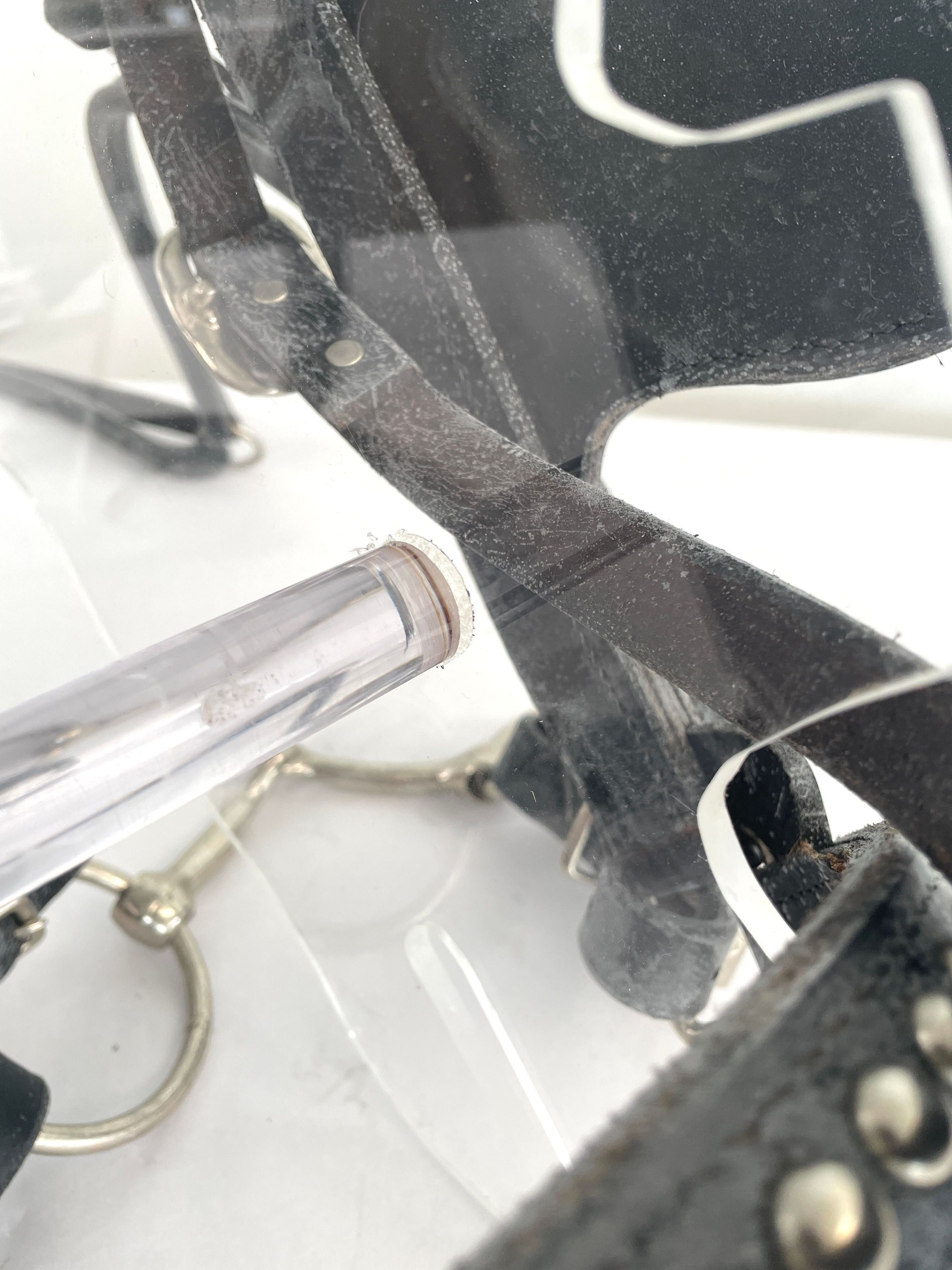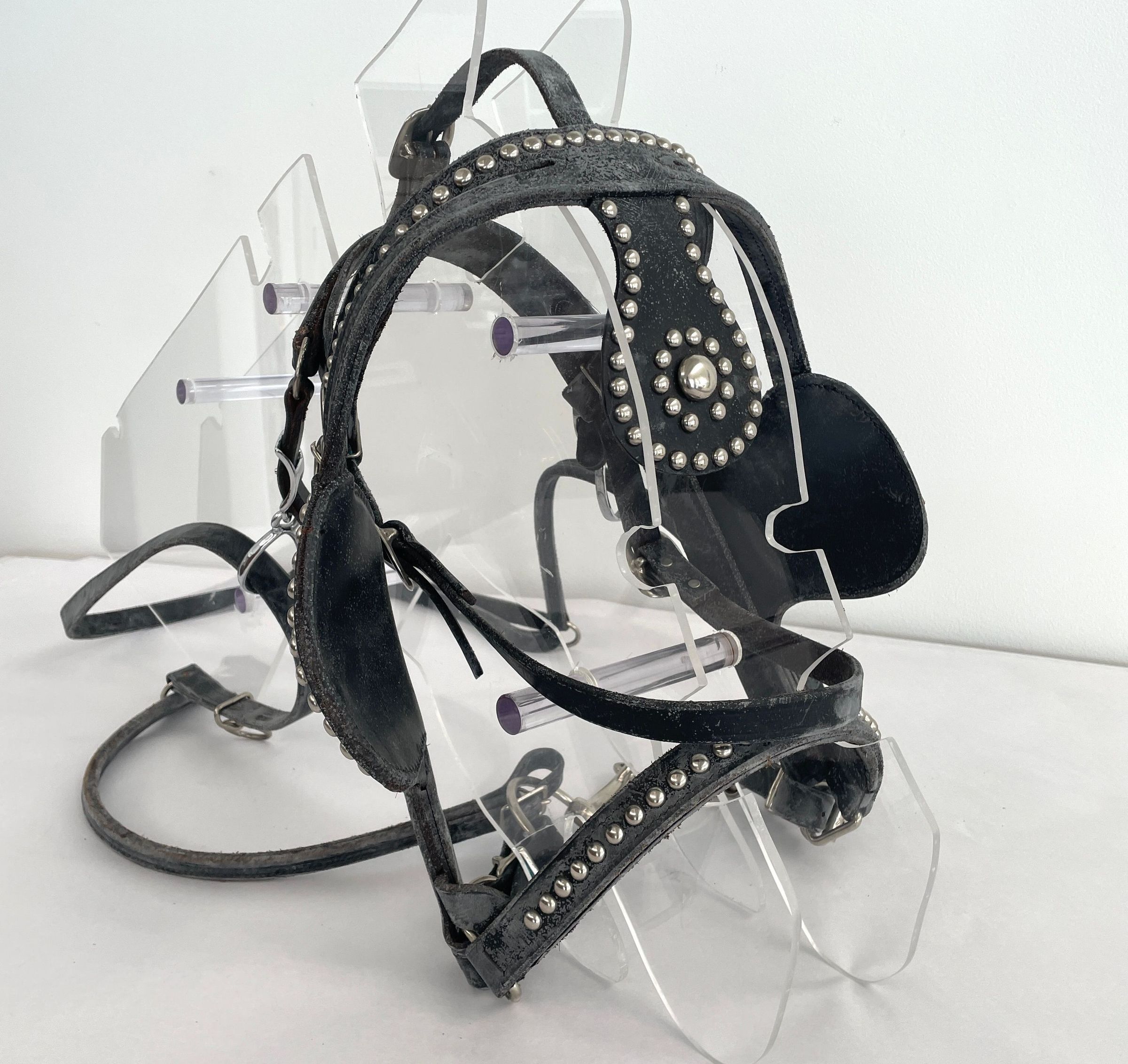 Black leather bridle & attached strap. Leather double layered & stitched in some places. Silver colored metal studs from decorative patterns.Collection