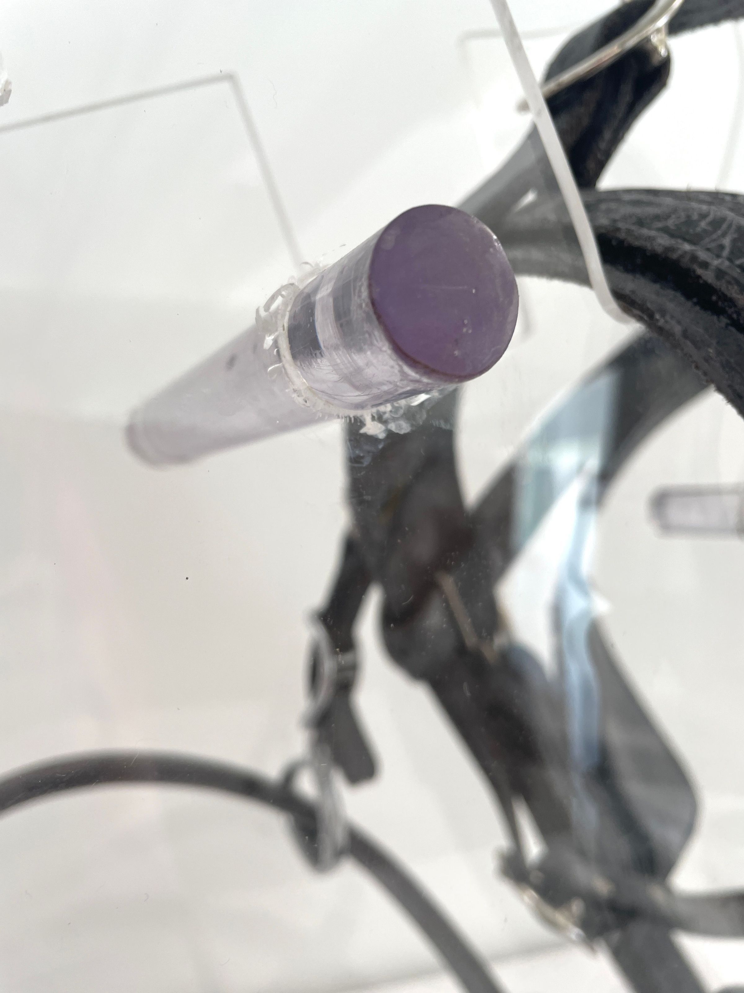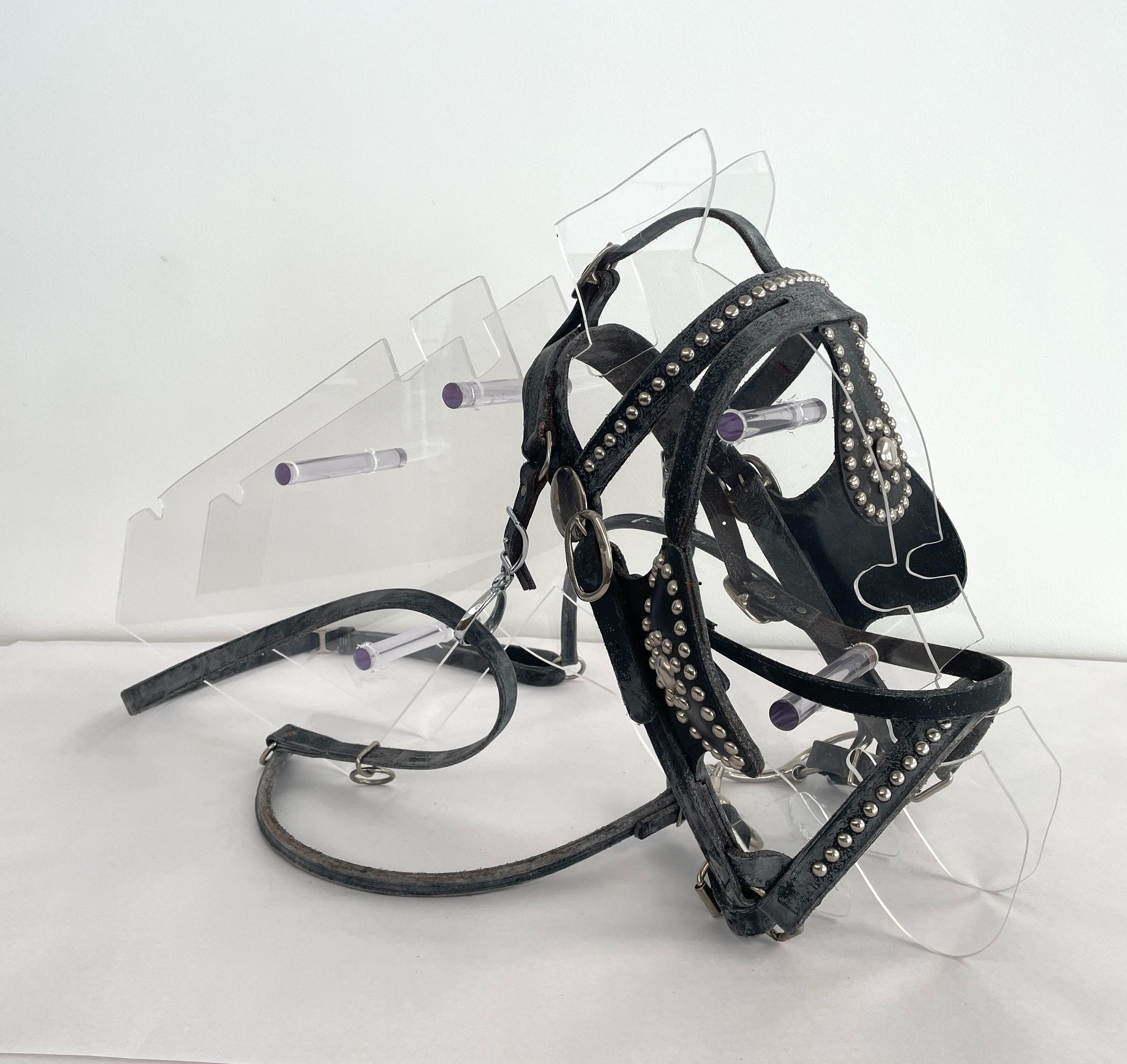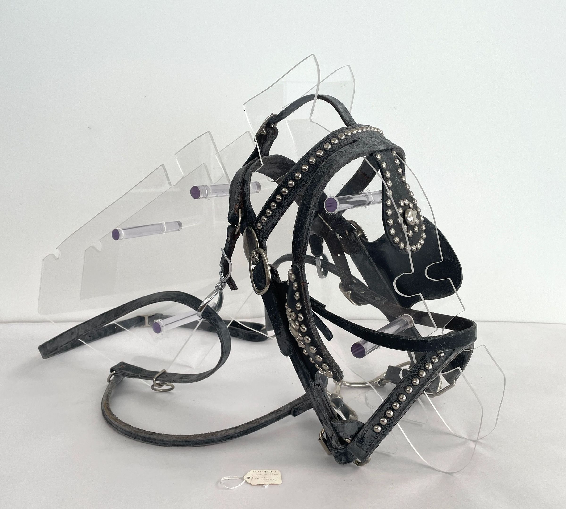 Black leather bridle & attached strap. Leather double layered & stitched in some places. Silver colored metal studs from decorative patterns.Collection