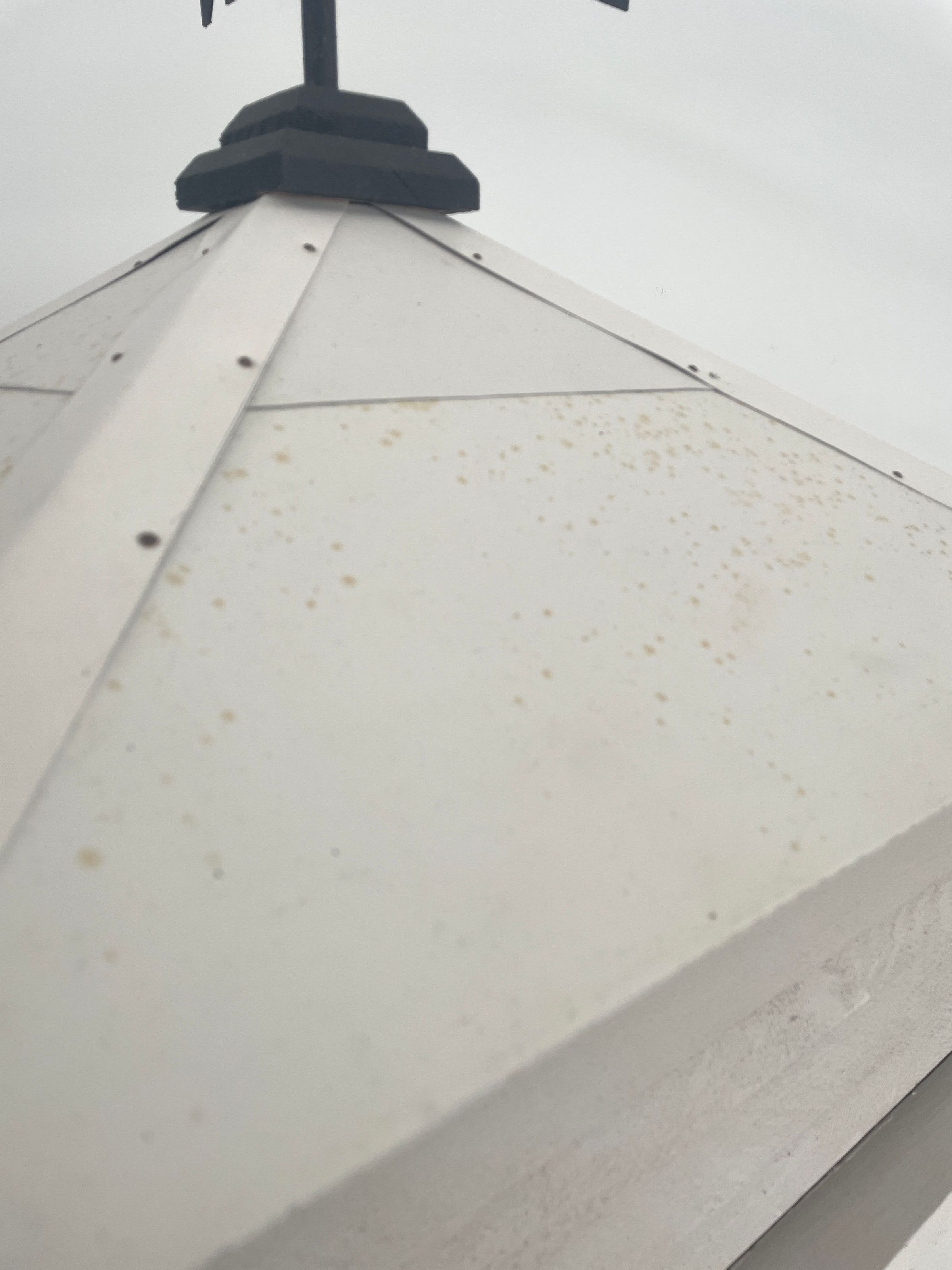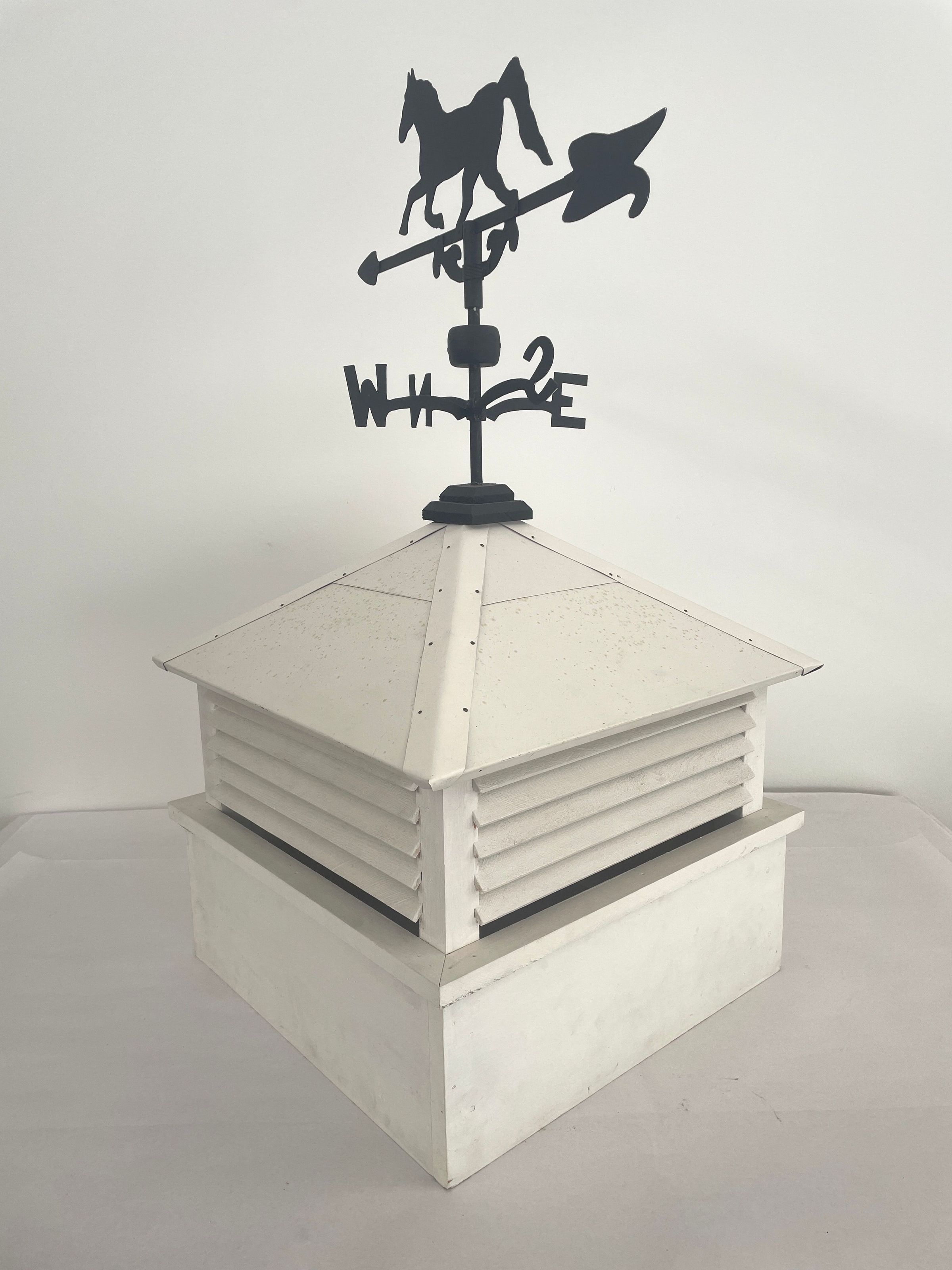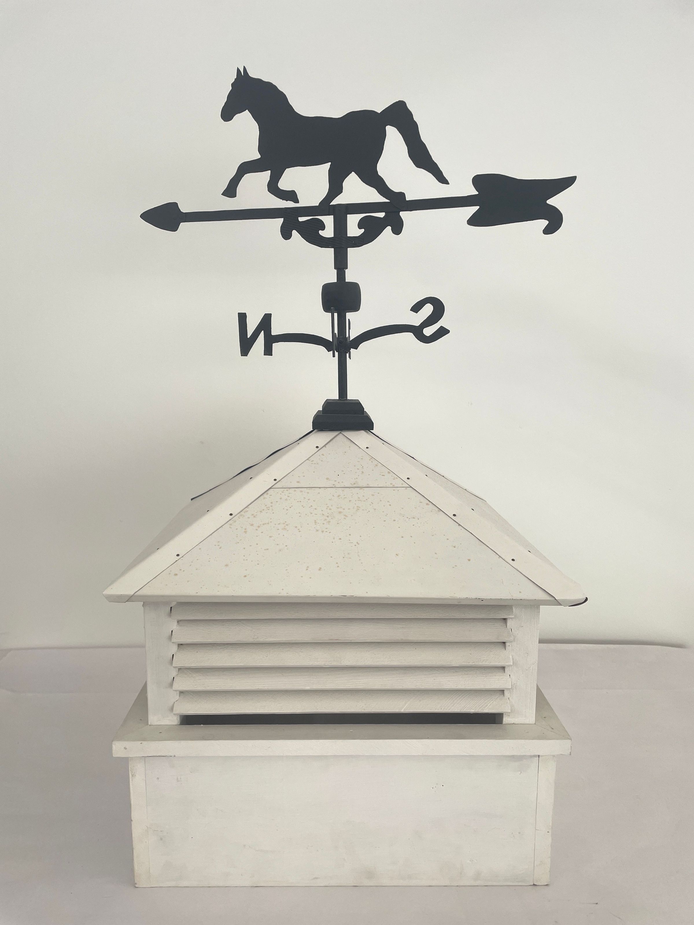 Painted white square base cupola with louvers (narrow wooden vents) on all four sides. A black weather vane with trotting horse ornament with an arrow under it's feet sits on top of roof.Artwork Details