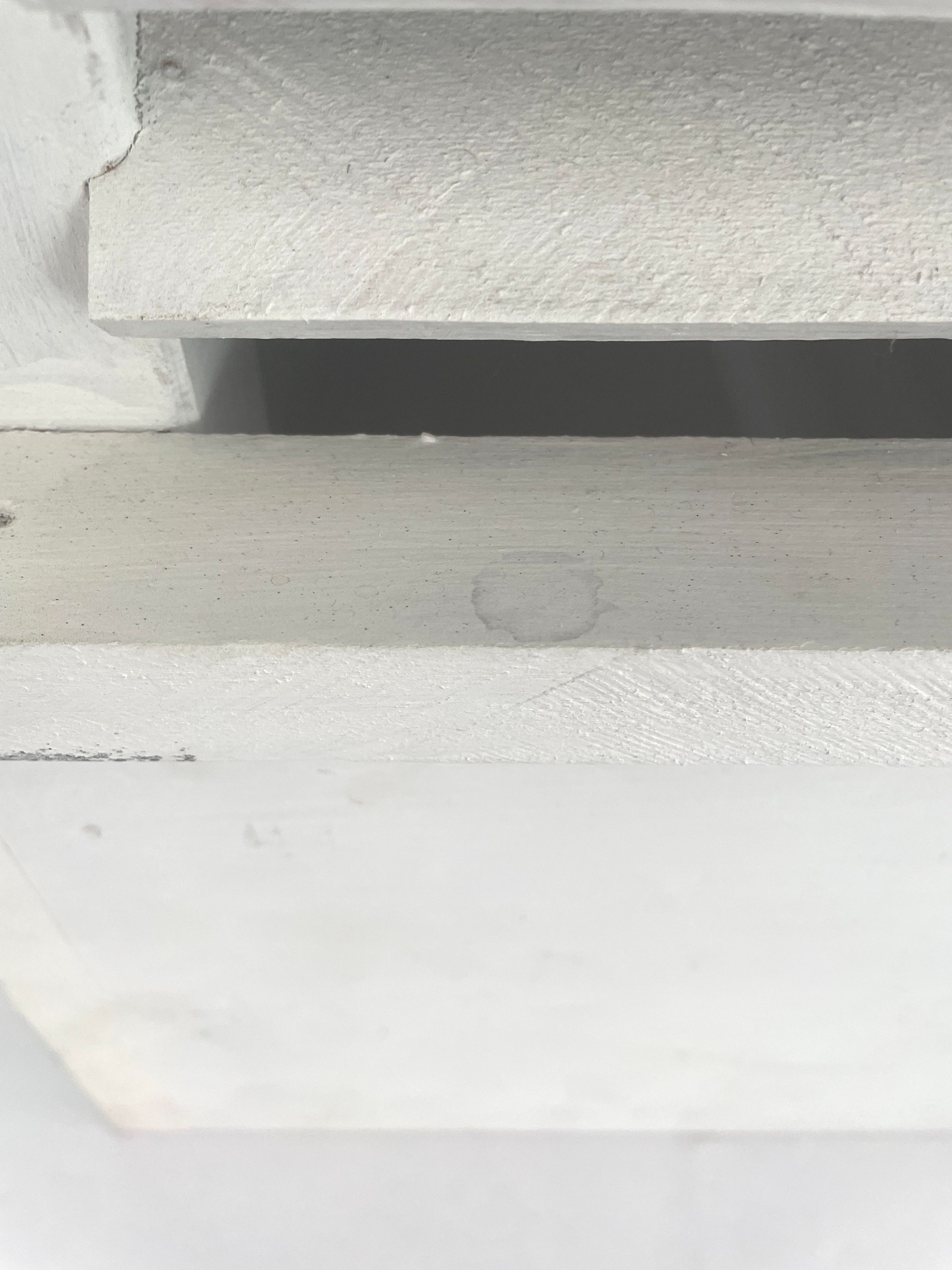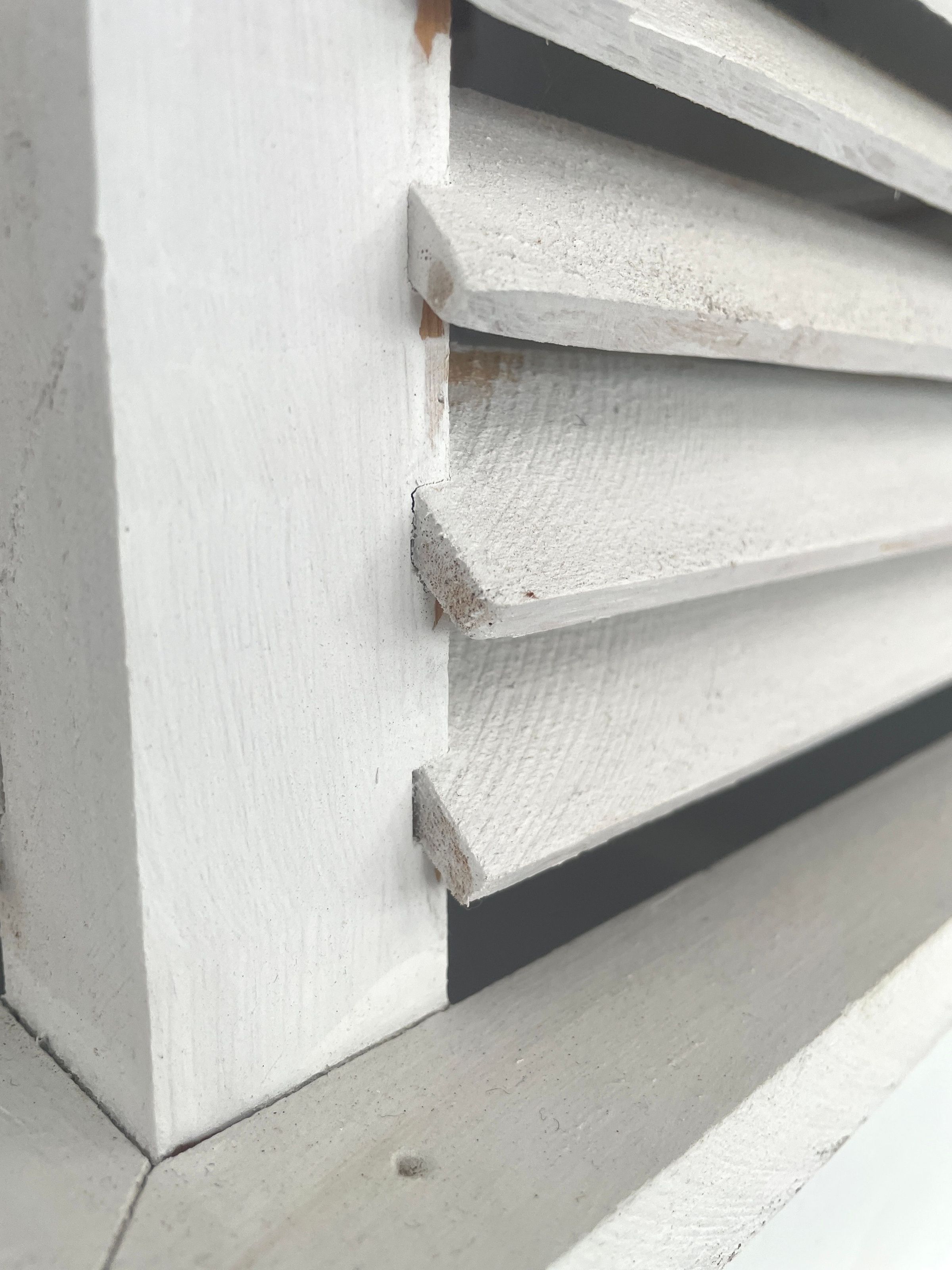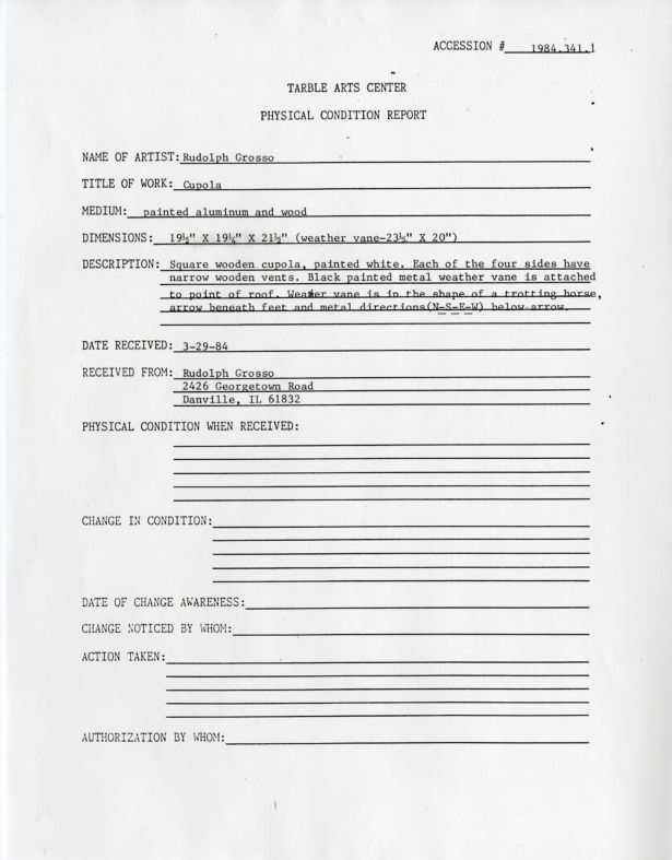 Painted white square base cupola with louvers (narrow wooden vents) on all four sides. A black weather vane with trotting horse ornament with an arrow under it's feet sits on top of roof.Artwork Details