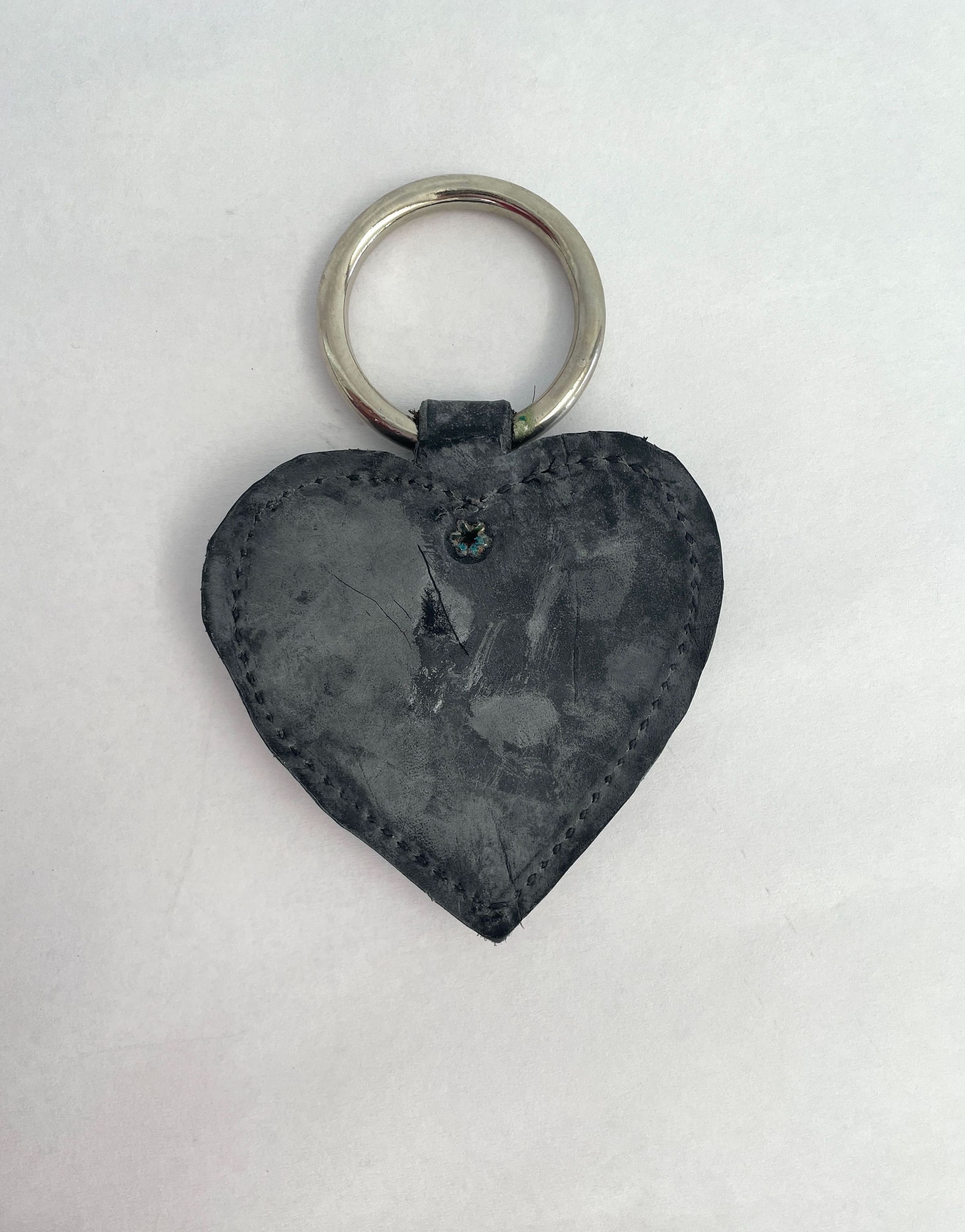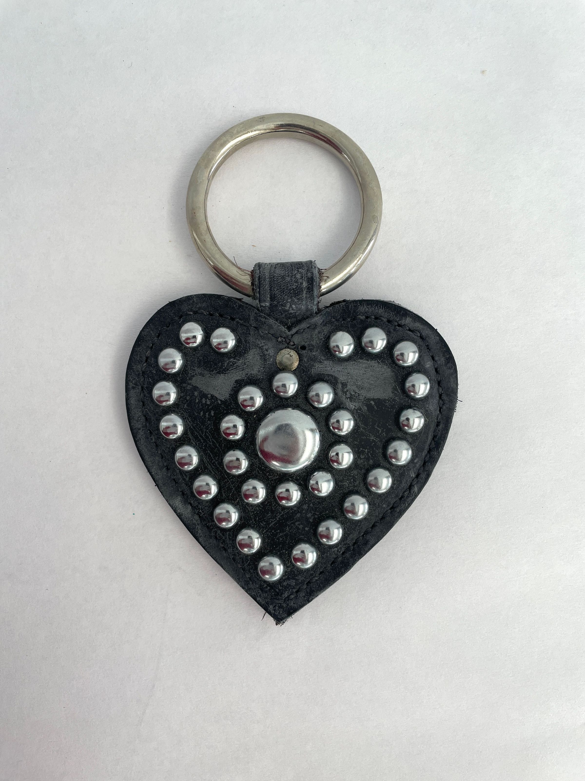 Black leather heart with metal ring attached. Heart is decorated with silver-colored metal studs. Two layers of leather stitched together.Collection