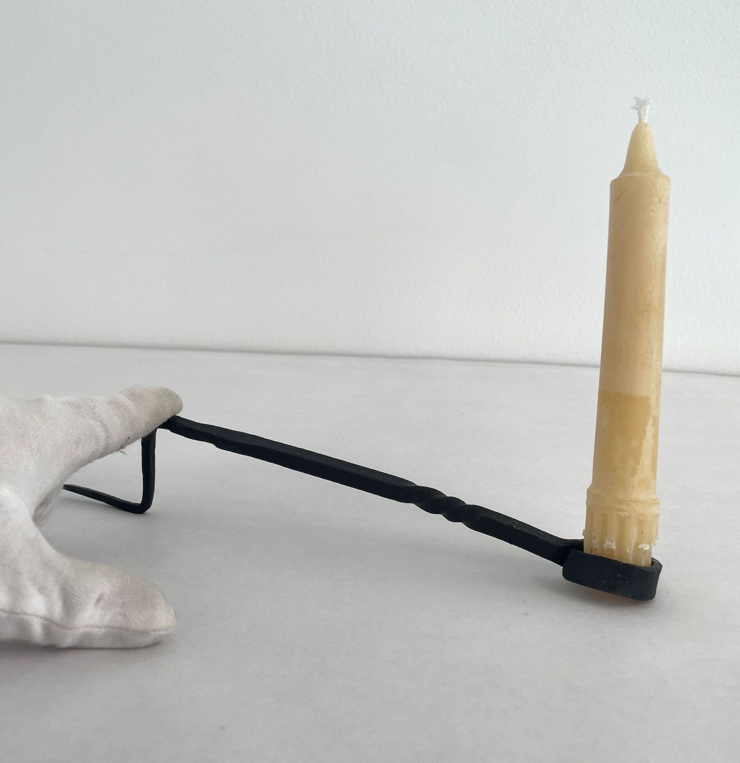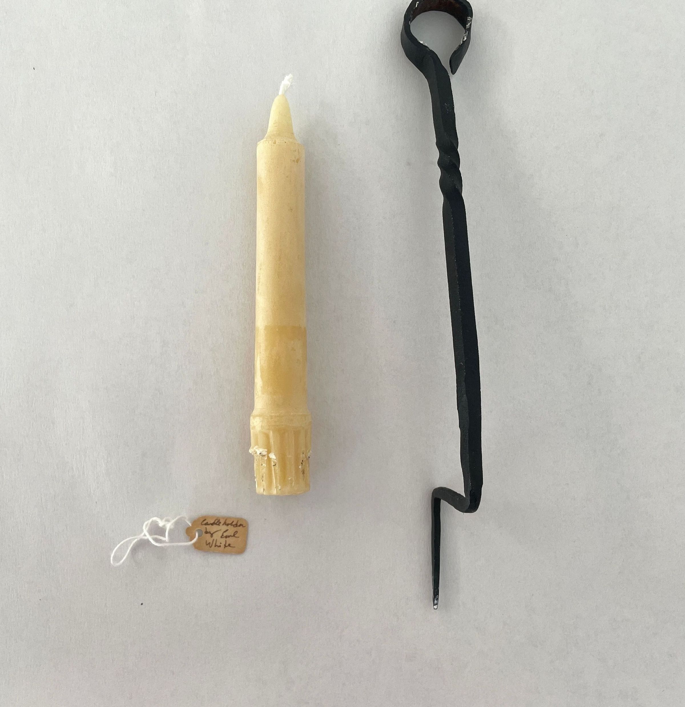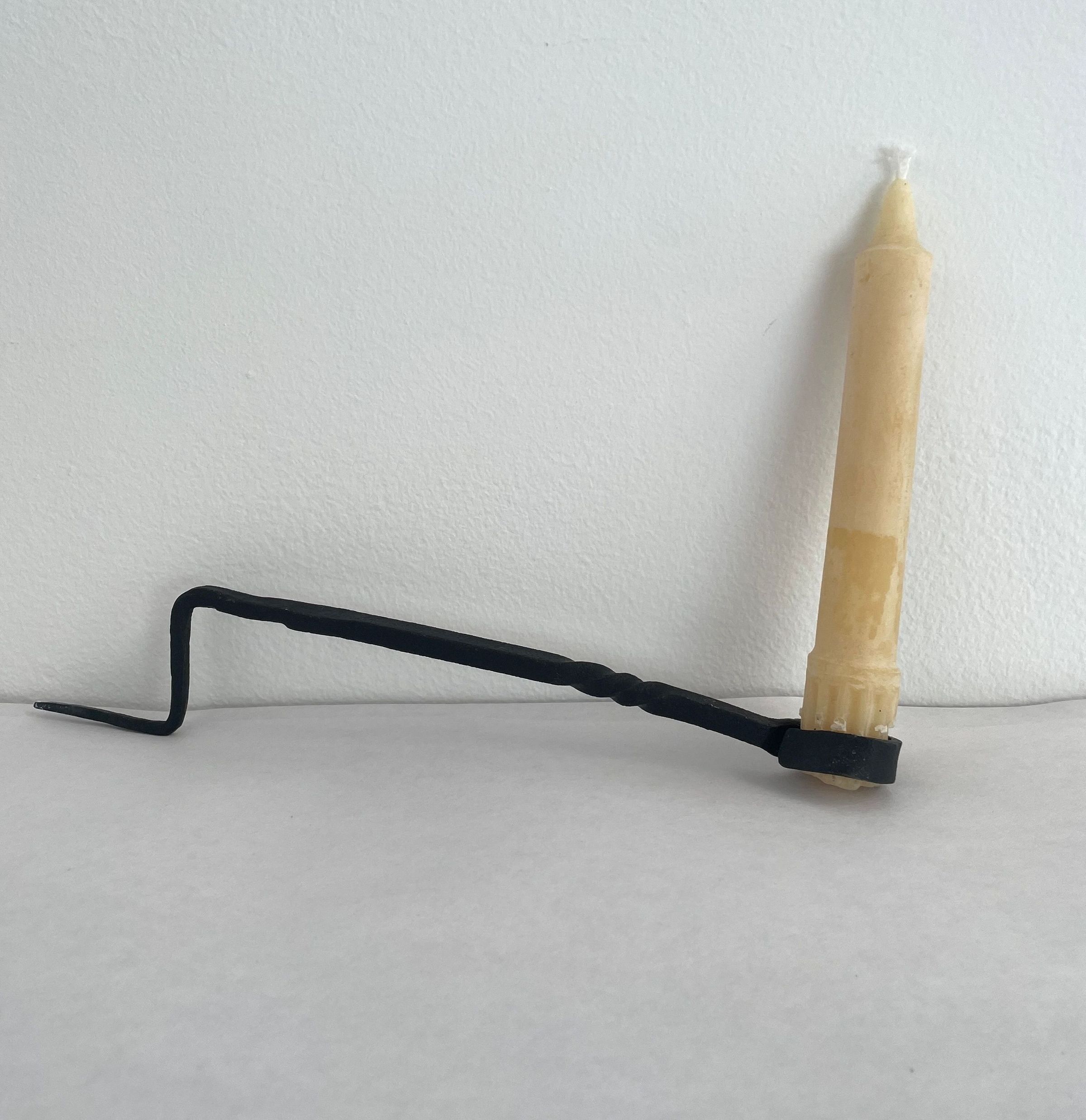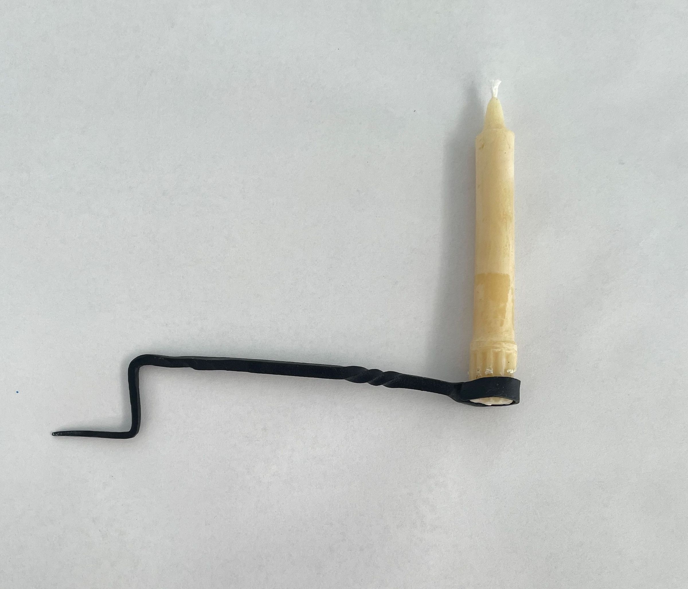 Forged, black, metal stick that bends to a point where candle would be pierced. Decorative detailing toward looped handle at bottom. The iron is squared ans twisted on one small section, one end has a ring shape and the other end is pointed.Collection
