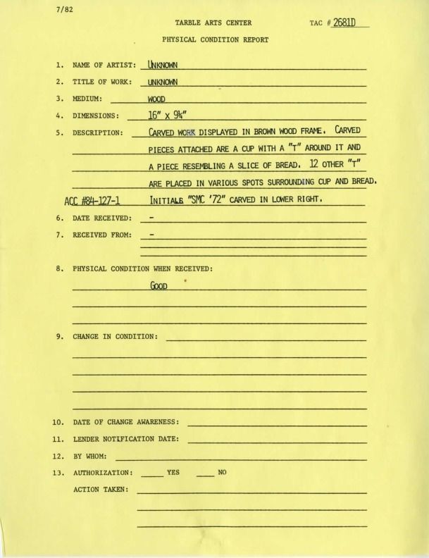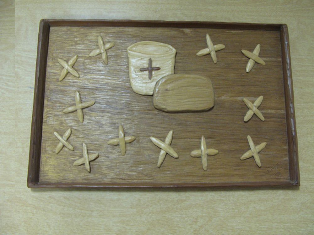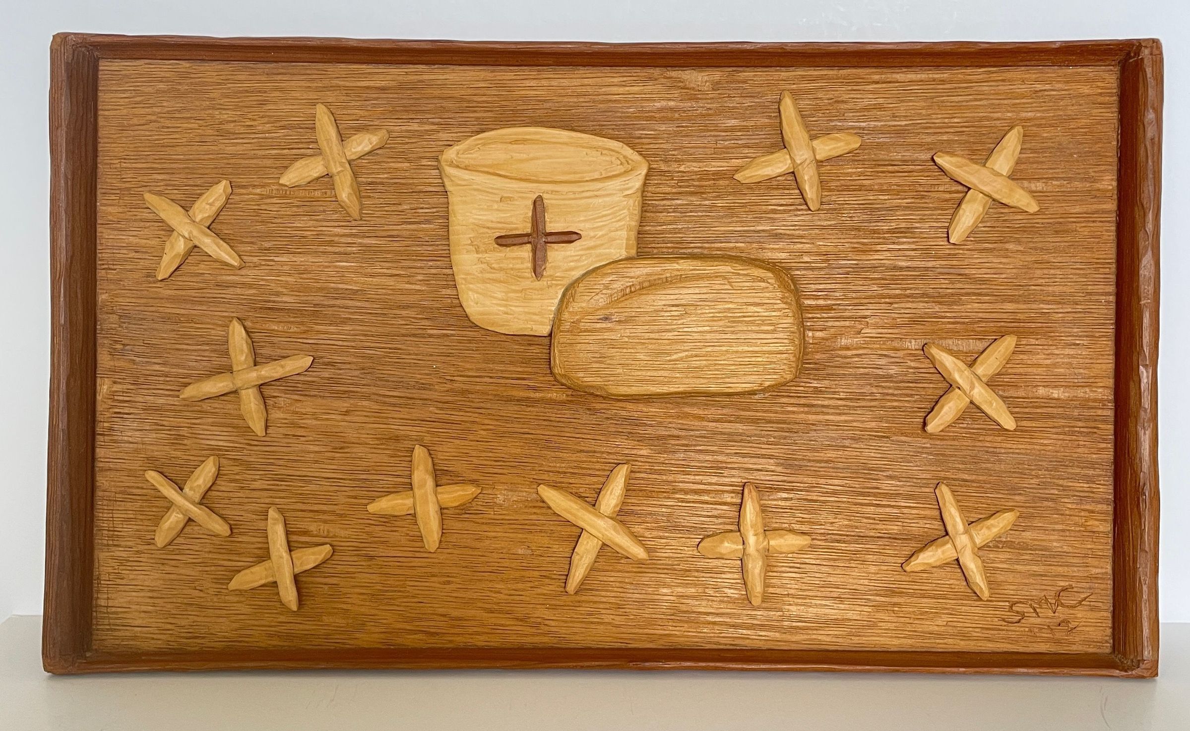Carved work displayed in brown wood frame. Carved pieces attached are a cup with a "T" on it and a piece resembling a slice of bread. 12 other "T"s are placed in various spots surrounding the cup and bread. Initials "SMC '72" carved in lower right.Collection