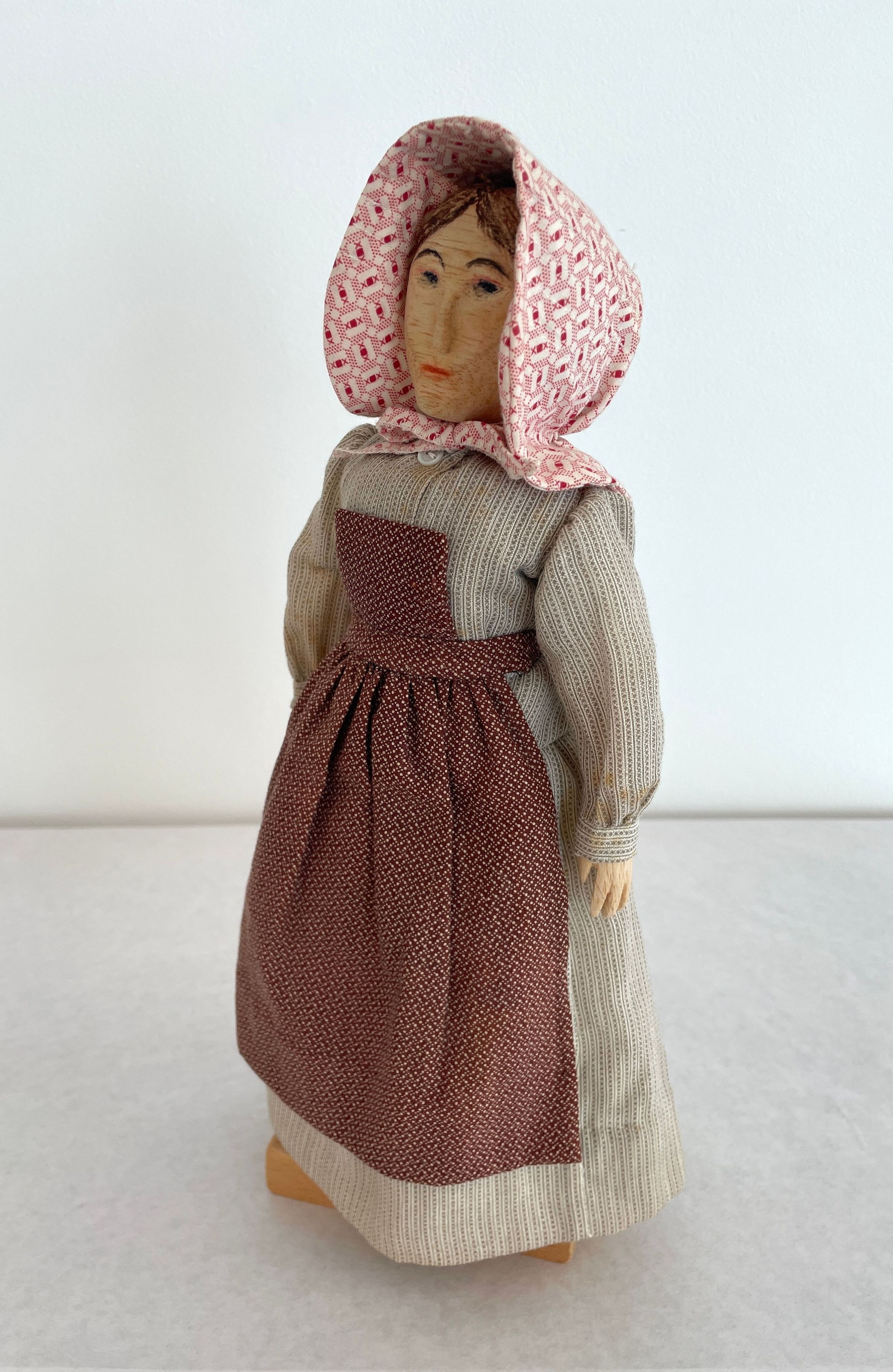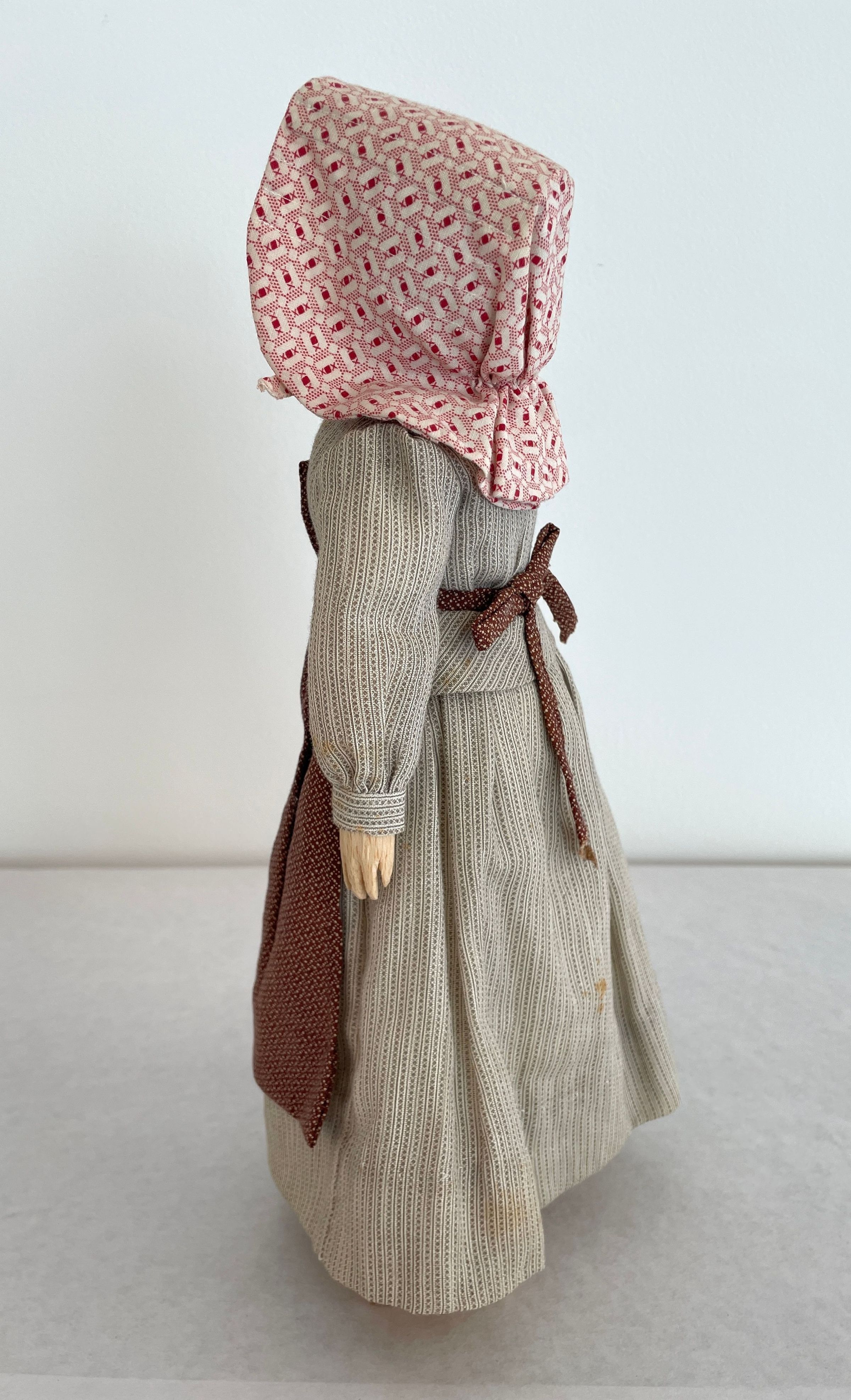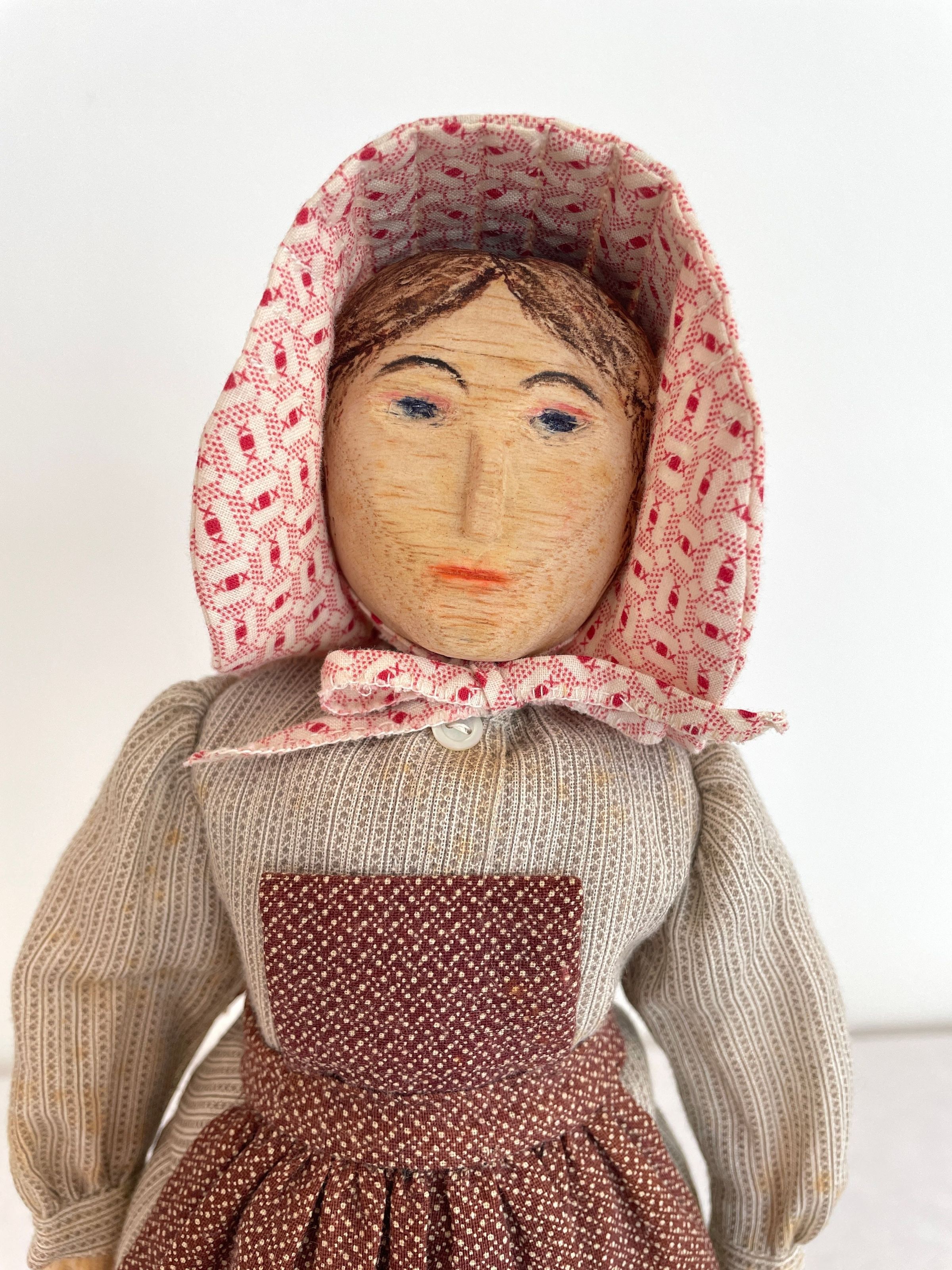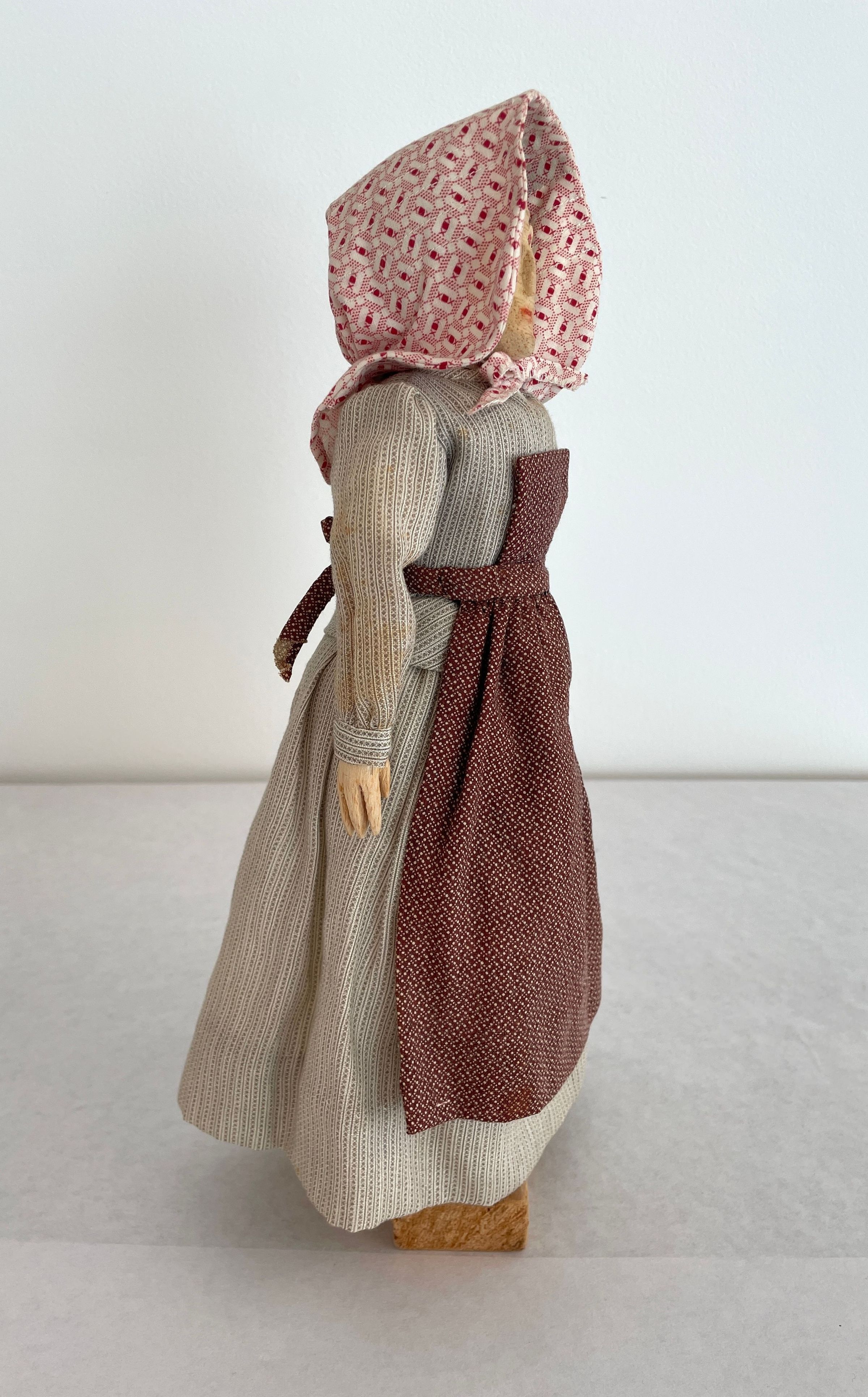 Female doll, hair and eyes painted on to carved wooden head. Head is covered with red and white sun bonnet. Wears long dress of brown print and a brown apron. Has white petticoat and pantaloons stitched in red.Collection