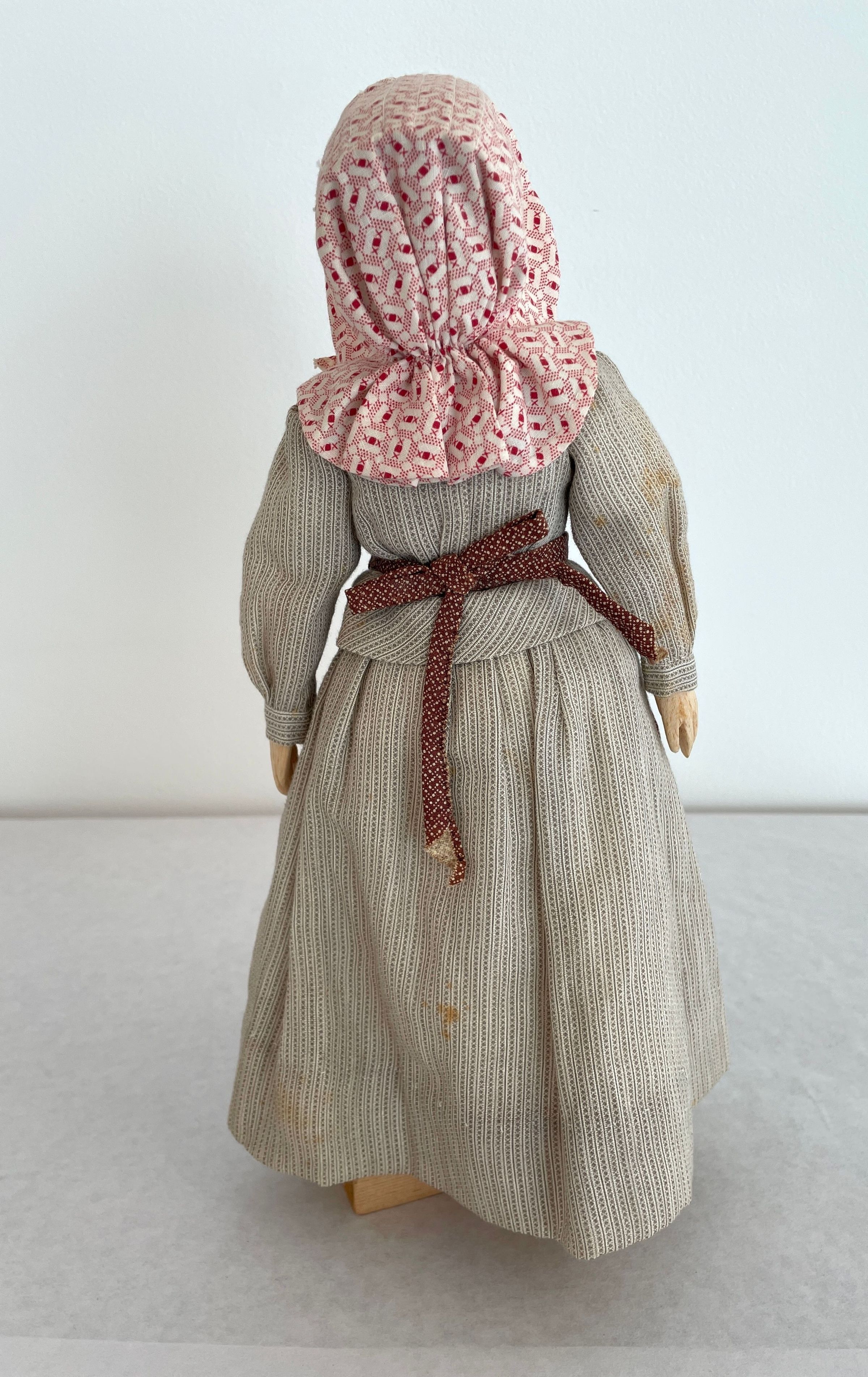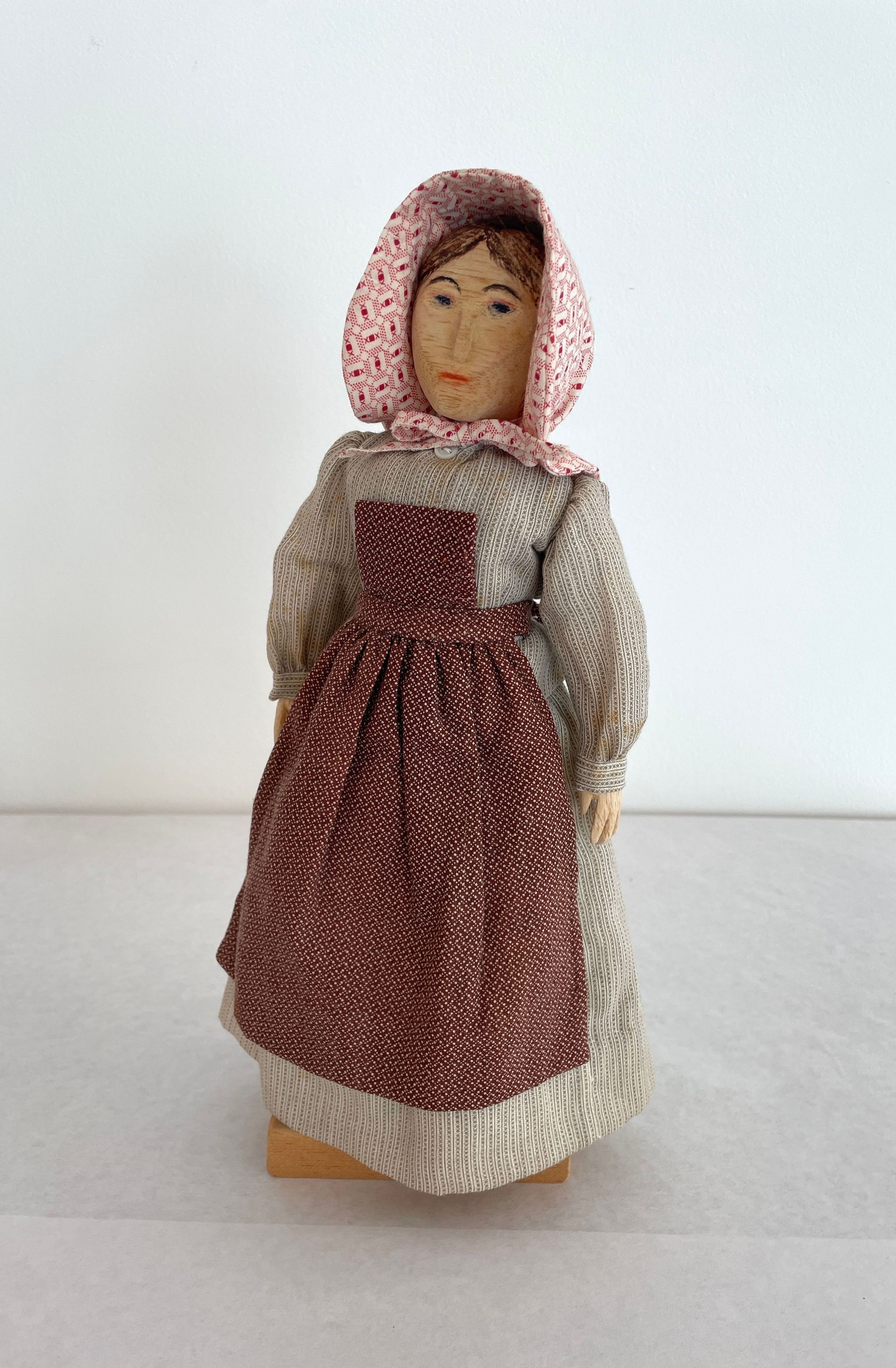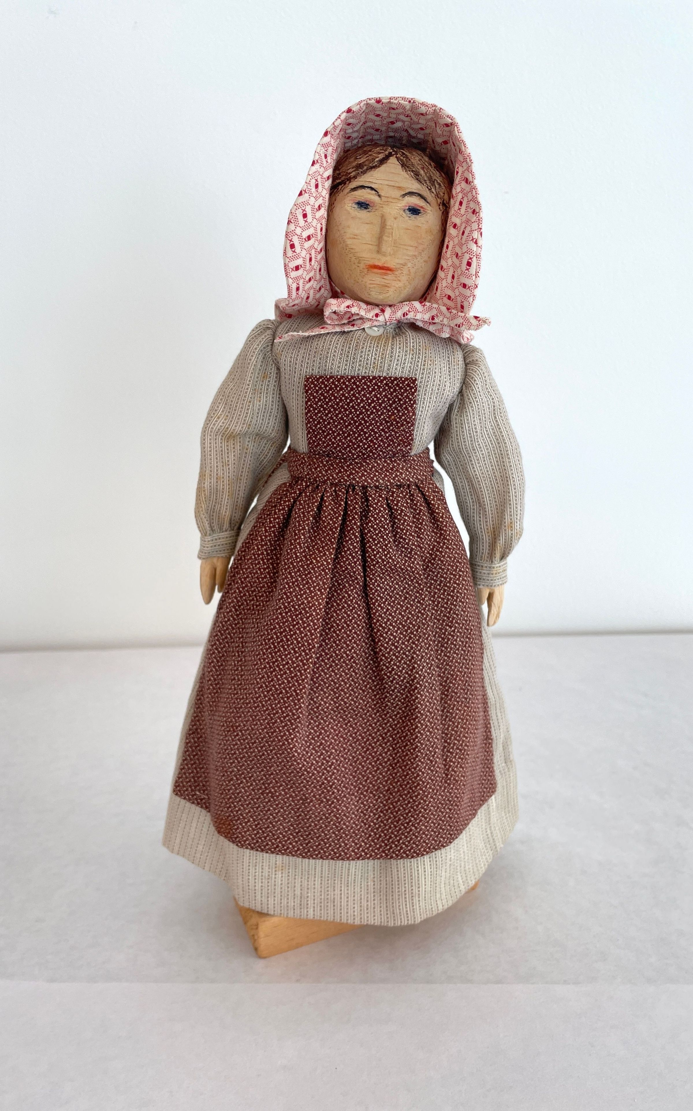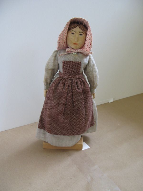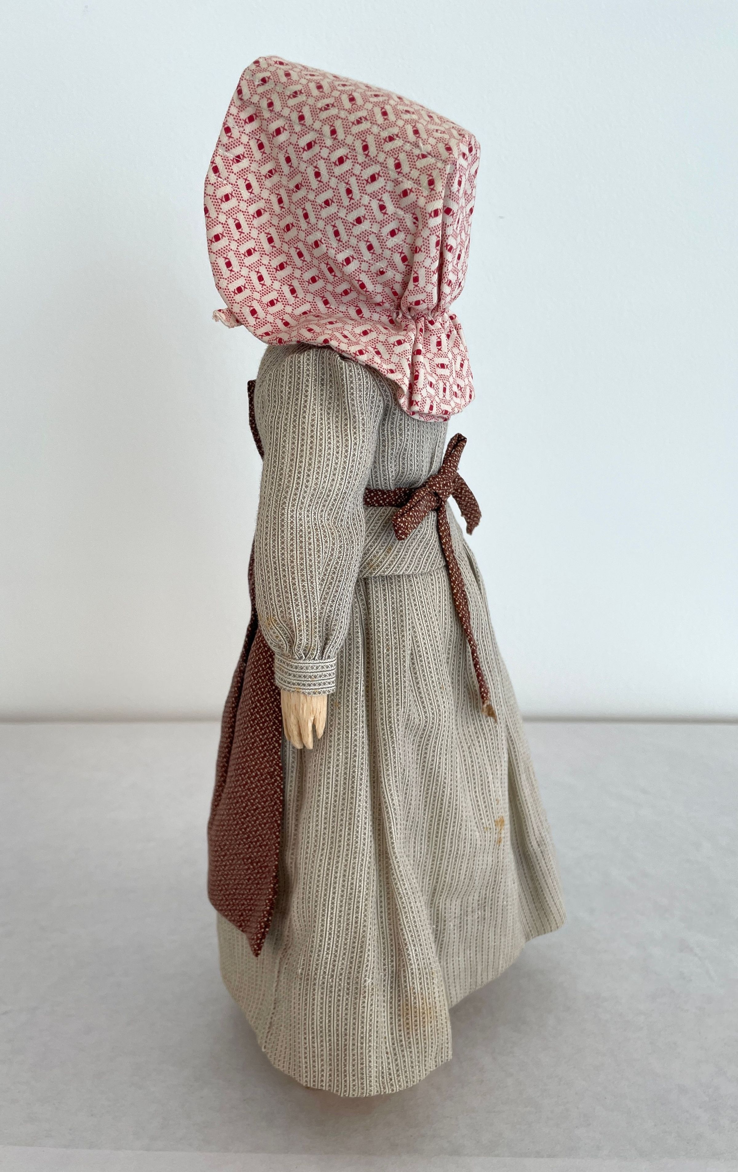 Female doll, hair and eyes painted on to carved wooden head. Head is covered with red and white sun bonnet. Wears long dress of brown print and a brown apron. Has white petticoat and pantaloons stitched in red.Collection